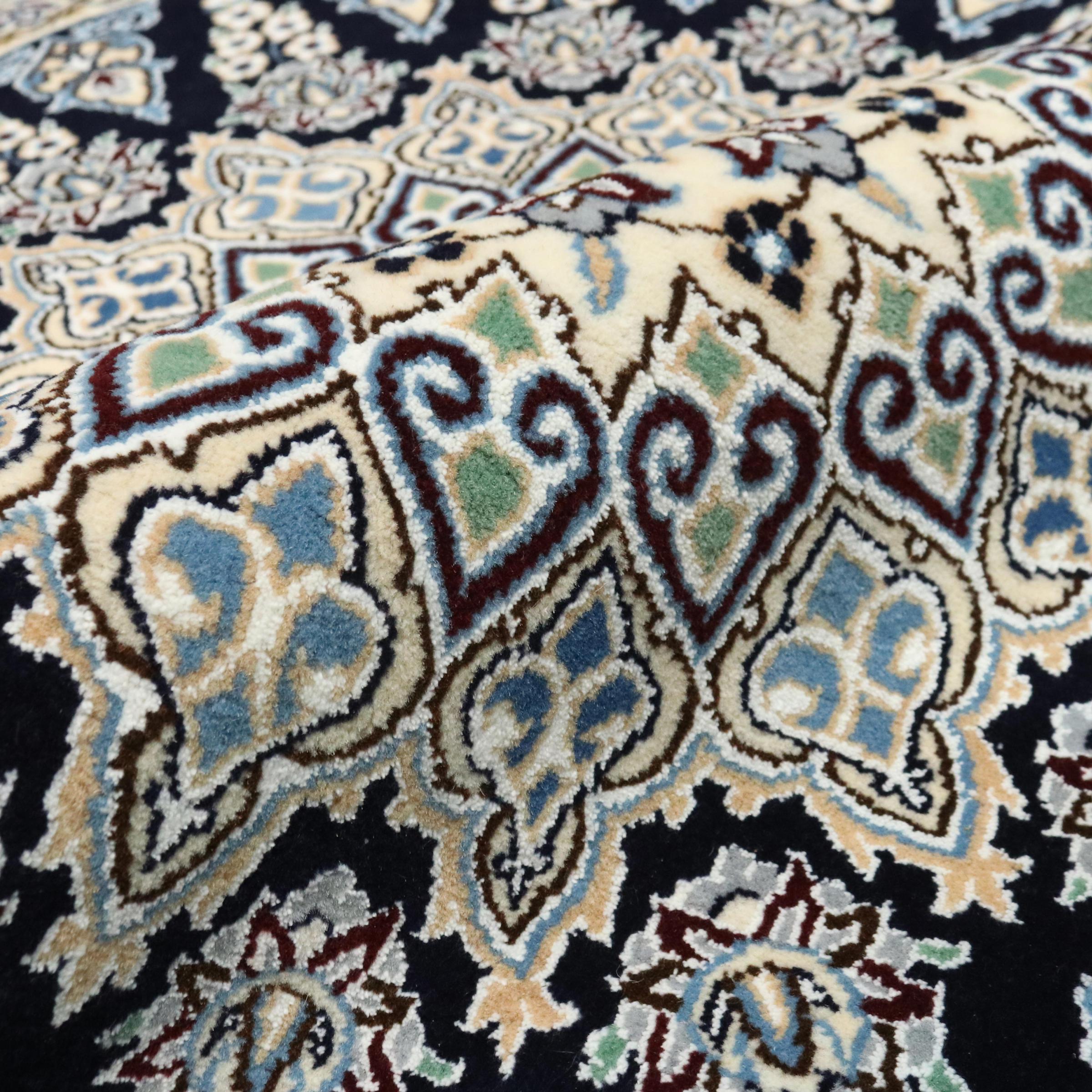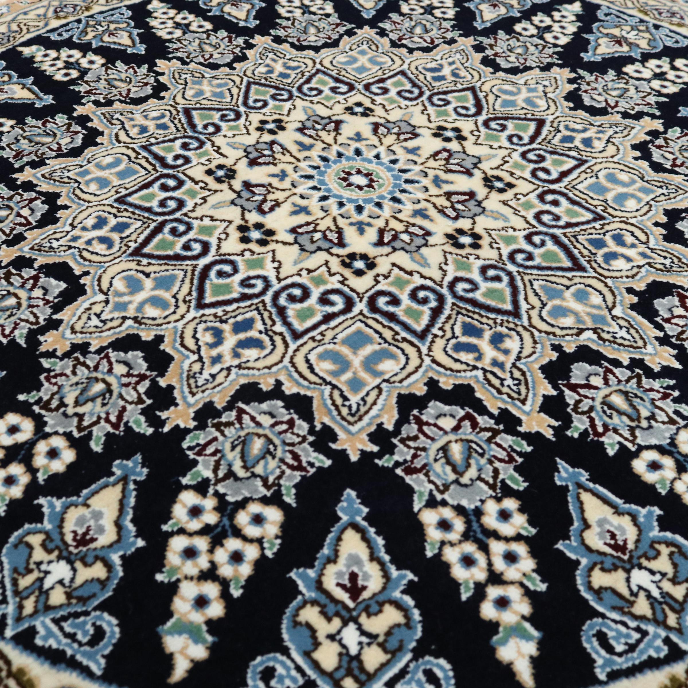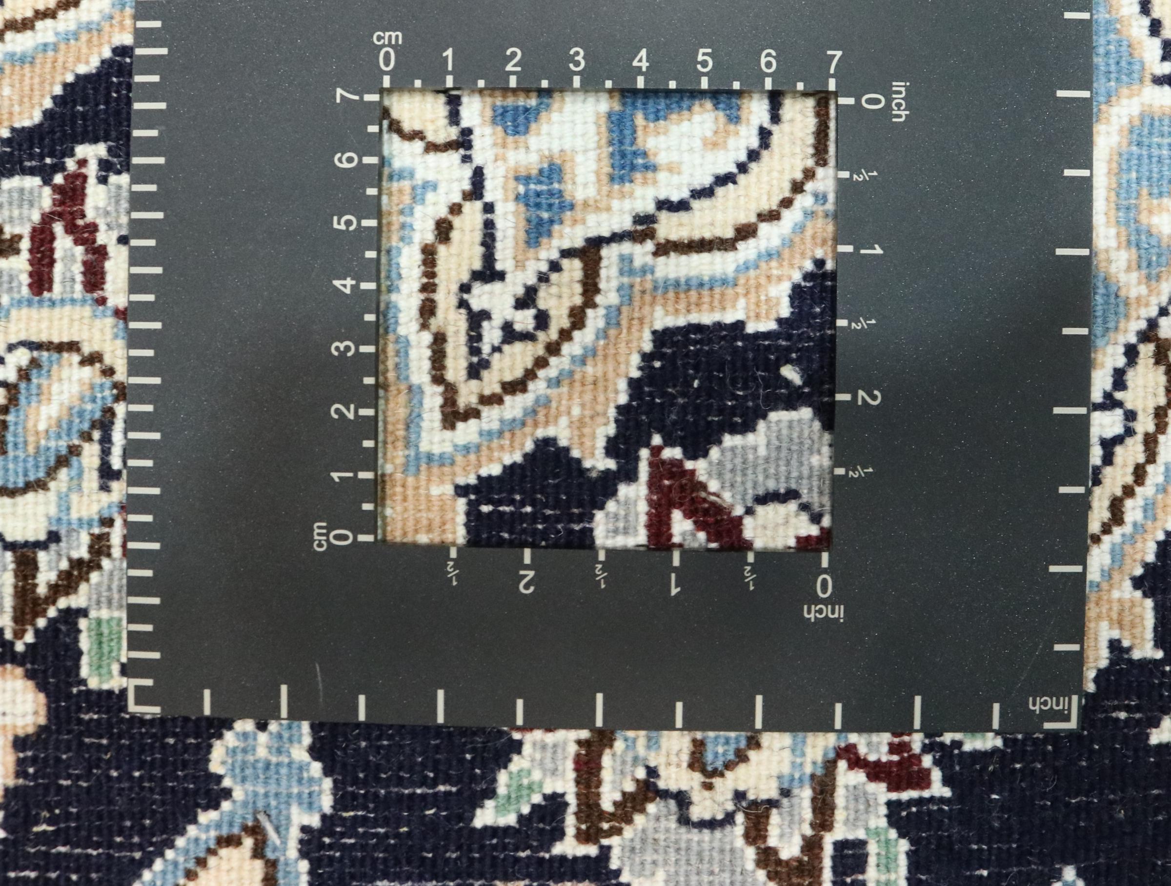 Ce tapis Nain est classifié 9La. La bonne qualité et le splendide design oriental avec ses motifs curvilignes inspirent chacun d’entre nous. Ce tapis persan était noué a la main avec de la laine précieuse et de la soie naturelle à Nain, une ville située à l’extrémité ouest du désert Dasht-e-Kavir.