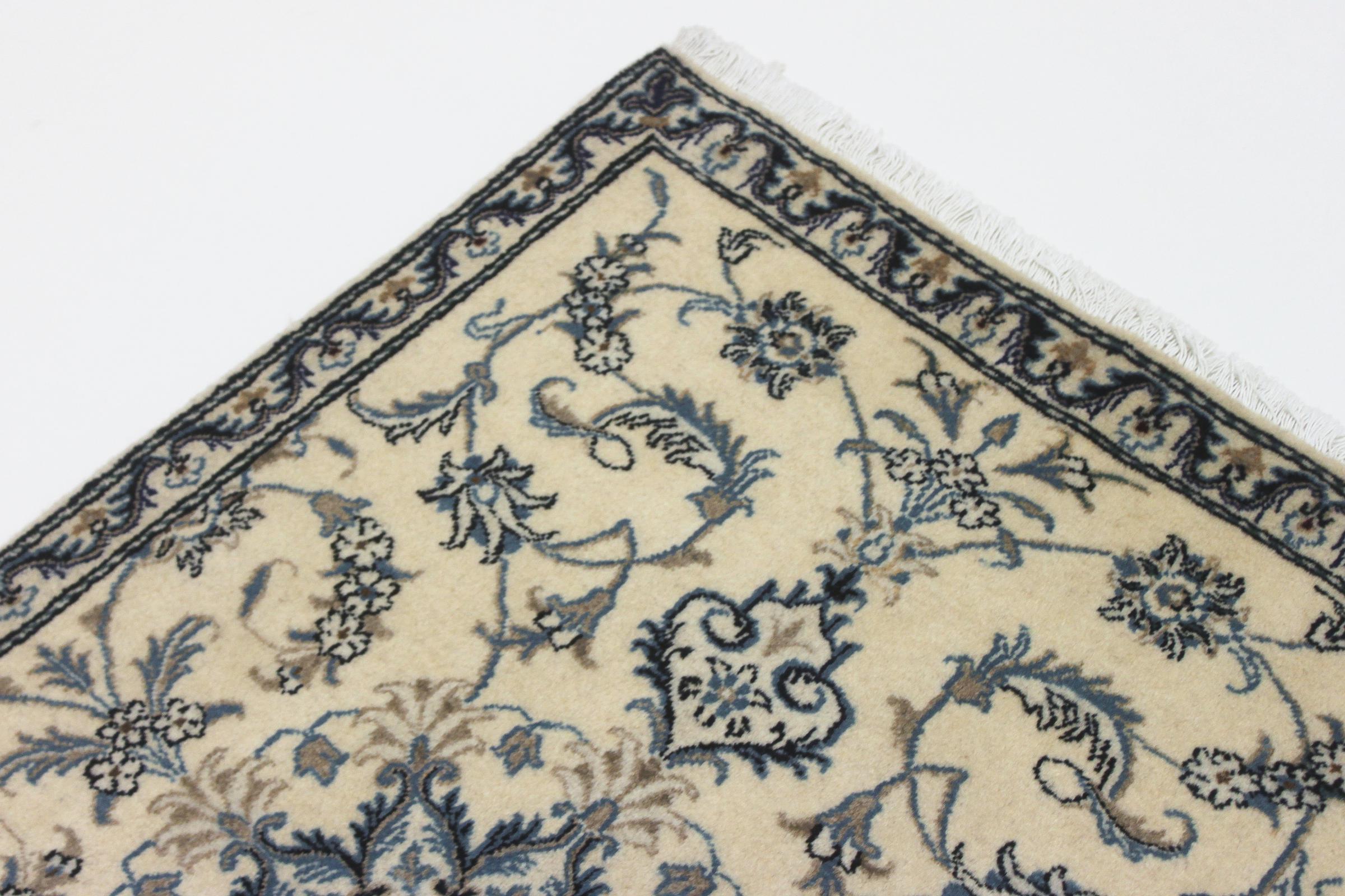 Ce tapis Nain appartient à la classe 12La. Il est élégant et précieux dans sa couleur typique des tapis Nain. Ce tapis persan a été tissé à la main dans la petite ville appelée Nain, qui réside près de la frontière ouest du désert Dascht – e – Kavir, à partir de laine de qualité supérieure et de soie naturelle.