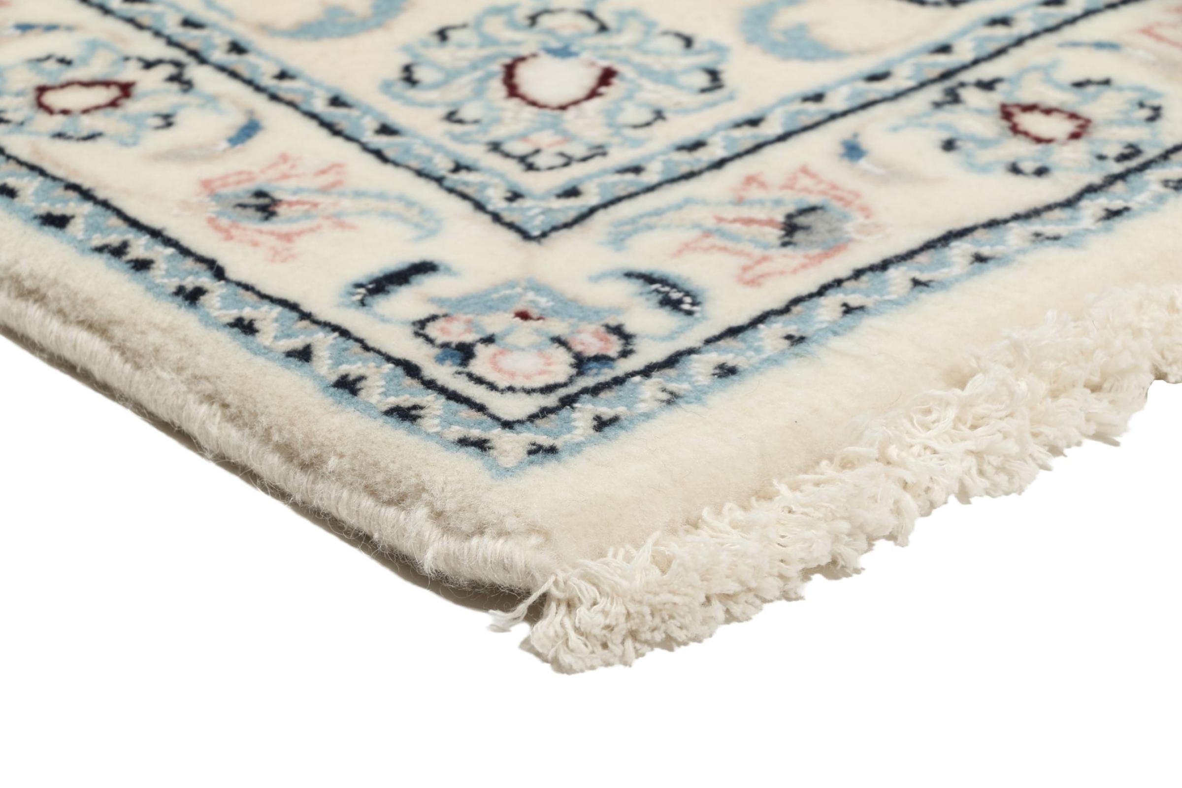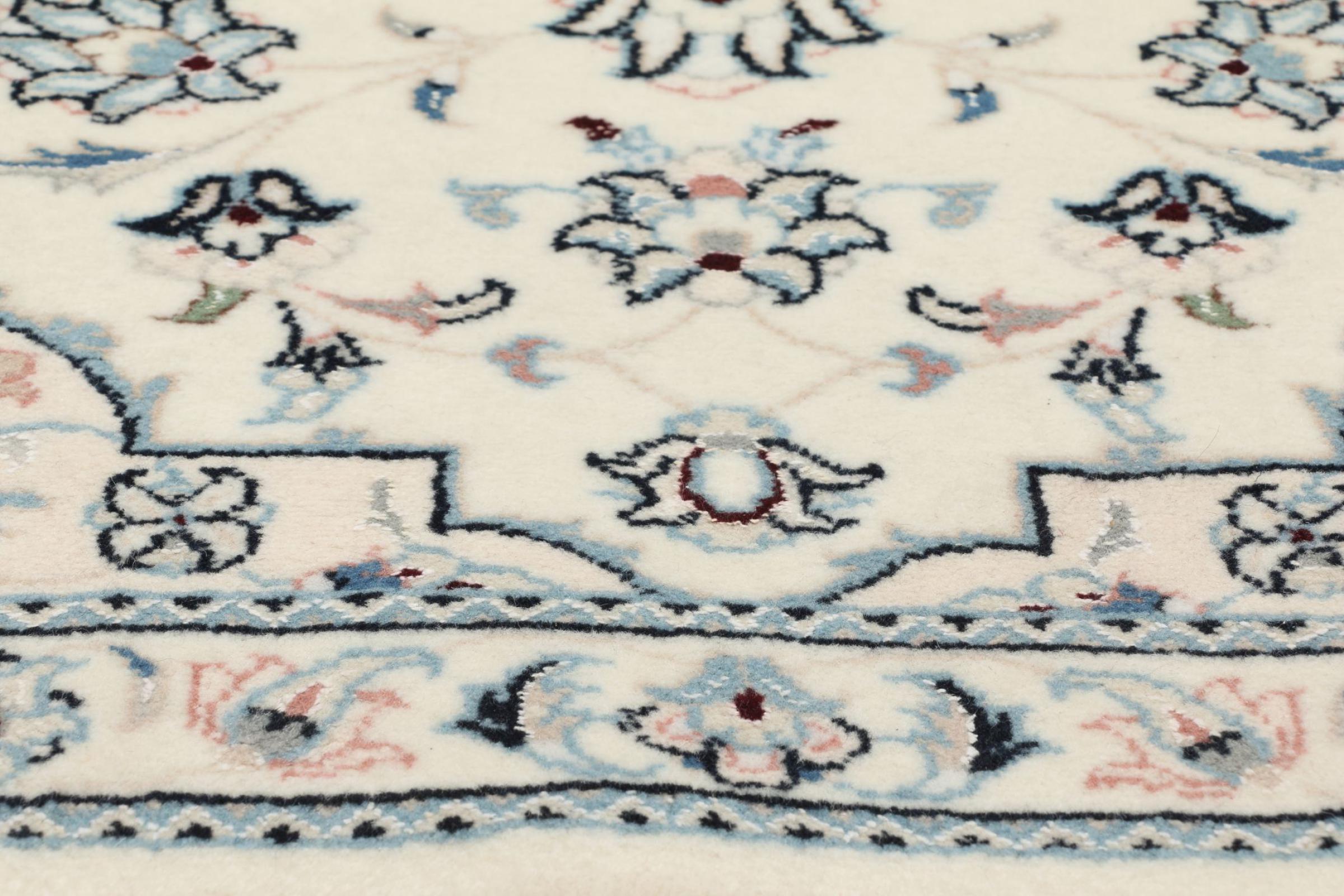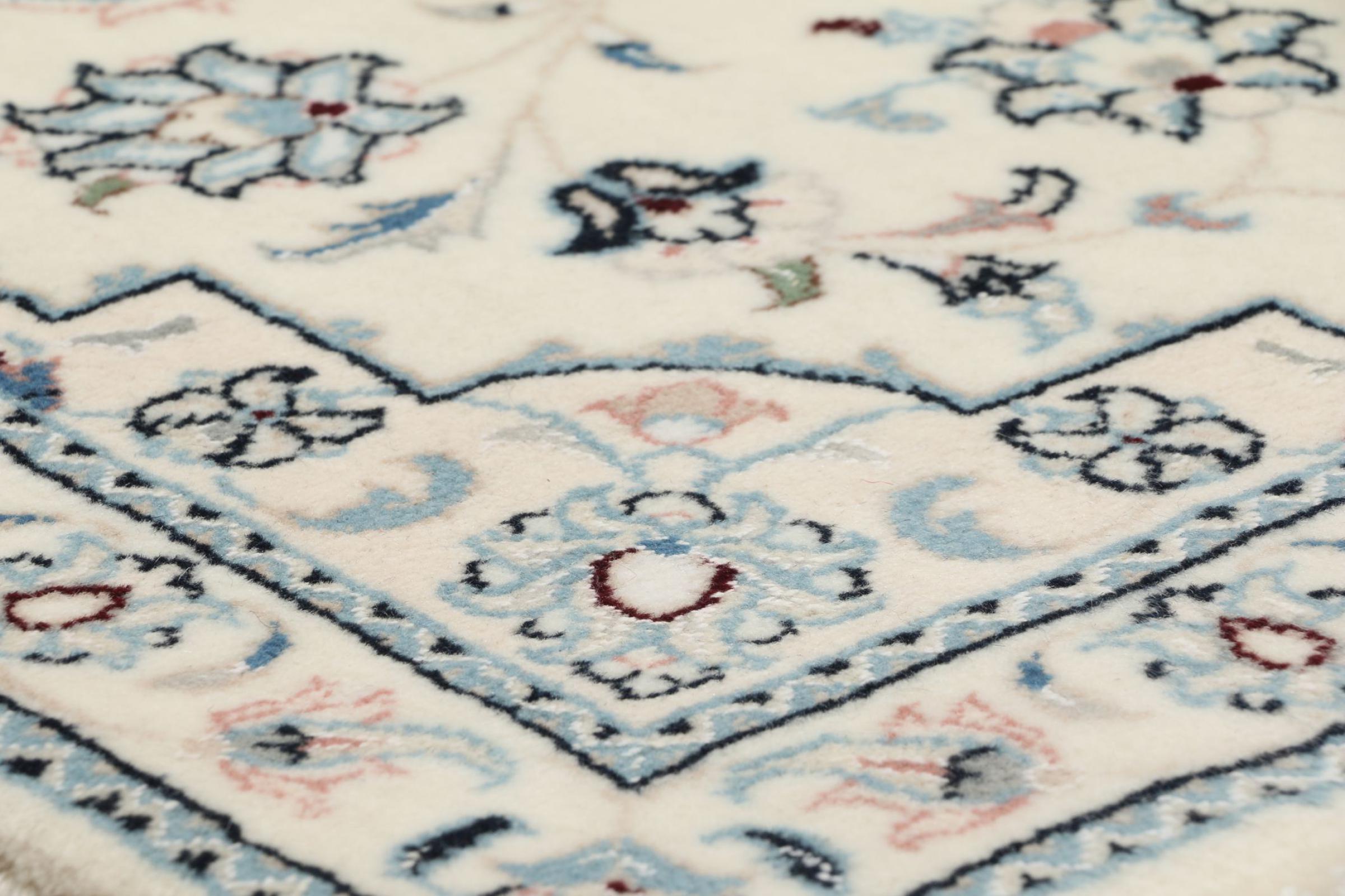 Ce tapis Nain est classifié 9La. La bonne qualité et le splendide design oriental avec ses motifs curvilignes inspirent chacun d’entre nous. Ce tapis persan était noué a la main avec de la laine précieuse et de la soie naturelle à Nain, une ville située à l’extrémité ouest du désert Dasht-e-Kavir.