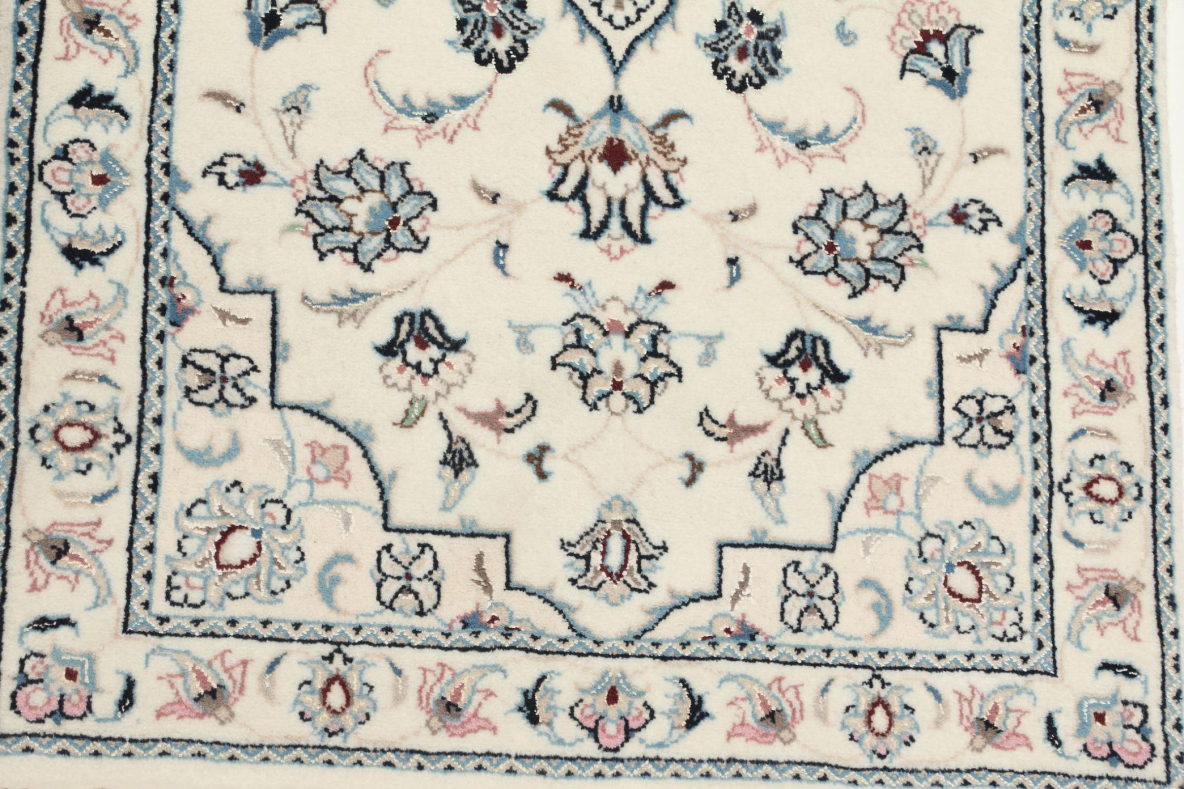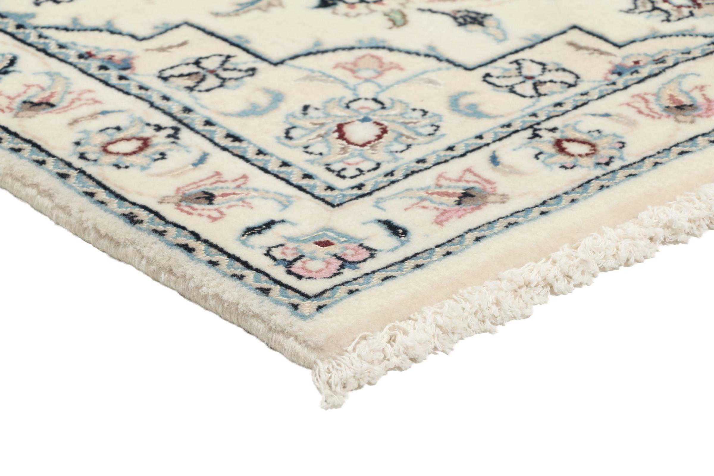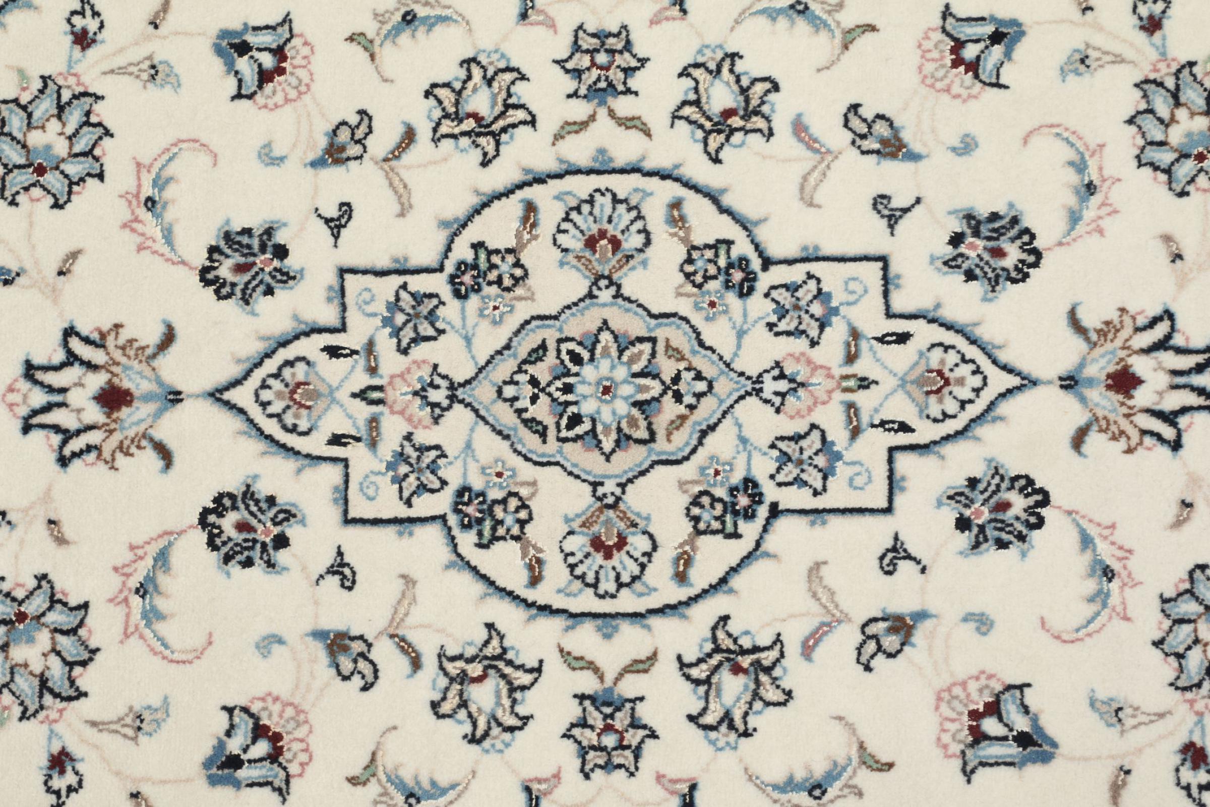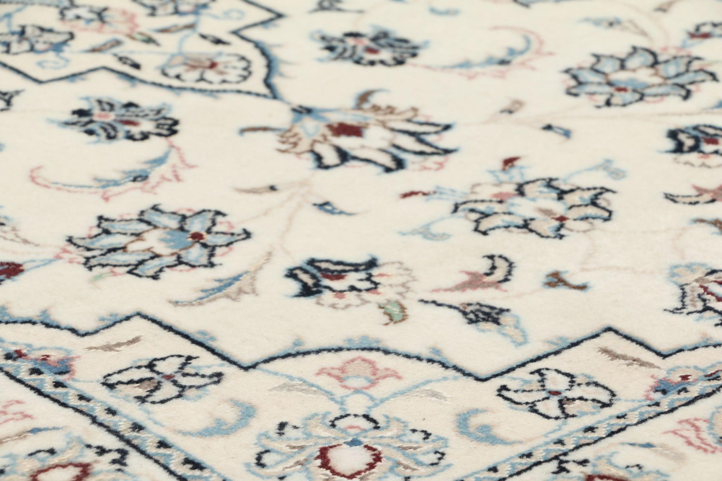 Ce tapis Nain est classifié 9La. La bonne qualité et le splendide design oriental avec ses motifs curvilignes inspirent chacun d’entre nous. Ce tapis persan était noué a la main avec de la laine précieuse et de la soie naturelle à Nain, une ville située à l’extrémité ouest du désert Dasht-e-Kavir.