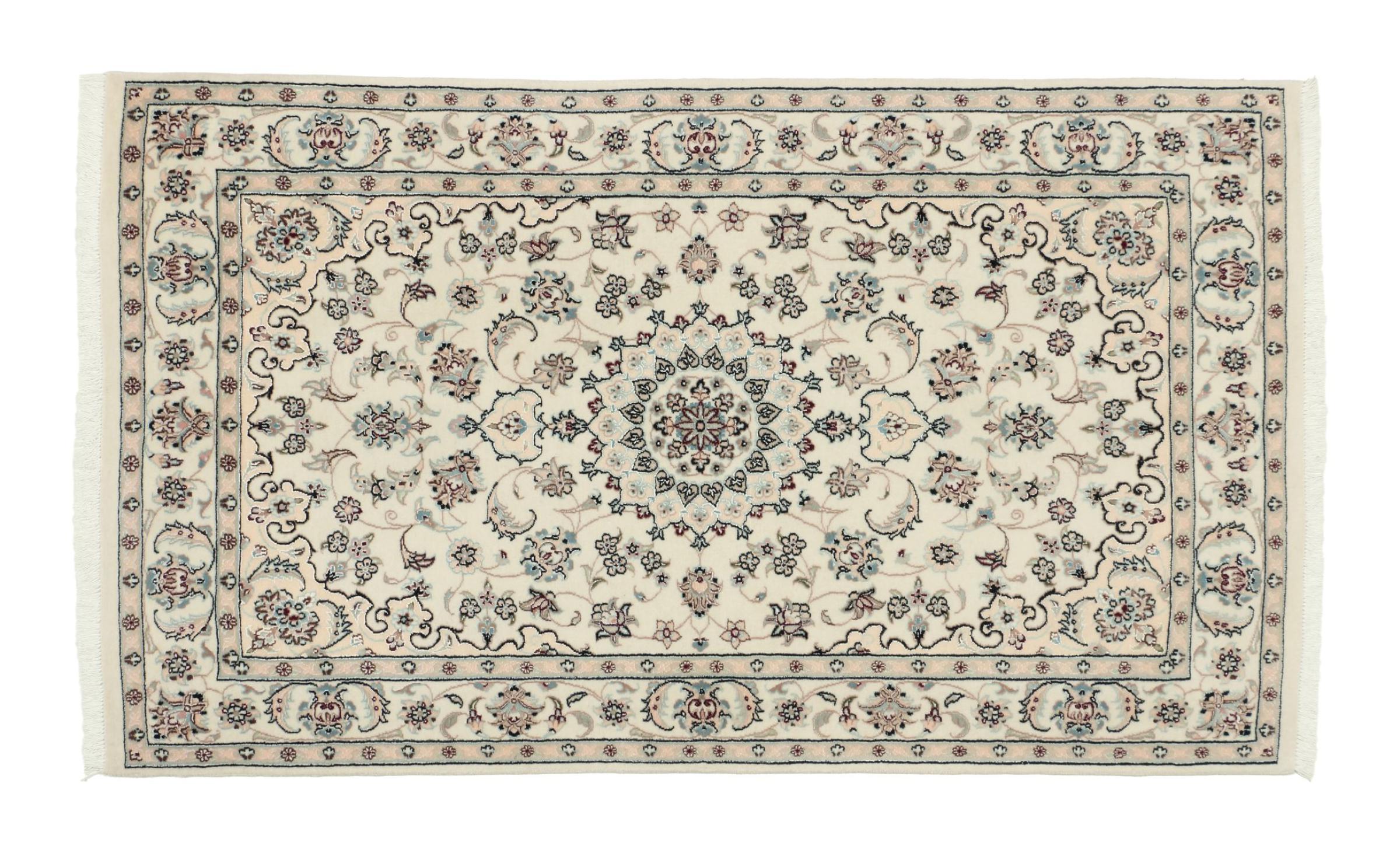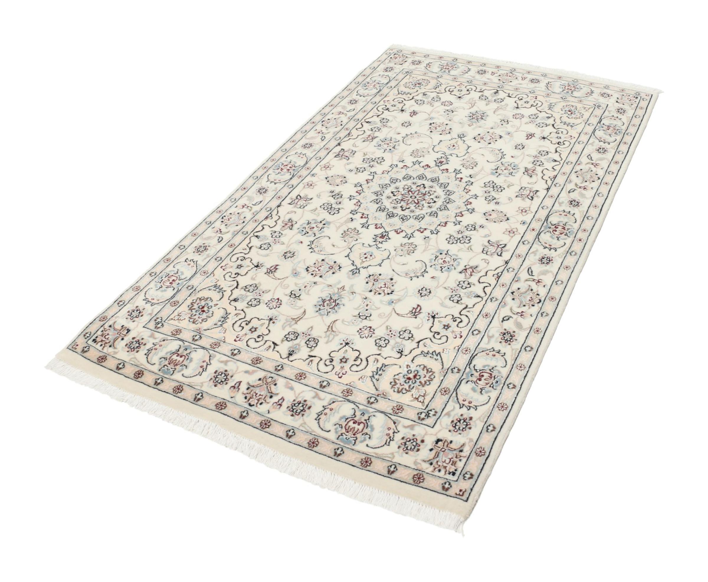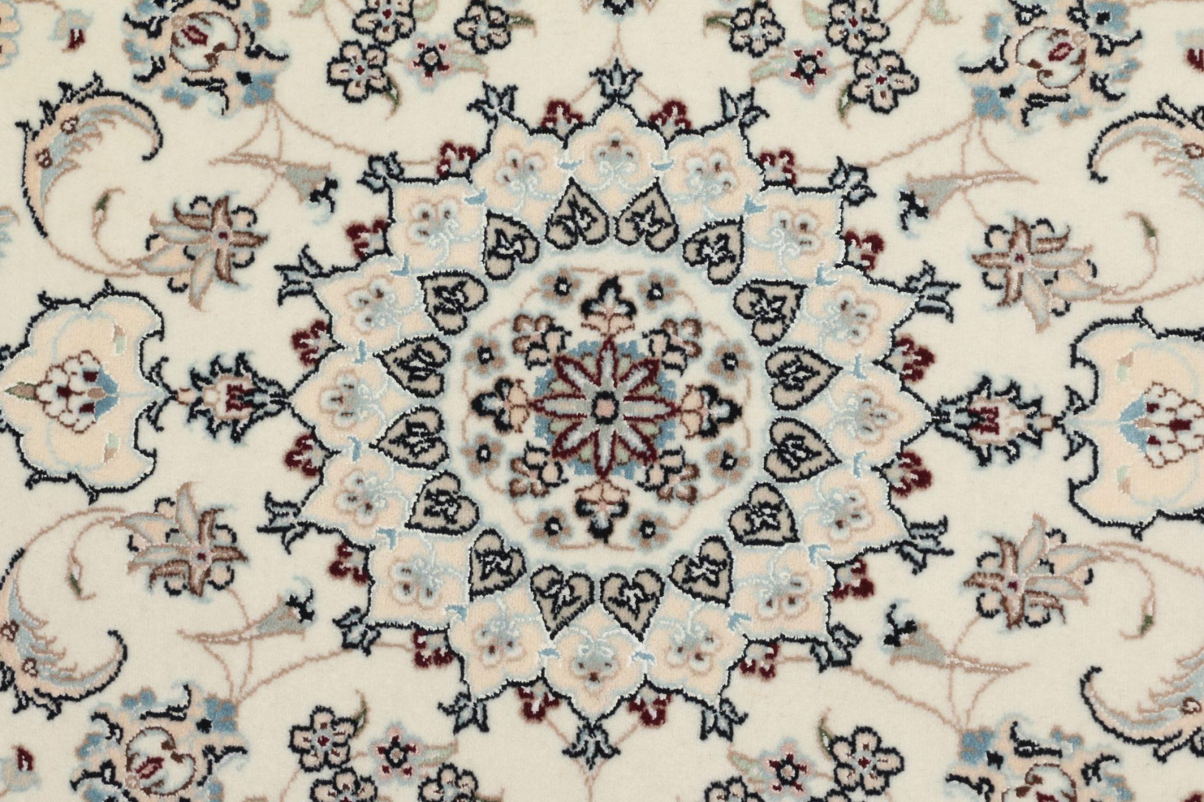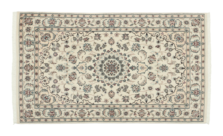 Les tapis de la ville de Nain, à la frontière de l'un des plus grands déserts d'Iran, comptent parmi les plus célèbres tapis persans du monde. Leur design typique est sans équivoque avec des ornements floraux, un médaillon central et des nuances de beige et de rouge ou de bleu. Grâce à leurs désignations 4La, 6La, 9La et 12La, les finesses d'un tapis Nain peuvent être vues d'un seul coup d'œil. Plus le chiffre "La" est bas, plus la densité des nœuds est élevée et donc plus le tapis est fin.