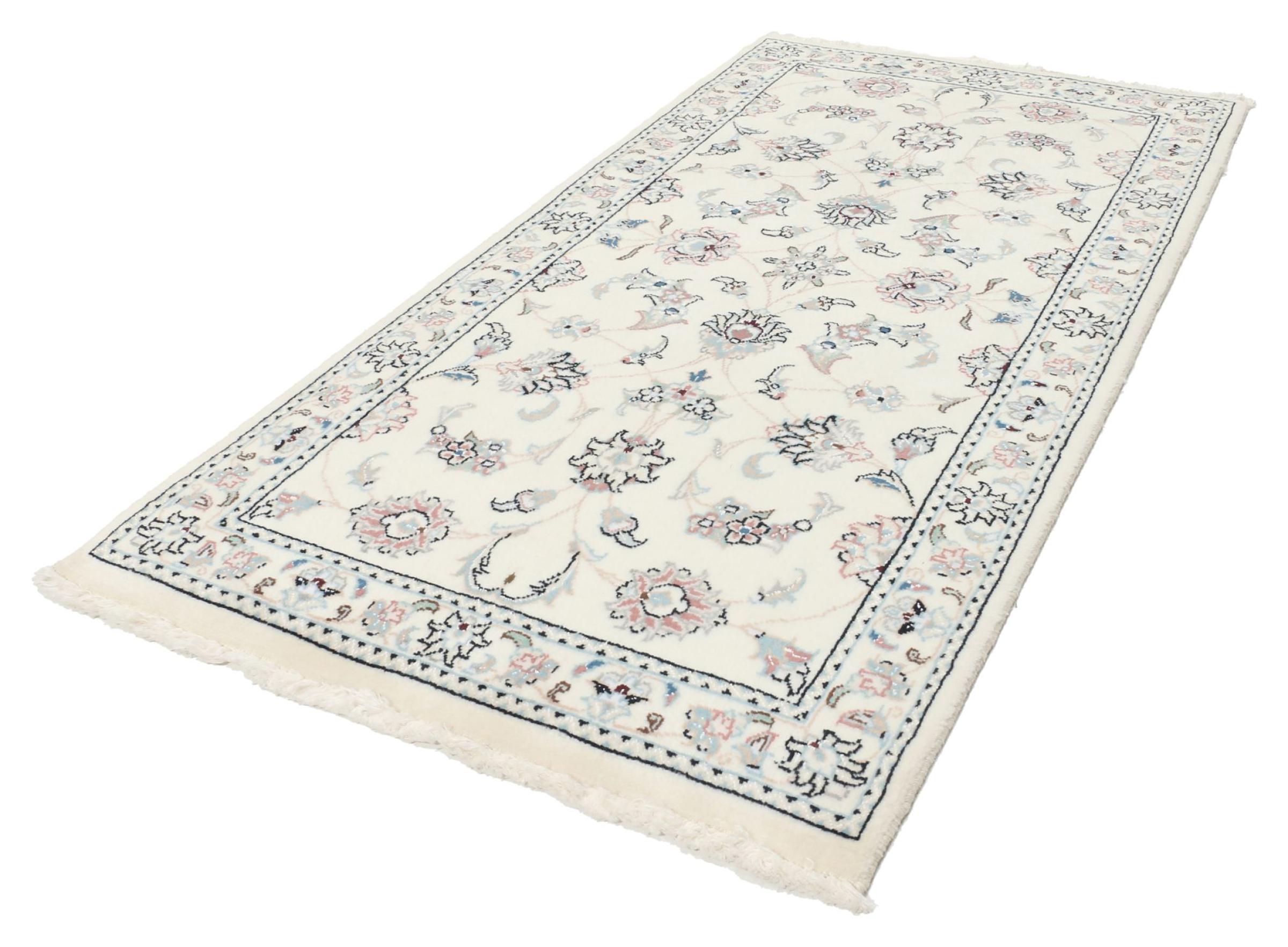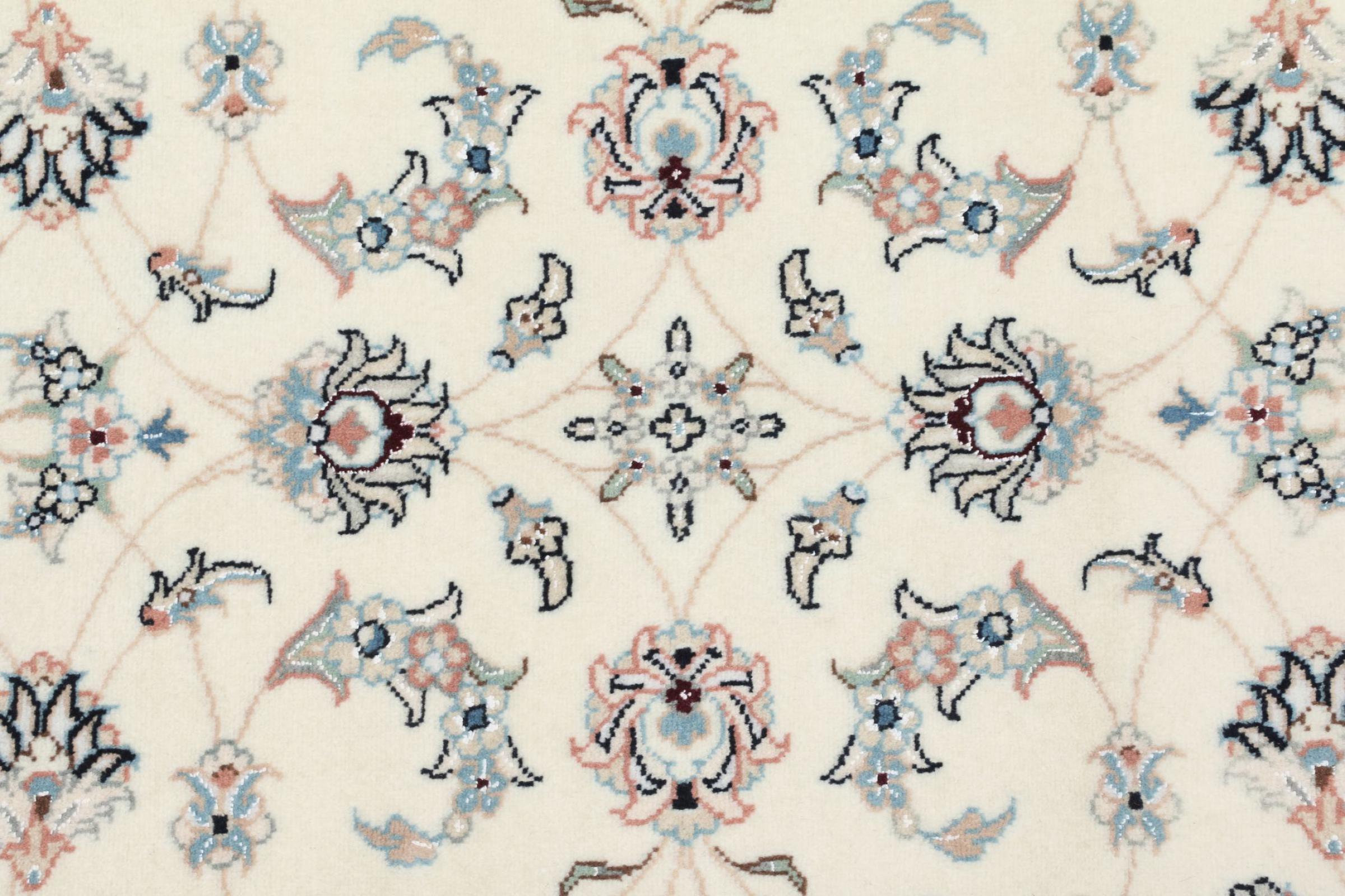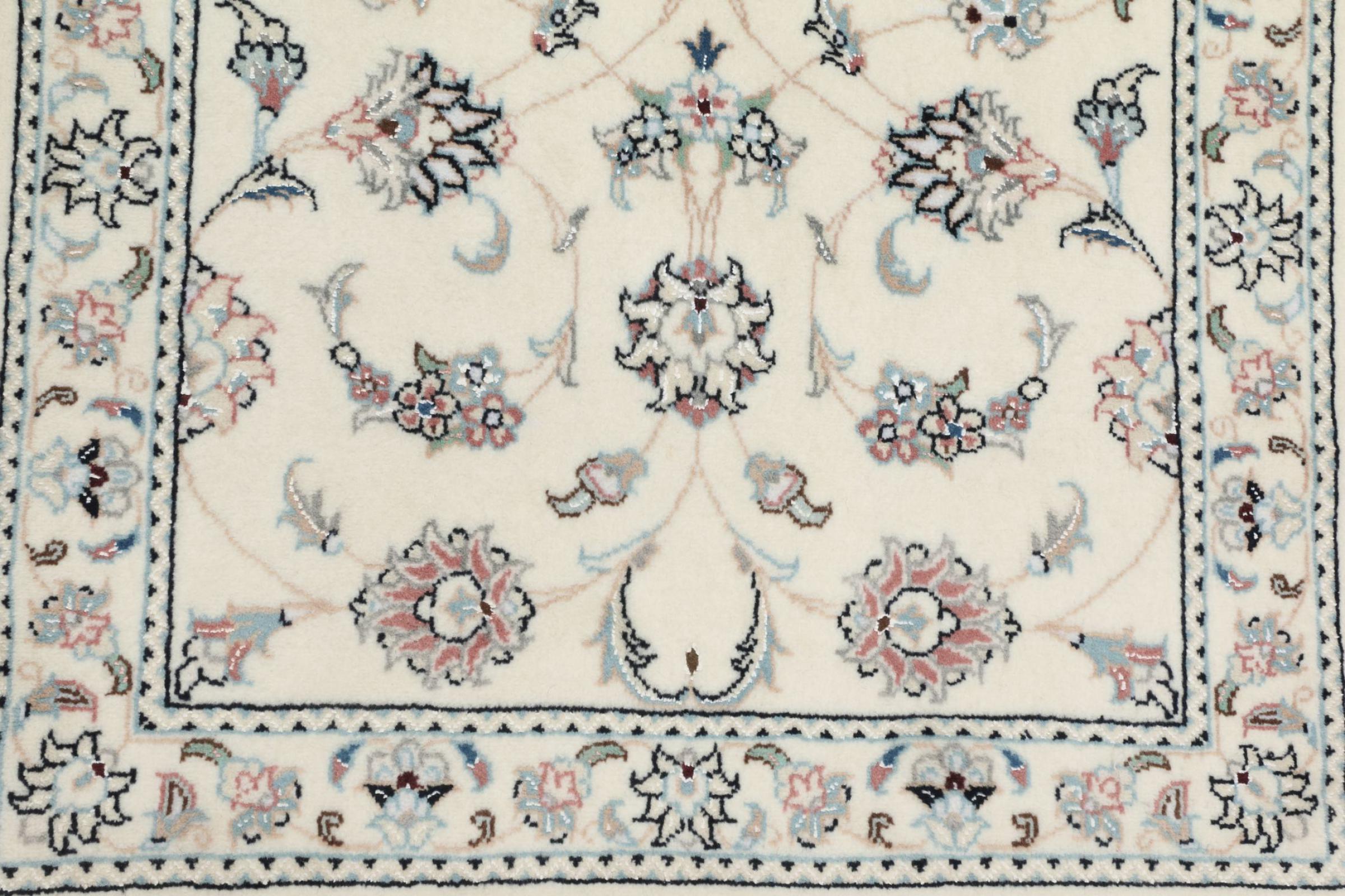 Ce tapis Nain est classifié 9La. La bonne qualité et le splendide design oriental avec ses motifs curvilignes inspirent chacun d’entre nous. Ce tapis persan était noué a la main avec de la laine précieuse et de la soie naturelle à Nain, une ville située à l’extrémité ouest du désert Dasht-e-Kavir.