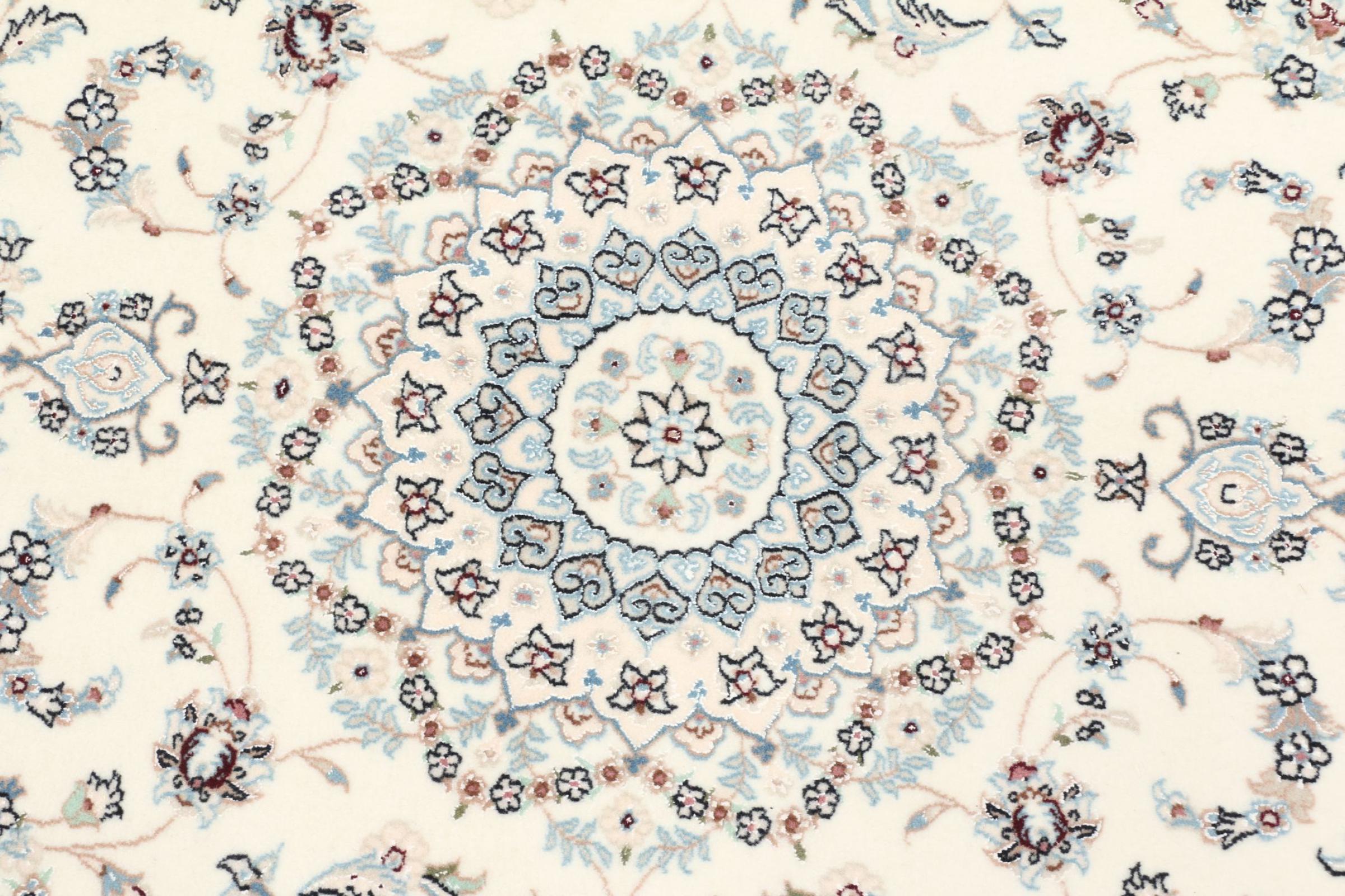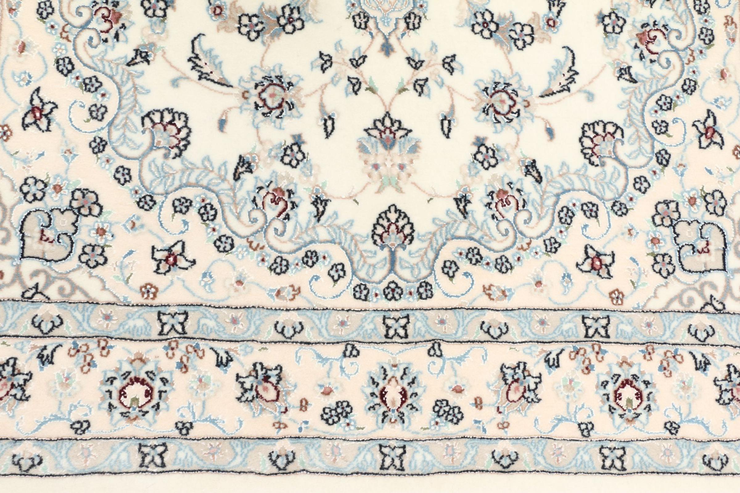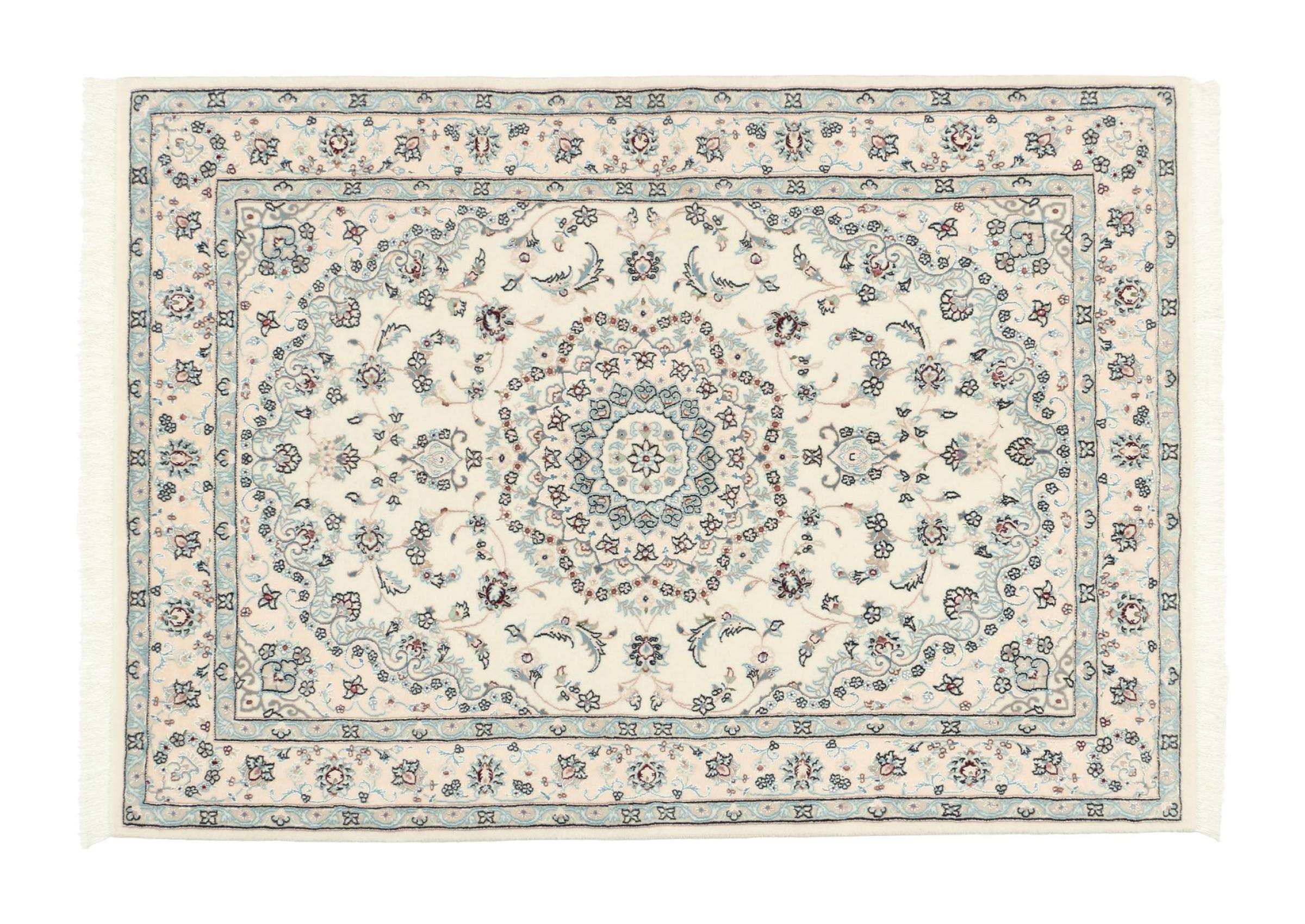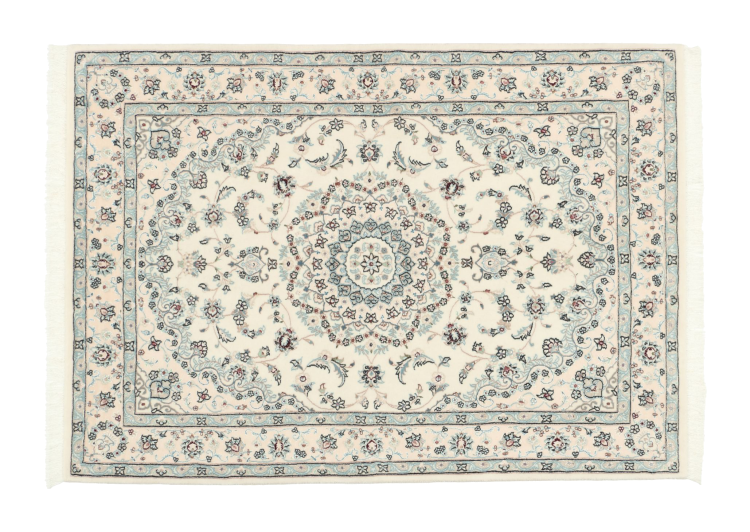 Les tapis de la ville de Nain, à la frontière de l'un des plus grands déserts d'Iran, comptent parmi les plus célèbres tapis persans du monde. Leur design typique est sans équivoque avec des ornements floraux, un médaillon central et des nuances de beige et de rouge ou de bleu. Grâce à leurs désignations 4La, 6La, 9La et 12La, les finesses d'un tapis Nain peuvent être vues d'un seul coup d'œil. Plus le chiffre "La" est bas, plus la densité des nœuds est élevée et donc plus le tapis est fin.