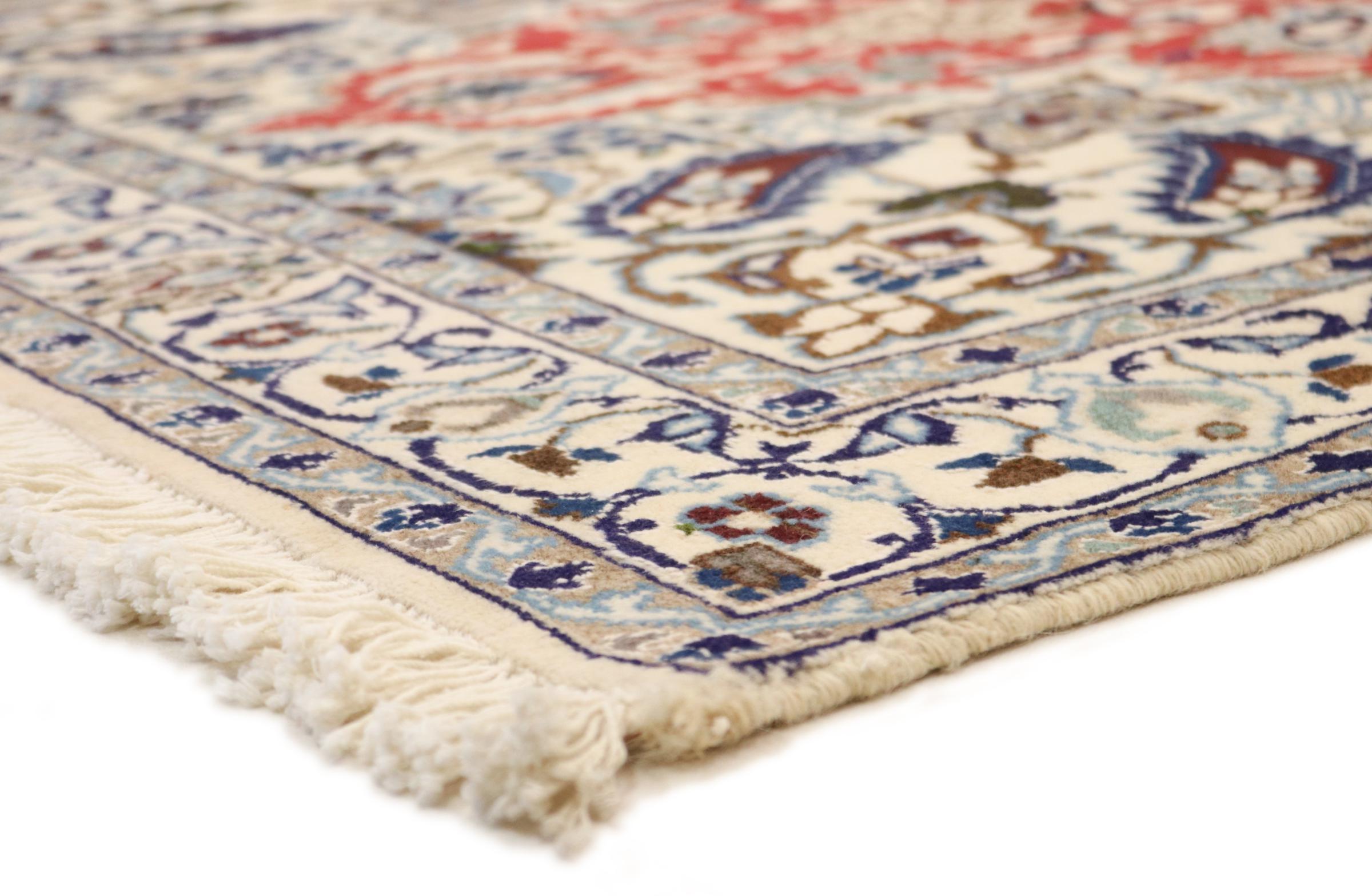 Ce tapis Nain appartient à la classe 12La. Il est élégant et précieux dans sa couleur typique des tapis Nain. Ce tapis persan a été tissé à la main dans la petite ville appelée Nain, qui réside près de la frontière ouest du désert Dascht – e – Kavir, à partir de laine de qualité supérieure et de soie naturelle.