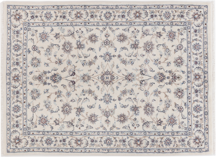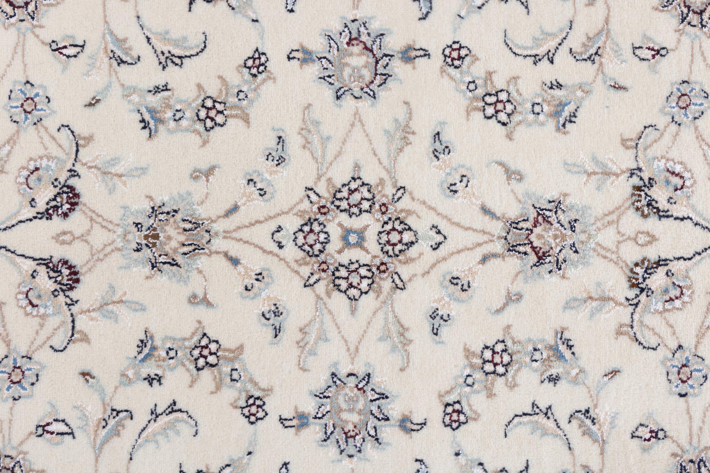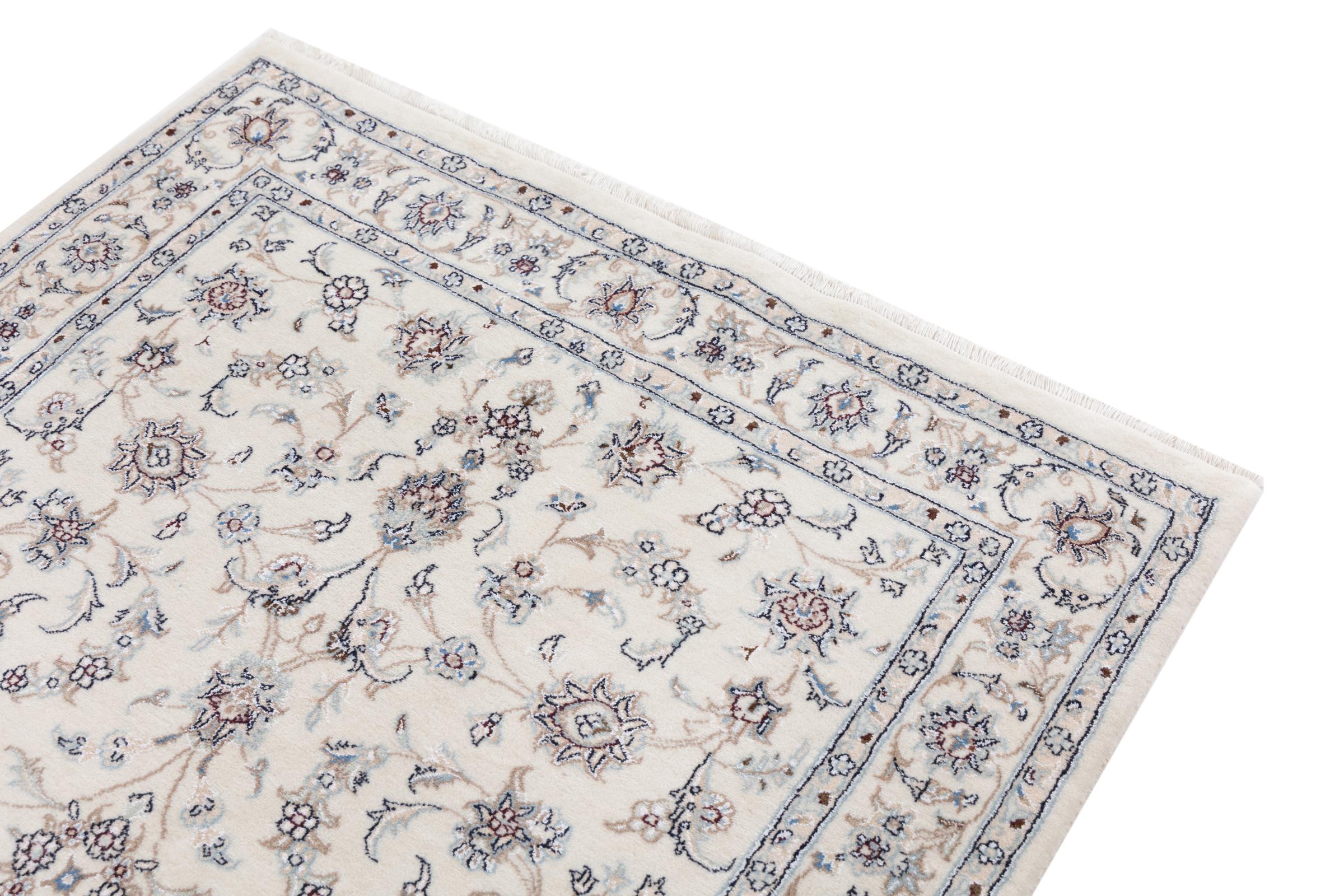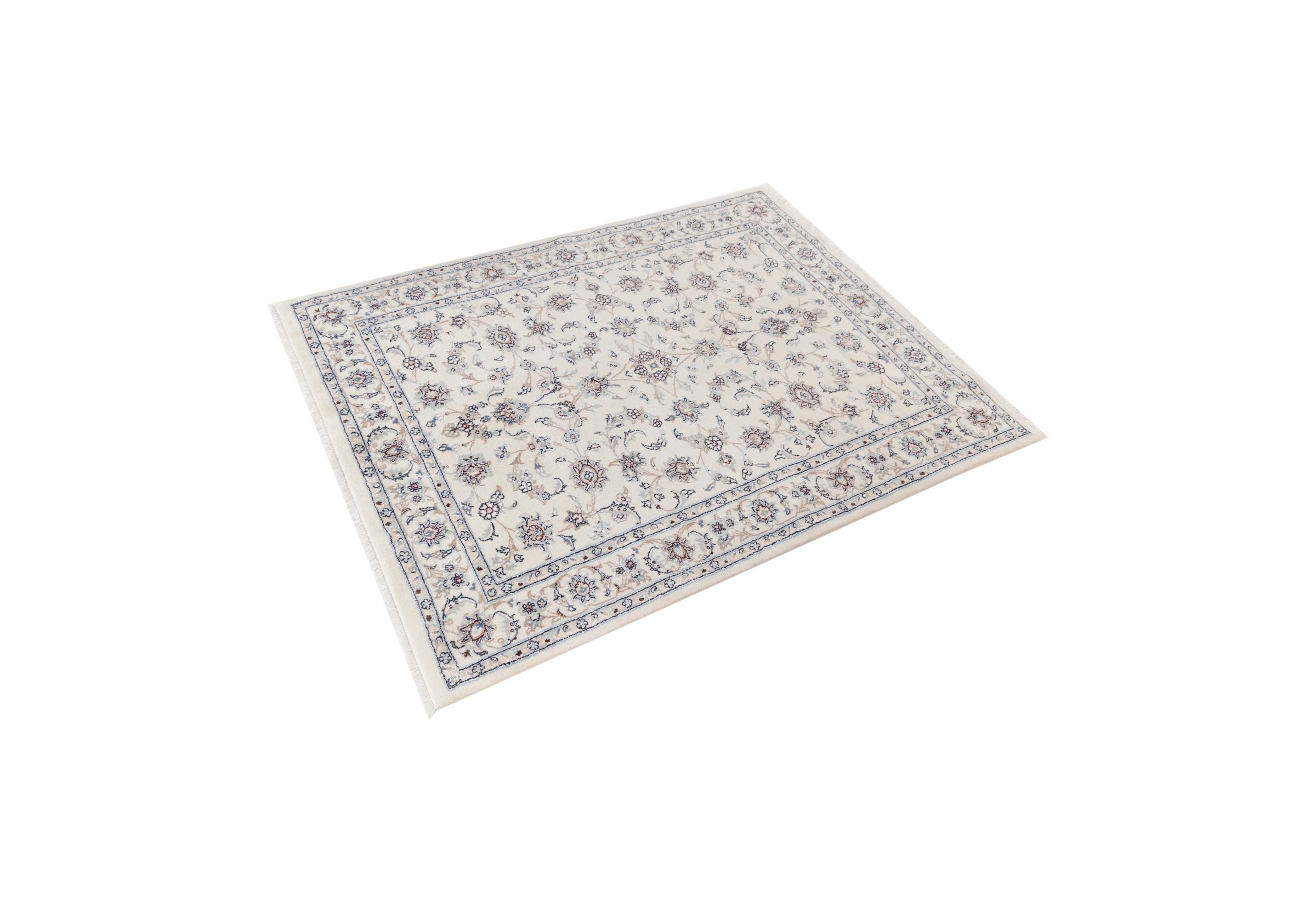 Ce tapis Nain est classifié 9La. La bonne qualité et le splendide design oriental avec ses motifs curvilignes inspirent chacun d’entre nous. Ce tapis persan était noué a la main avec de la laine précieuse et de la soie naturelle à Nain, une ville située à l’extrémité ouest du désert Dasht-e-Kavir.