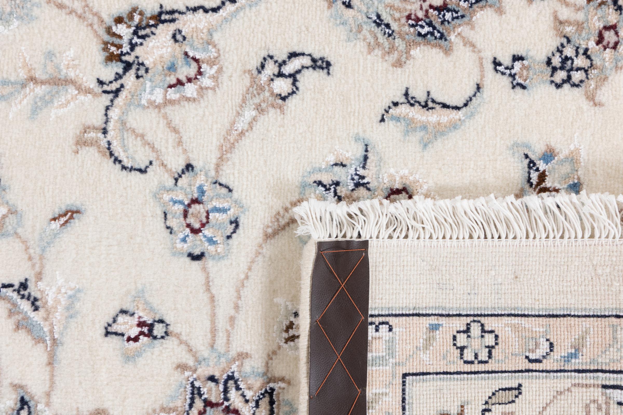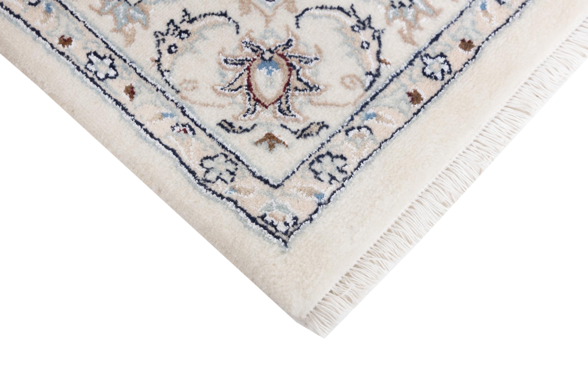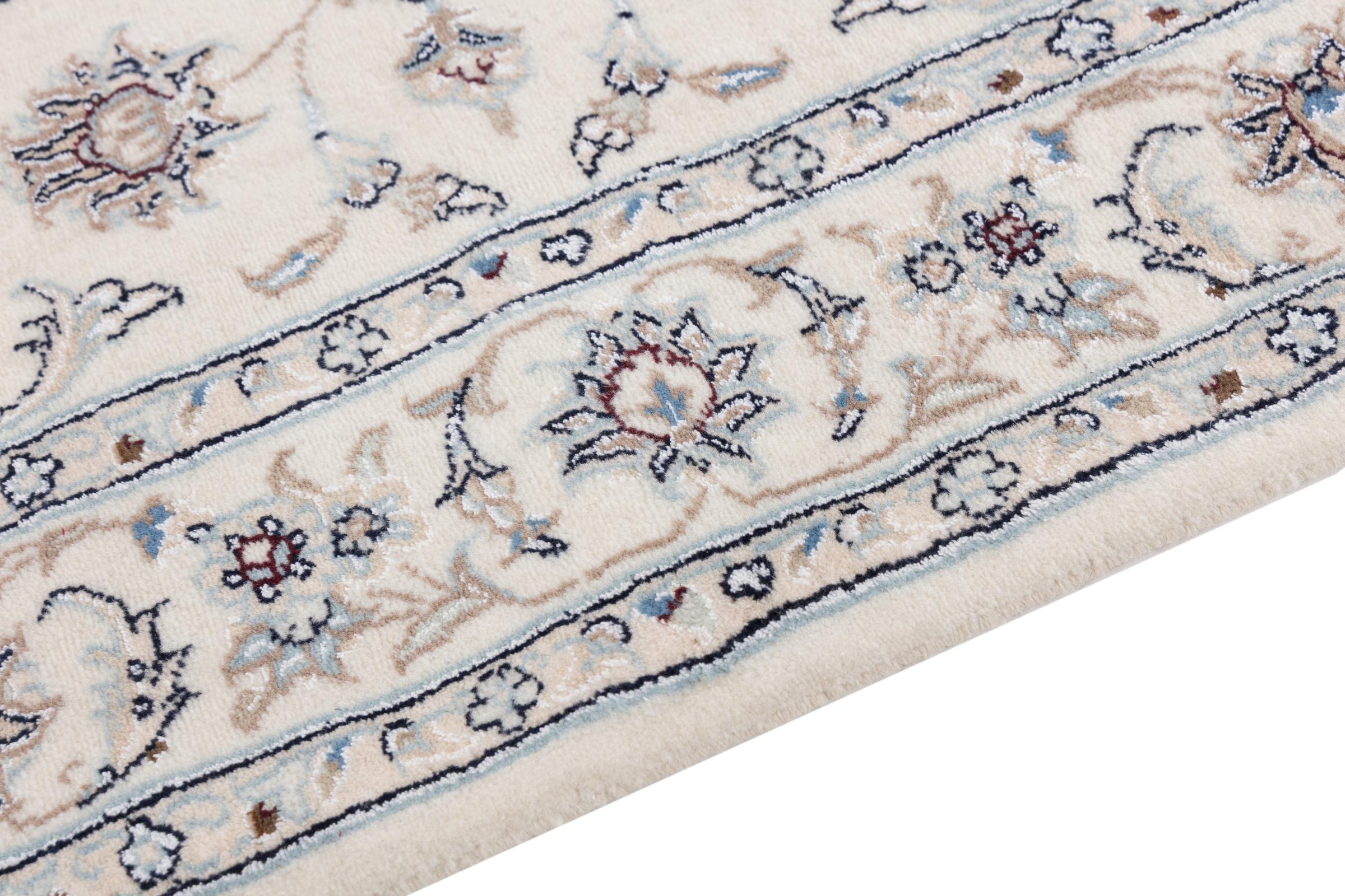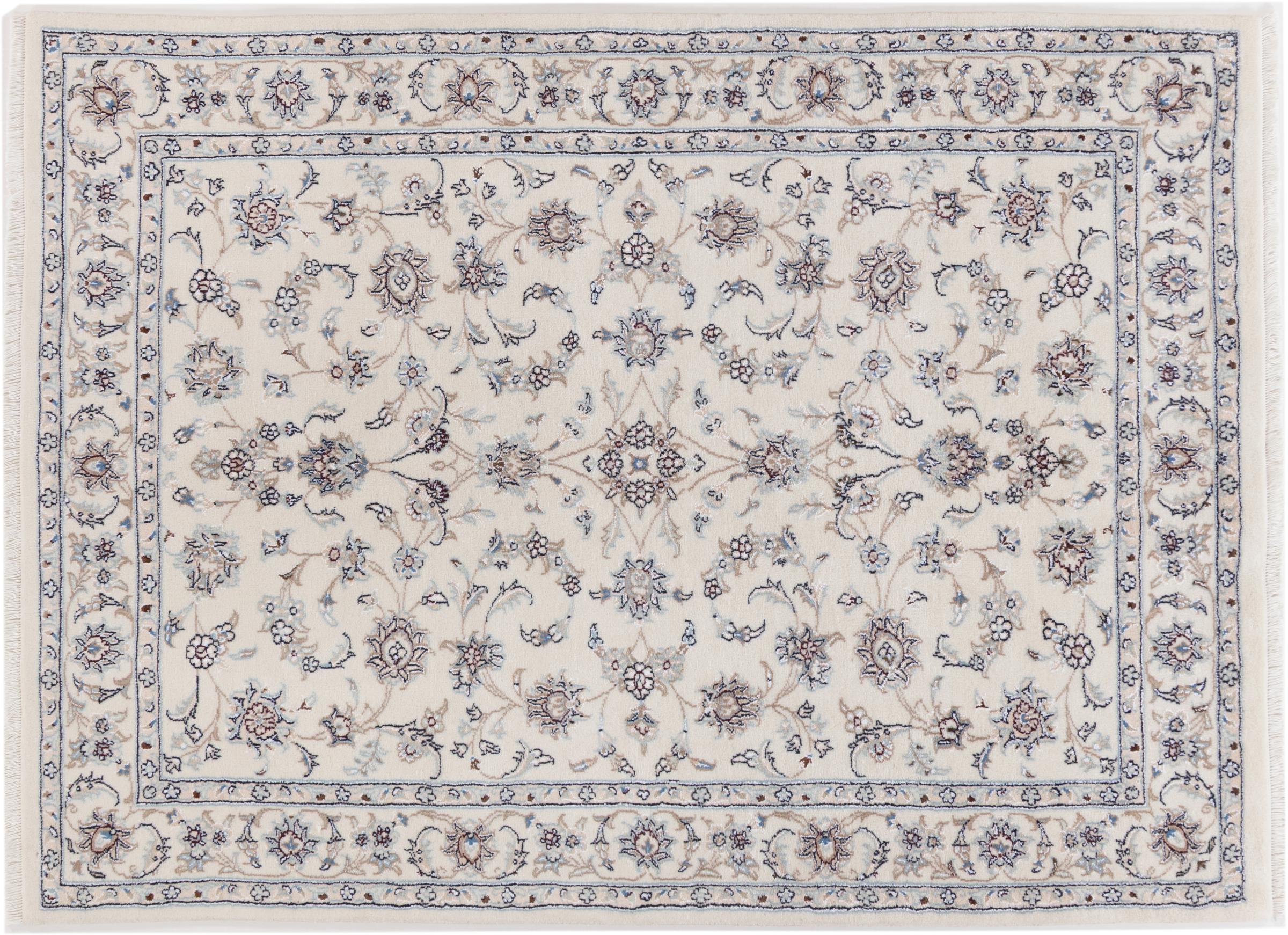 Ce tapis Nain est classifié 9La. La bonne qualité et le splendide design oriental avec ses motifs curvilignes inspirent chacun d’entre nous. Ce tapis persan était noué a la main avec de la laine précieuse et de la soie naturelle à Nain, une ville située à l’extrémité ouest du désert Dasht-e-Kavir.