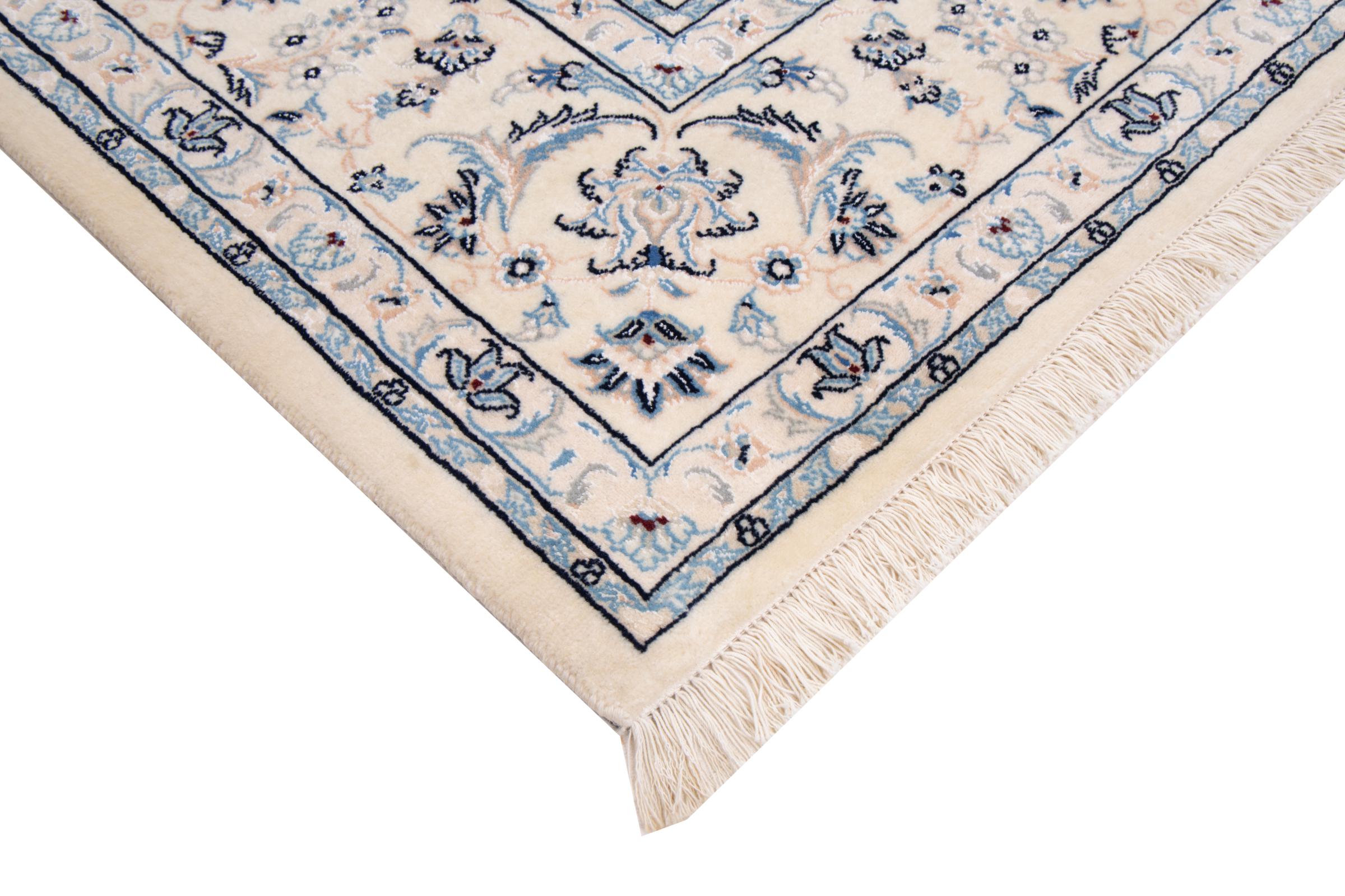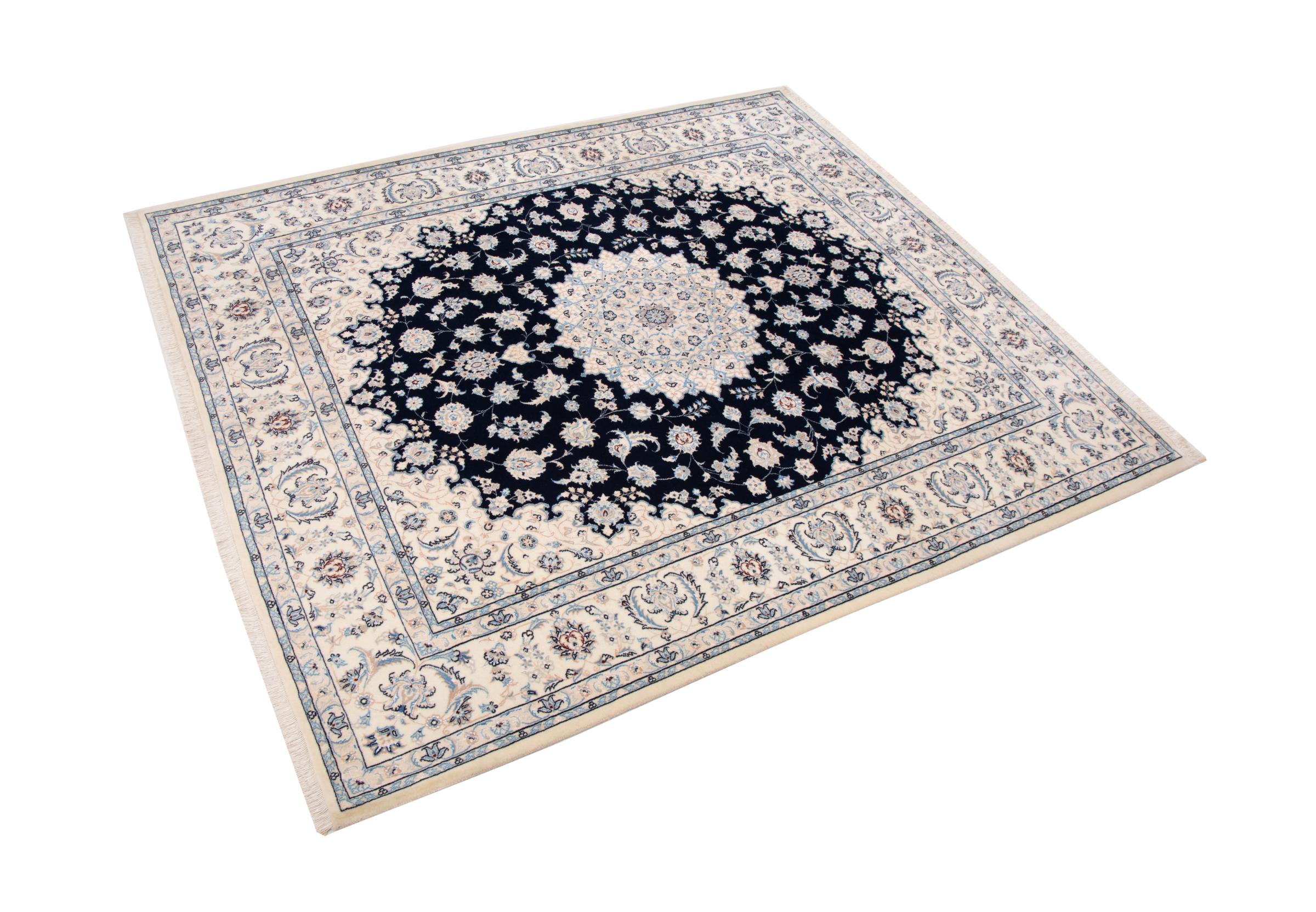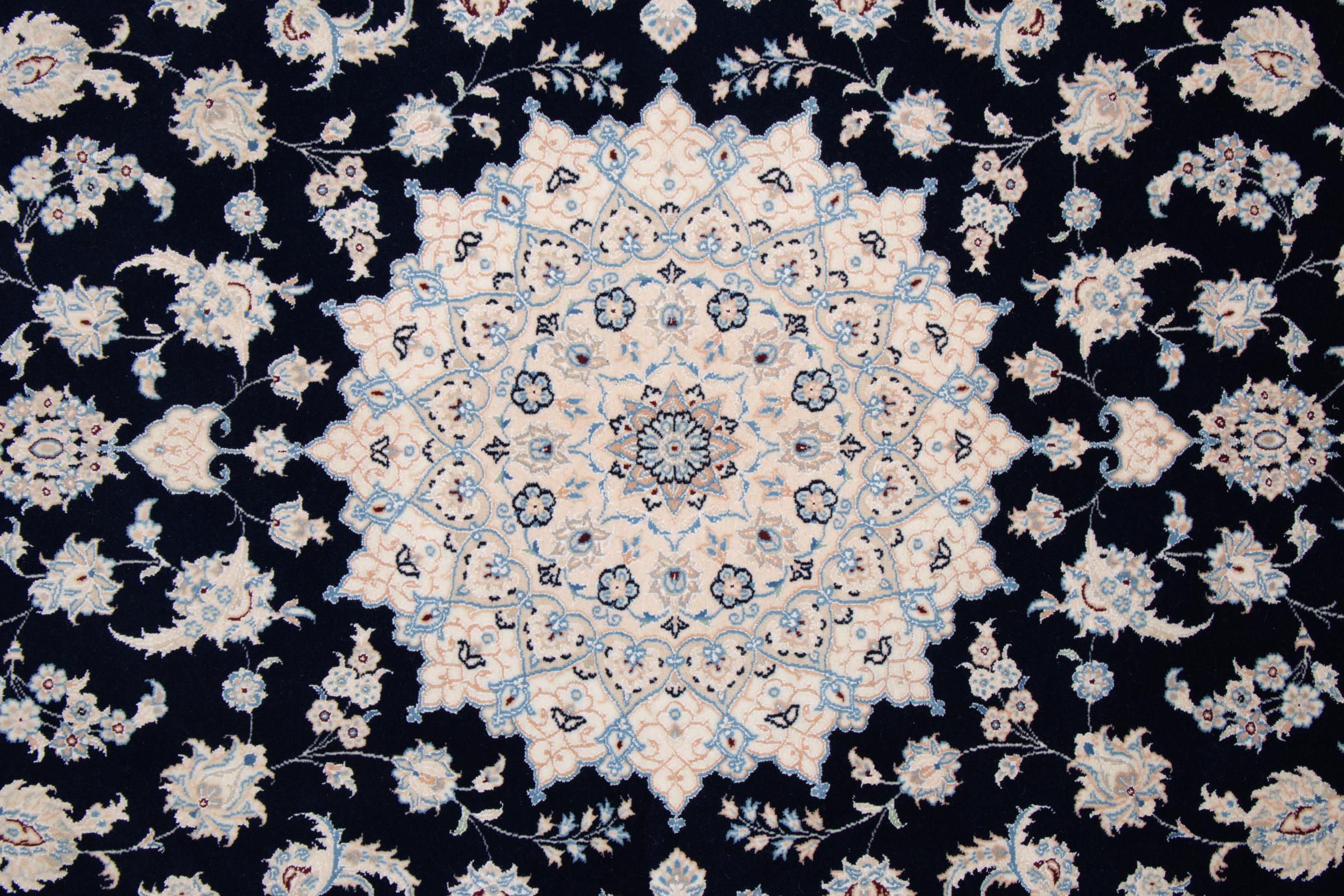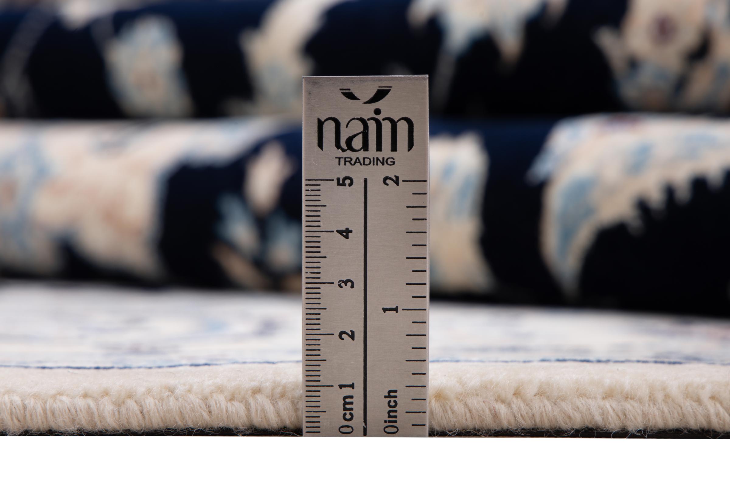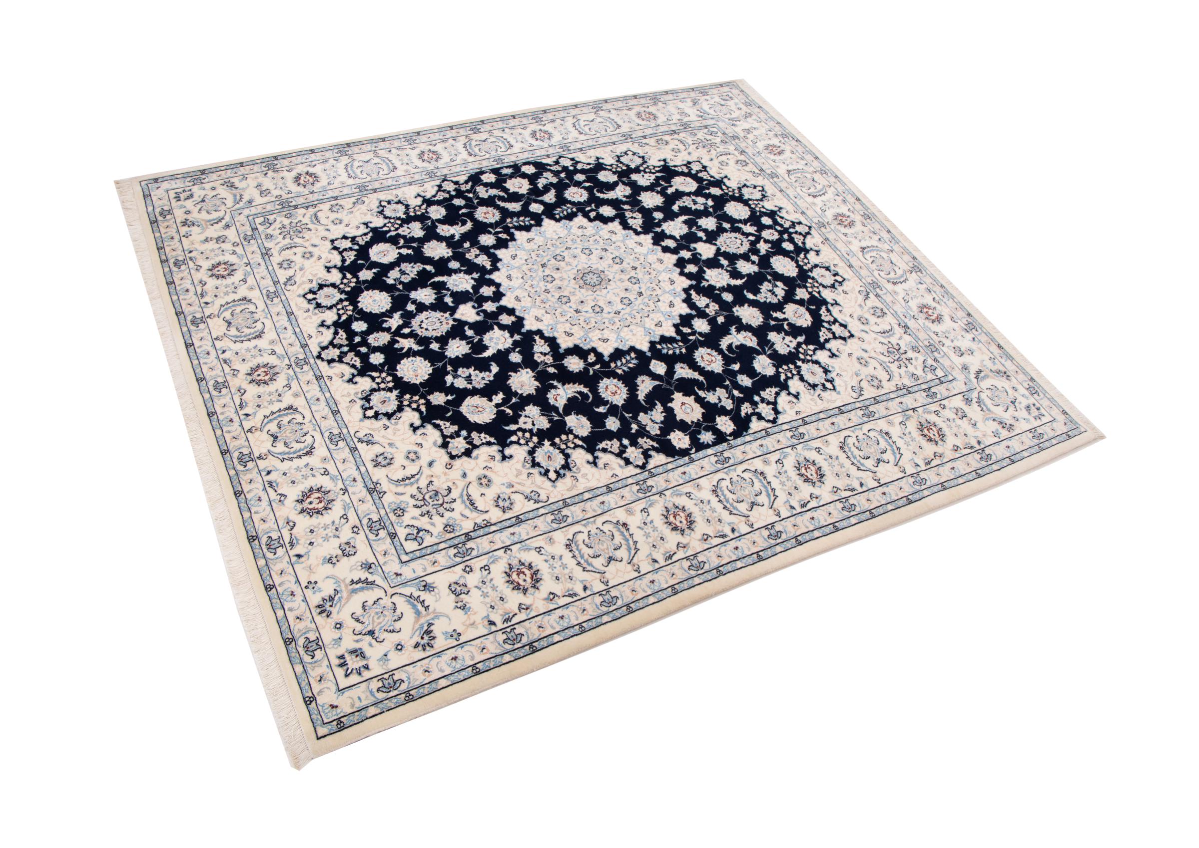 Ce tapis Nain est classifié 9La. La bonne qualité et le splendide design oriental avec ses motifs curvilignes inspirent chacun d’entre nous. Ce tapis persan était noué a la main avec de la laine précieuse et de la soie naturelle à Nain, une ville située à l’extrémité ouest du désert Dasht-e-Kavir.