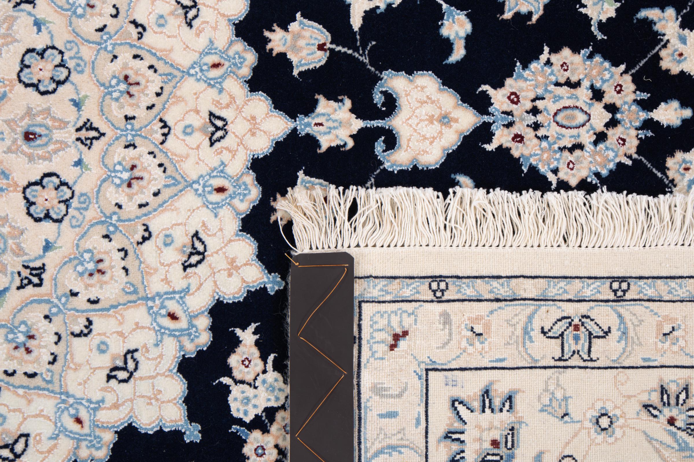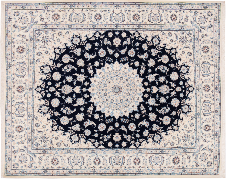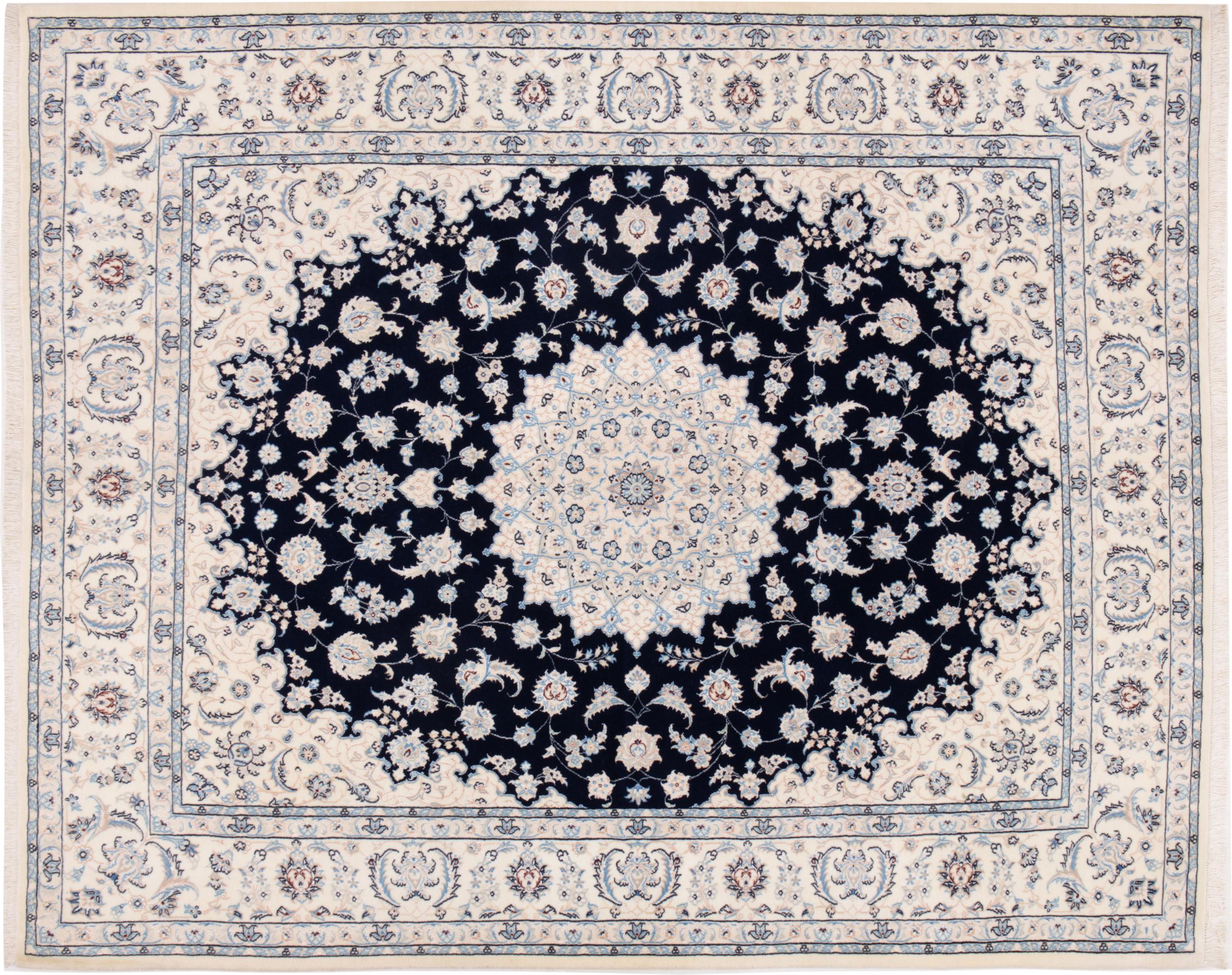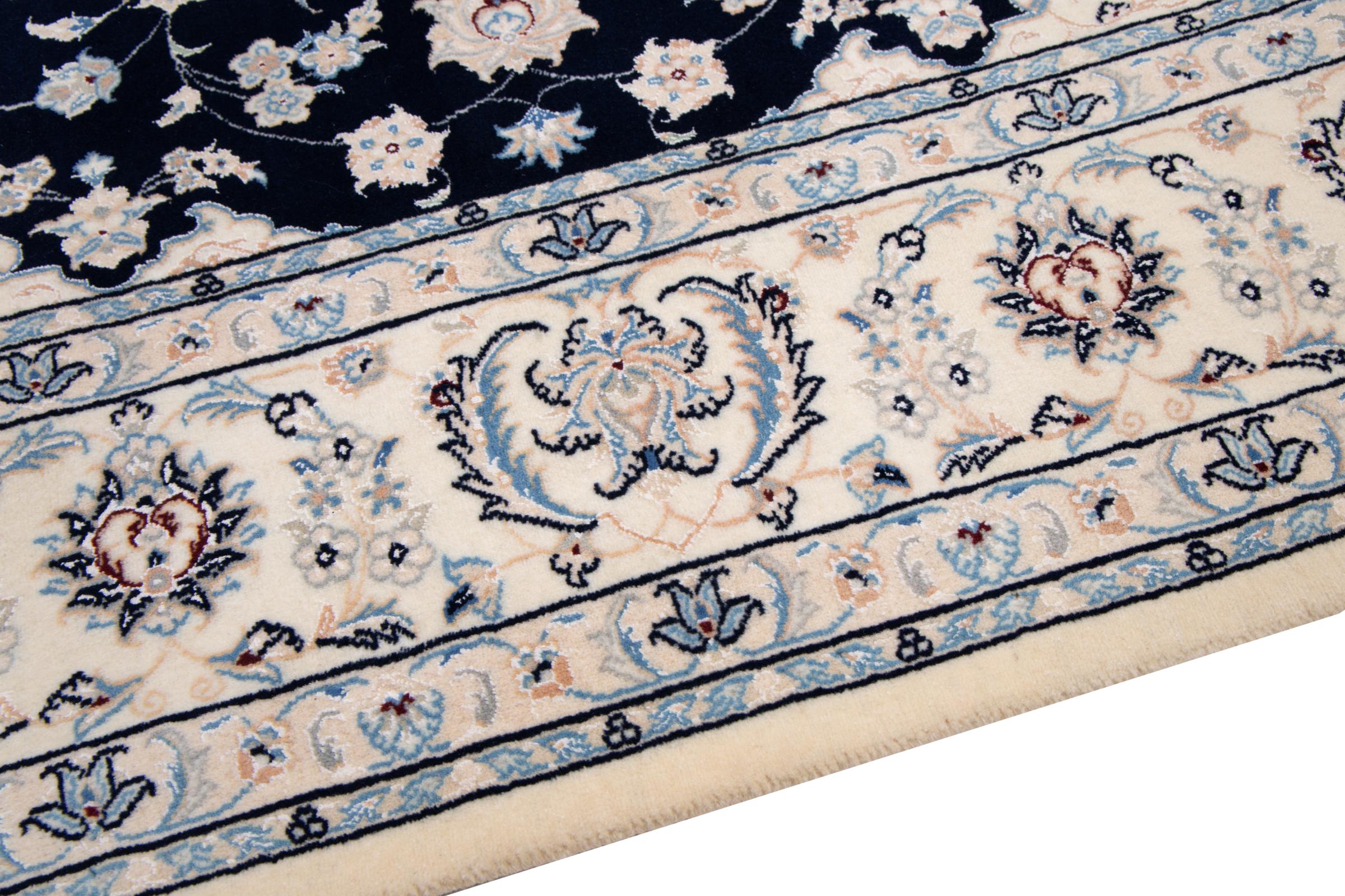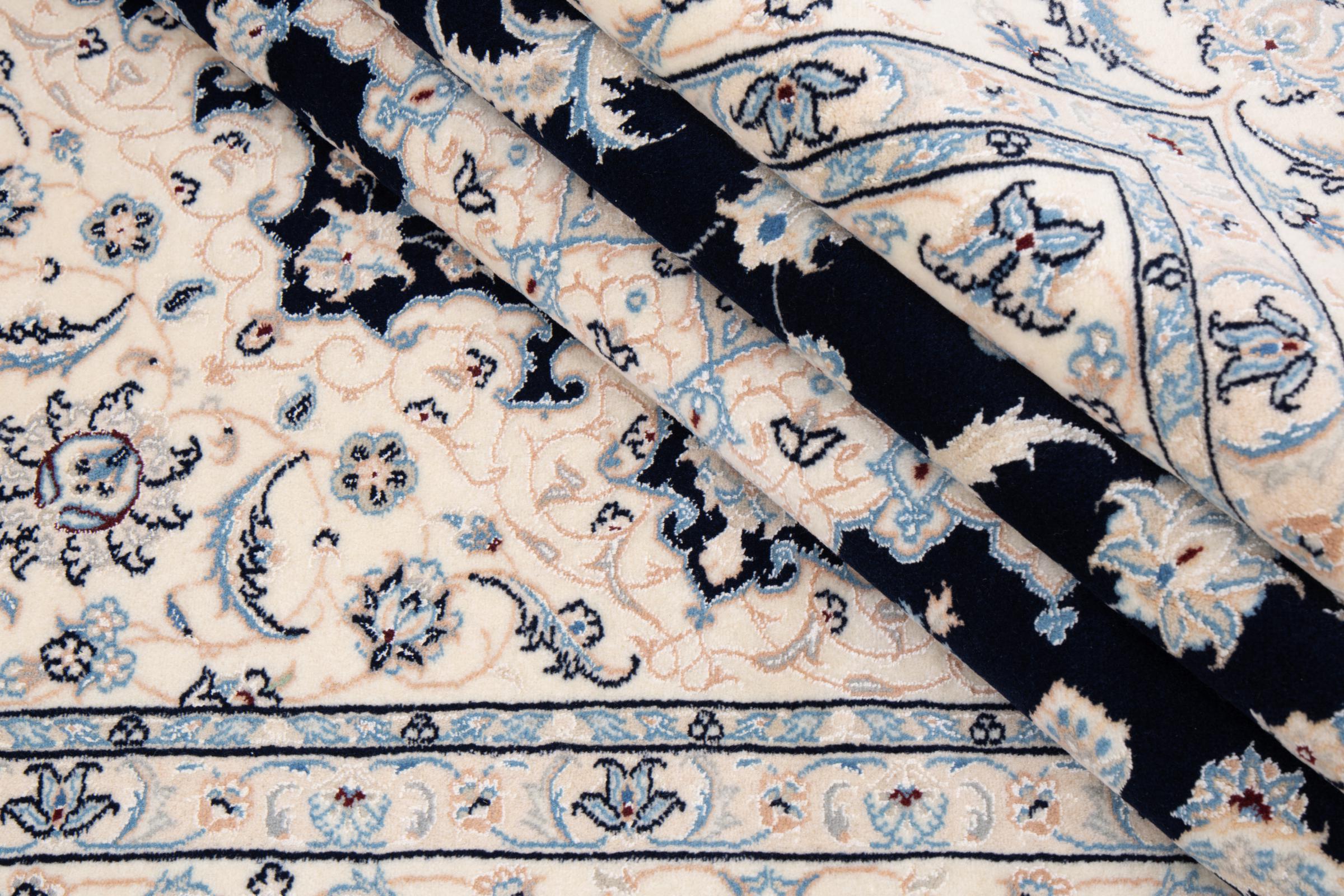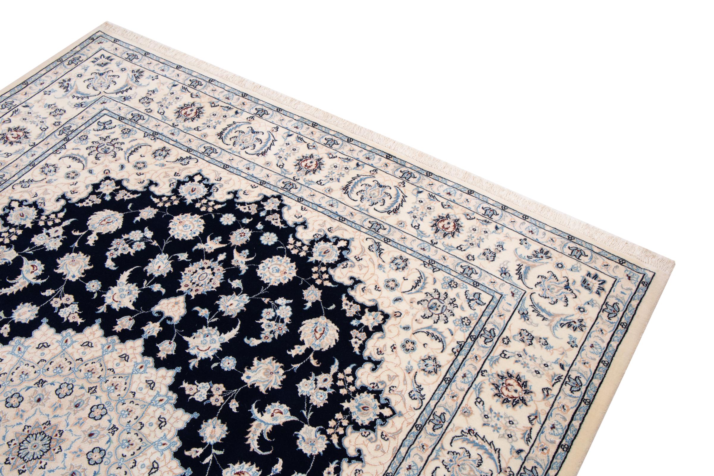 Ce tapis Nain est classifié 9La. La bonne qualité et le splendide design oriental avec ses motifs curvilignes inspirent chacun d’entre nous. Ce tapis persan était noué a la main avec de la laine précieuse et de la soie naturelle à Nain, une ville située à l’extrémité ouest du désert Dasht-e-Kavir.