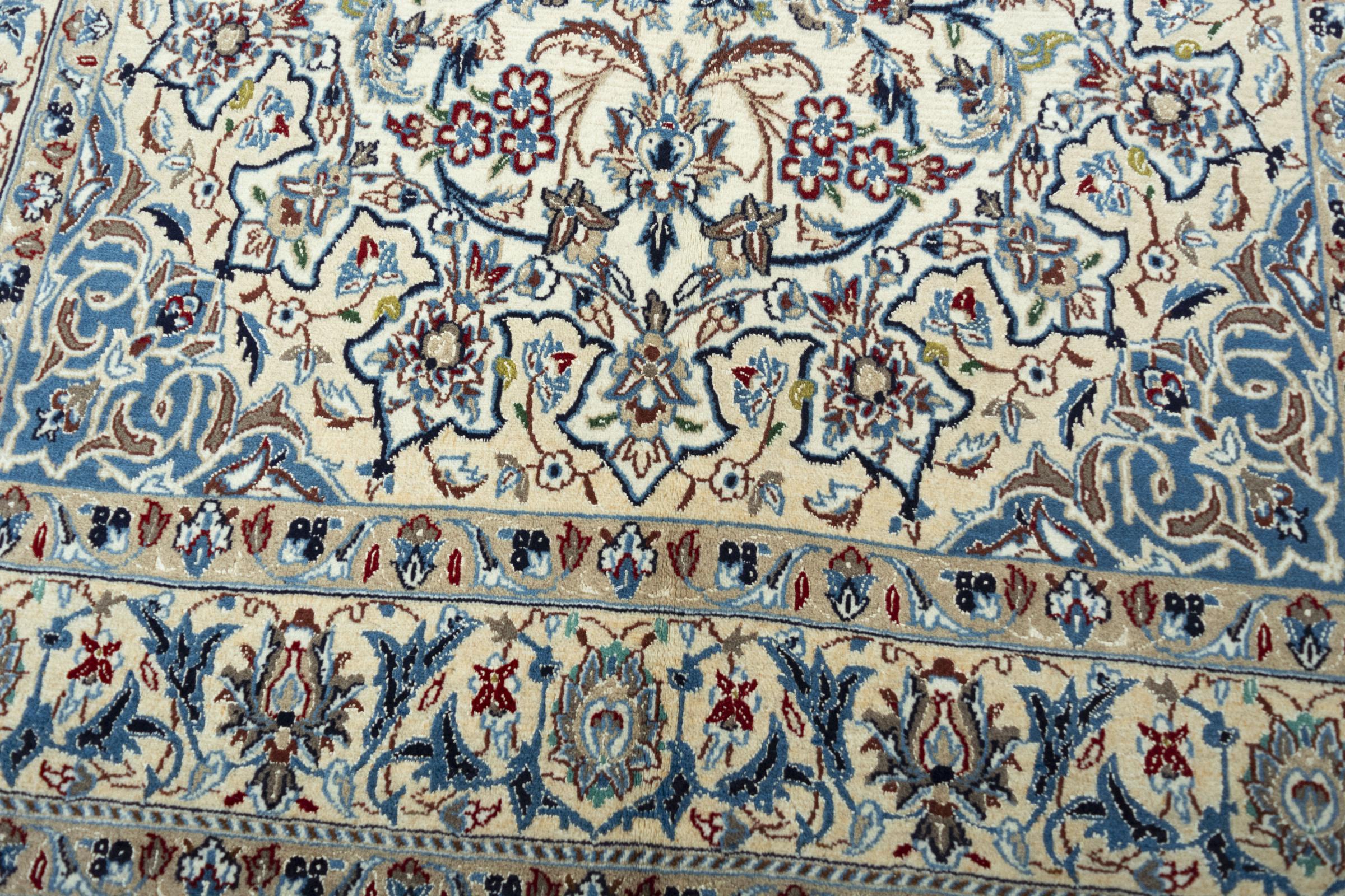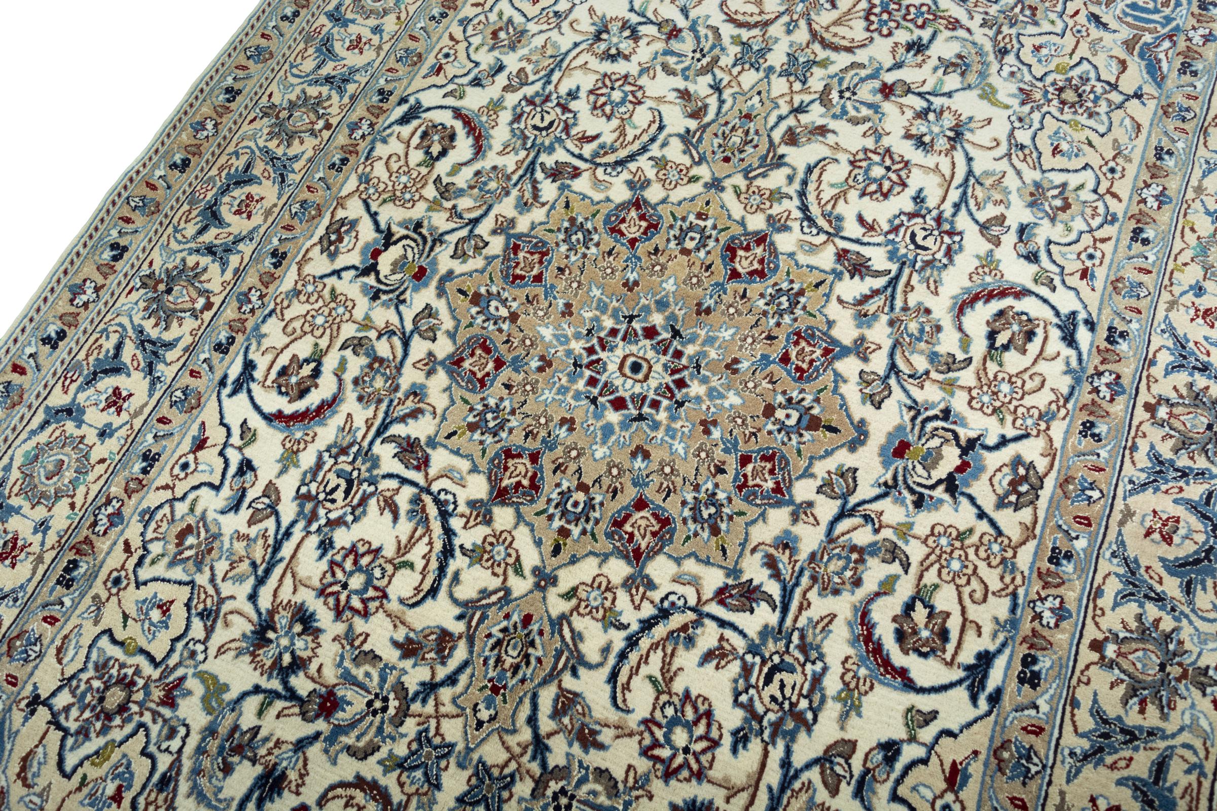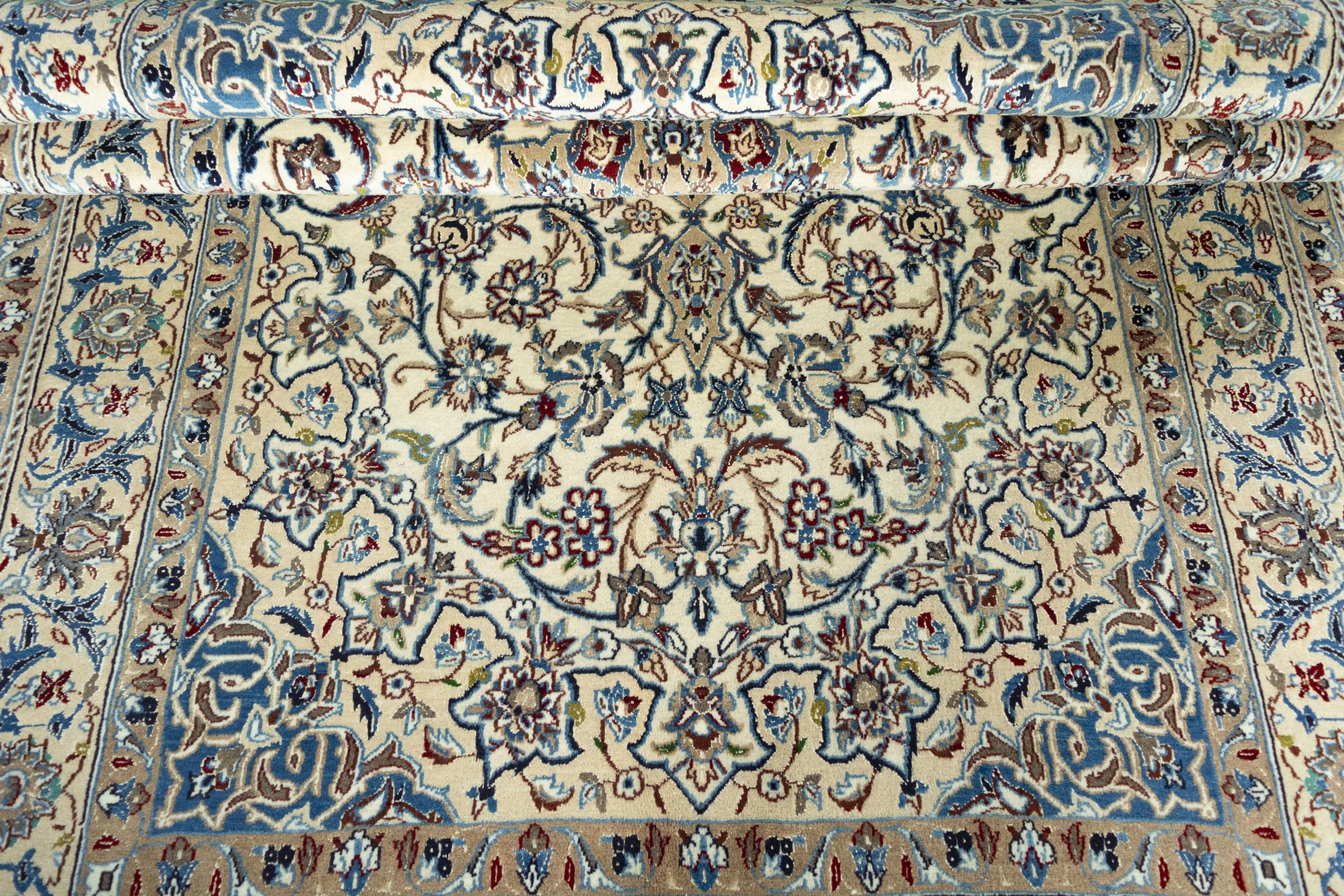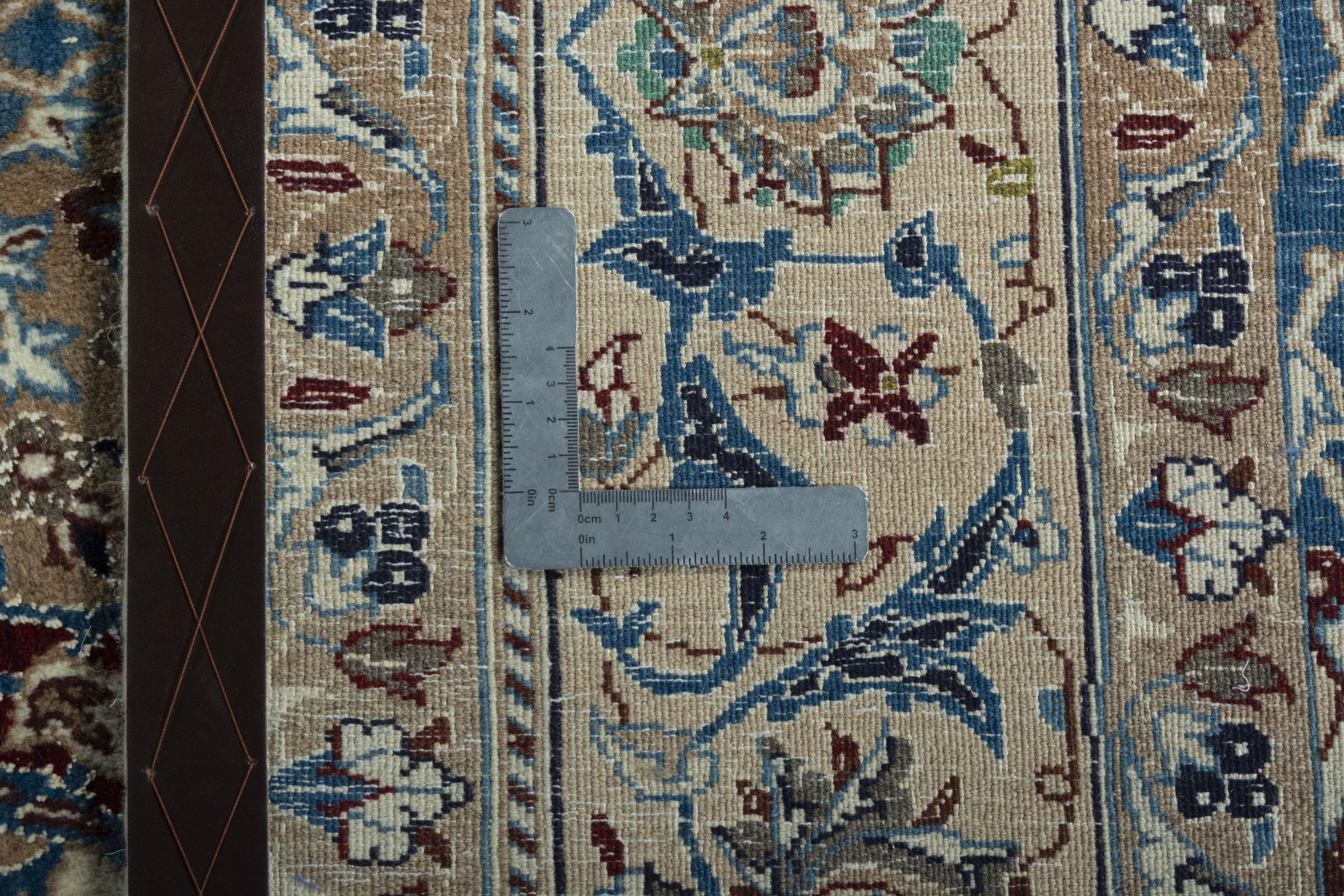 Ce tapis Nain est classifié 9La. La bonne qualité et le splendide design oriental avec ses motifs curvilignes inspirent chacun d’entre nous. Ce tapis persan était noué a la main avec de la laine précieuse et de la soie naturelle à Nain, une ville située à l’extrémité ouest du désert Dasht-e-Kavir.