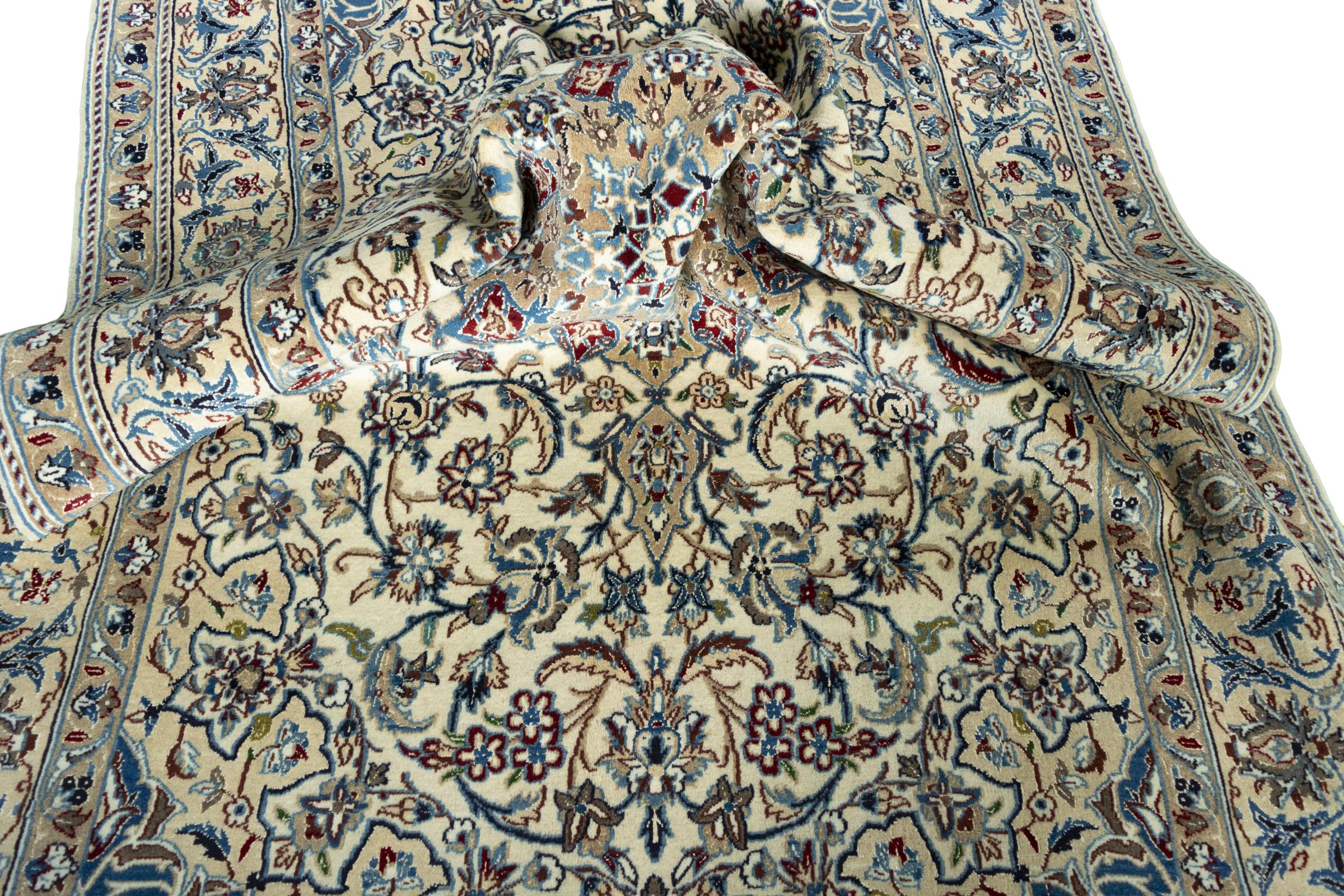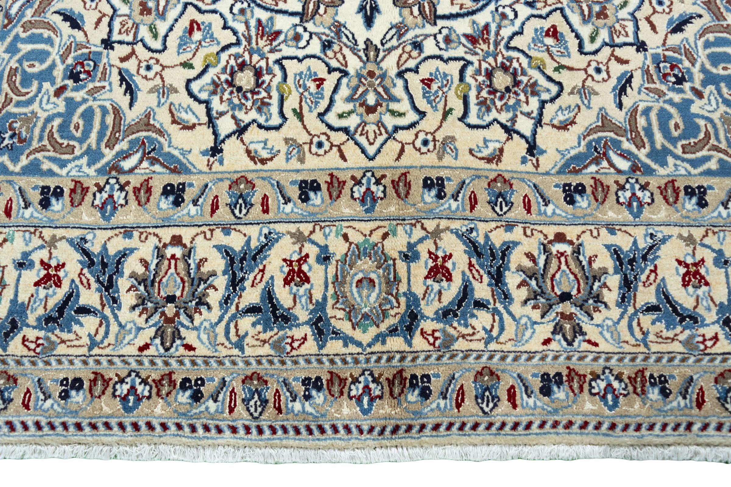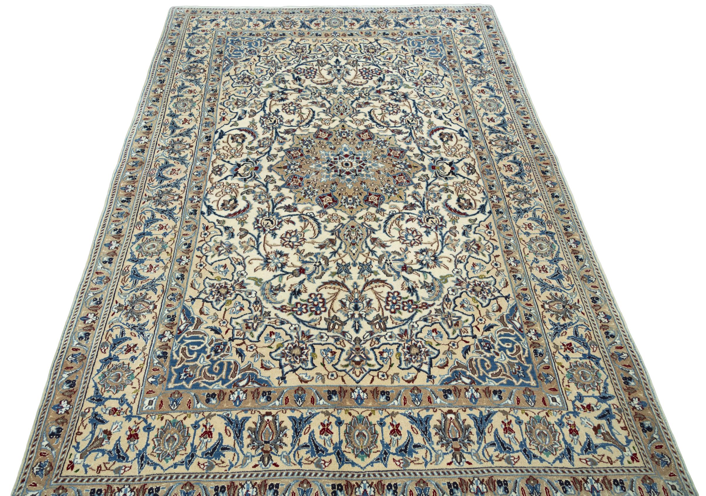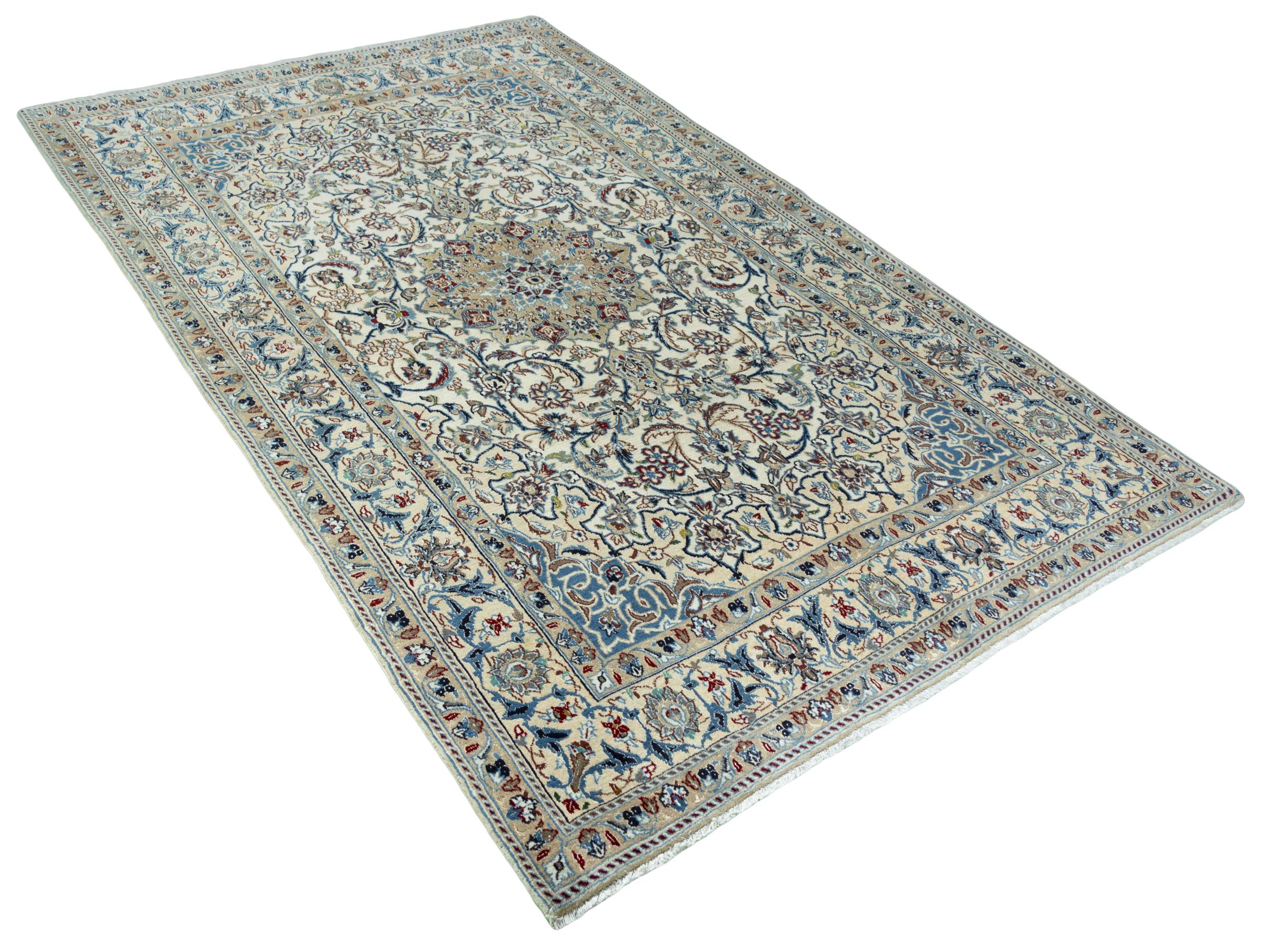 Ce tapis Nain est classifié 9La. La bonne qualité et le splendide design oriental avec ses motifs curvilignes inspirent chacun d’entre nous. Ce tapis persan était noué a la main avec de la laine précieuse et de la soie naturelle à Nain, une ville située à l’extrémité ouest du désert Dasht-e-Kavir.
