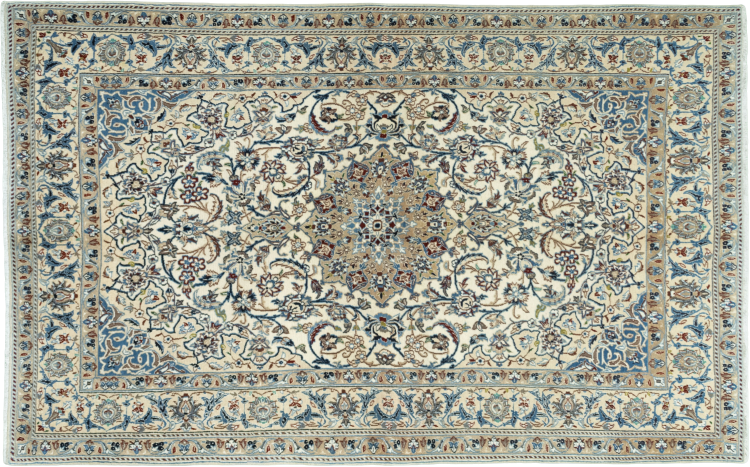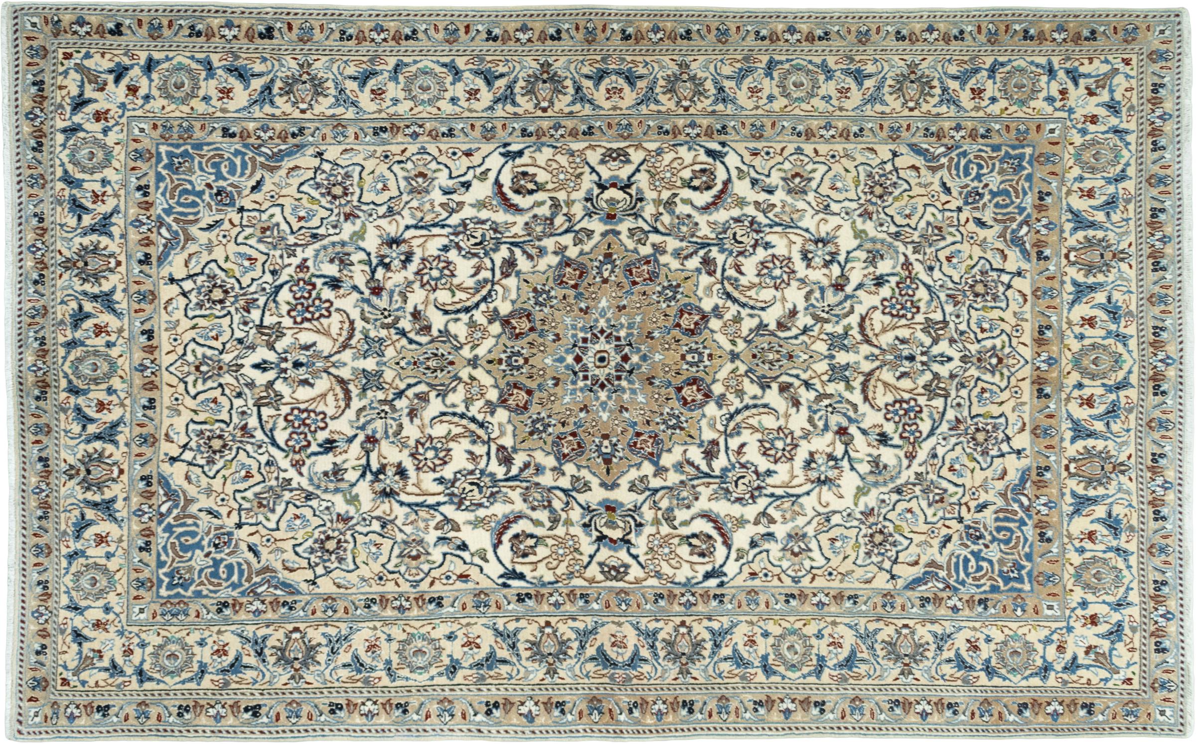 Les tapis de la ville de Nain, à la frontière de l'un des plus grands déserts d'Iran, comptent parmi les plus célèbres tapis persans du monde. Leur design typique est sans équivoque avec des ornements floraux, un médaillon central et des nuances de beige et de rouge ou de bleu. Grâce à leurs désignations 4La, 6La, 9La et 12La, les finesses d'un tapis Nain peuvent être vues d'un seul coup d'œil. Plus le chiffre "La" est bas, plus la densité des nœuds est élevée et donc plus le tapis est fin.