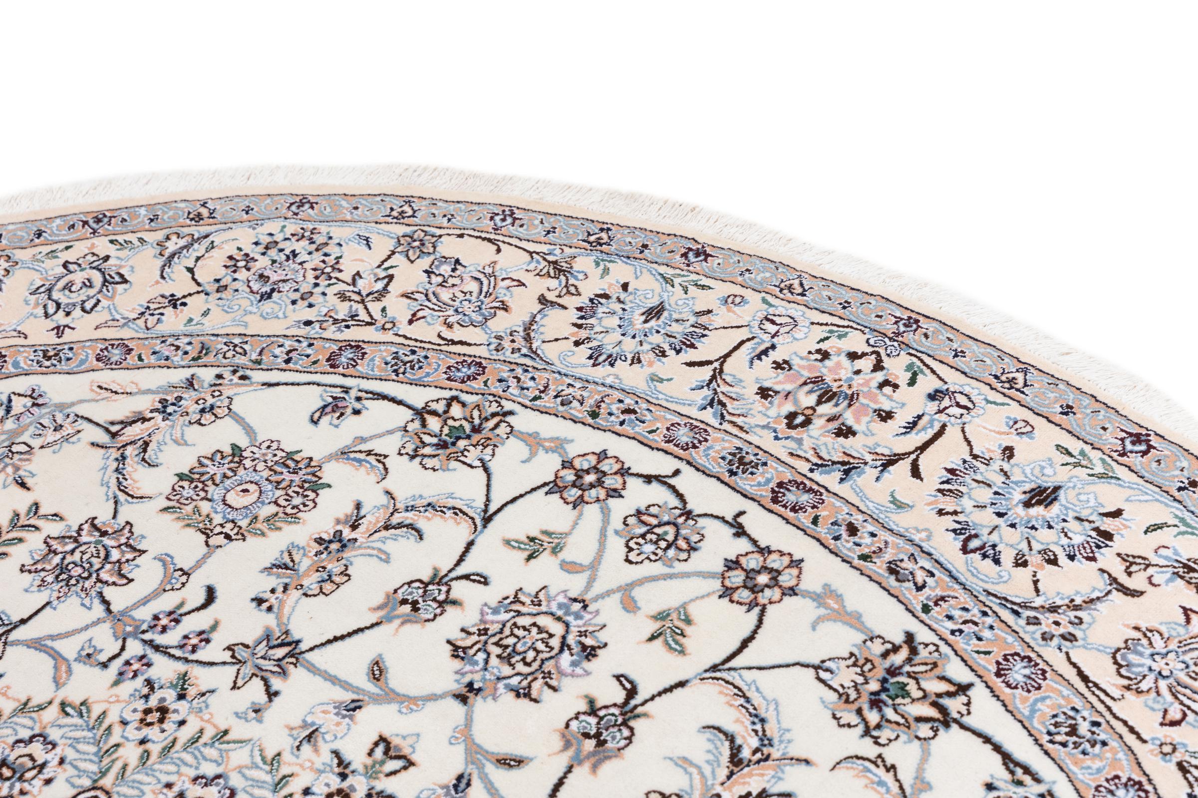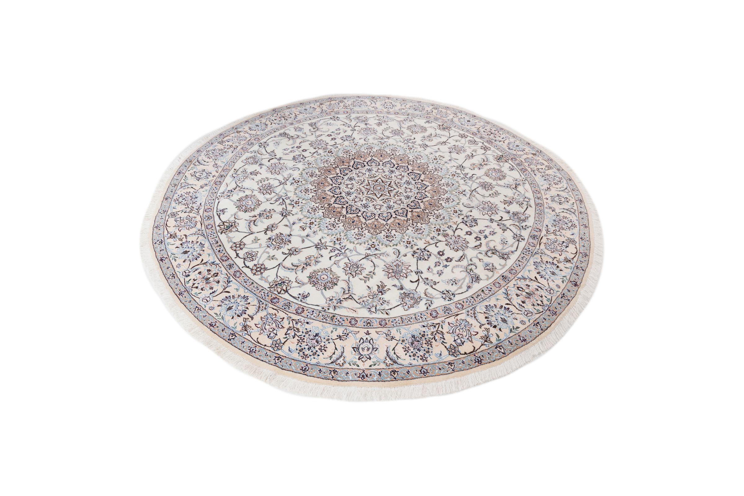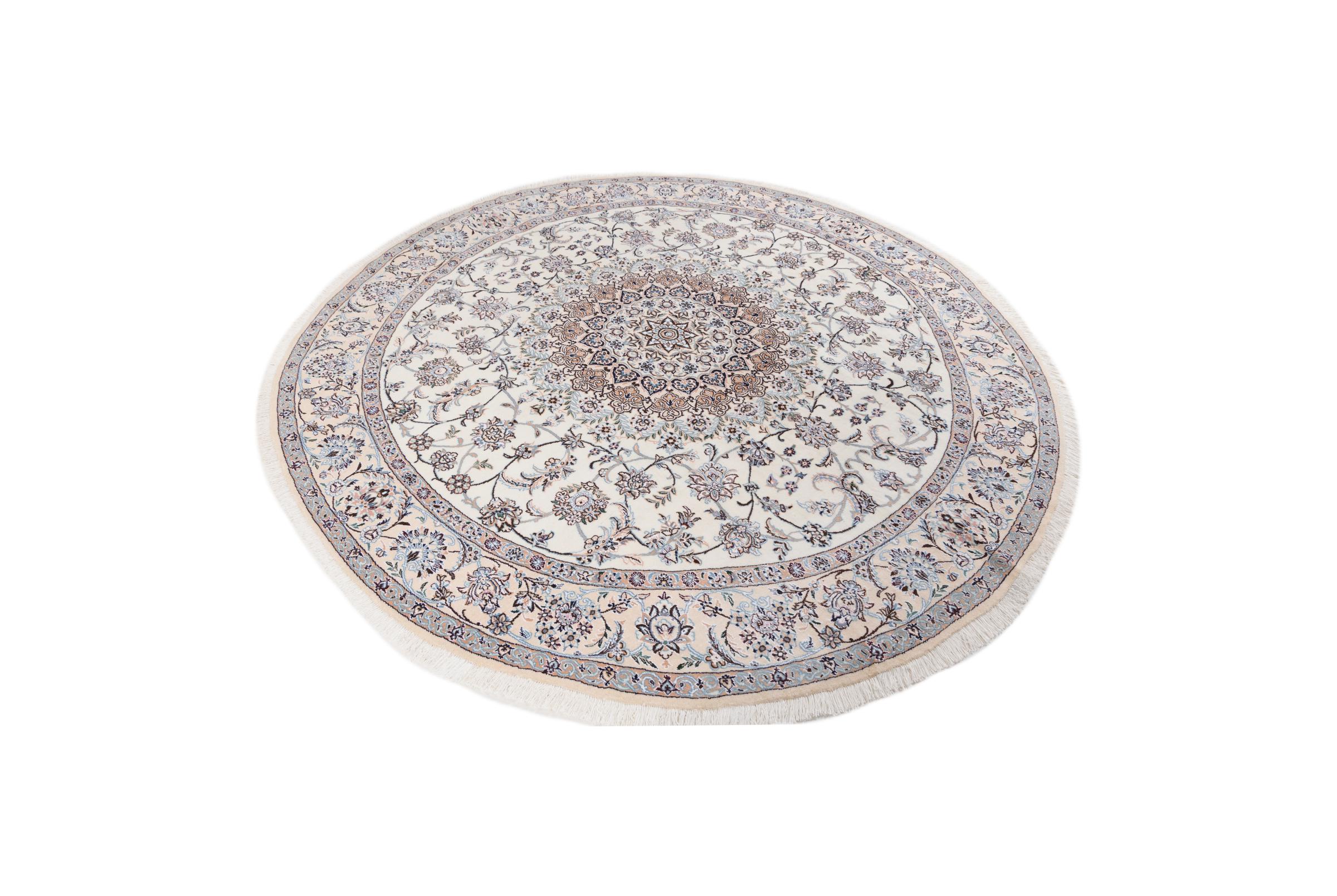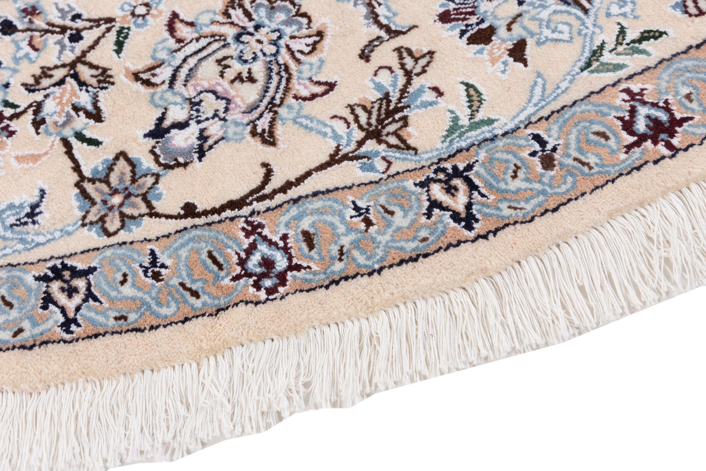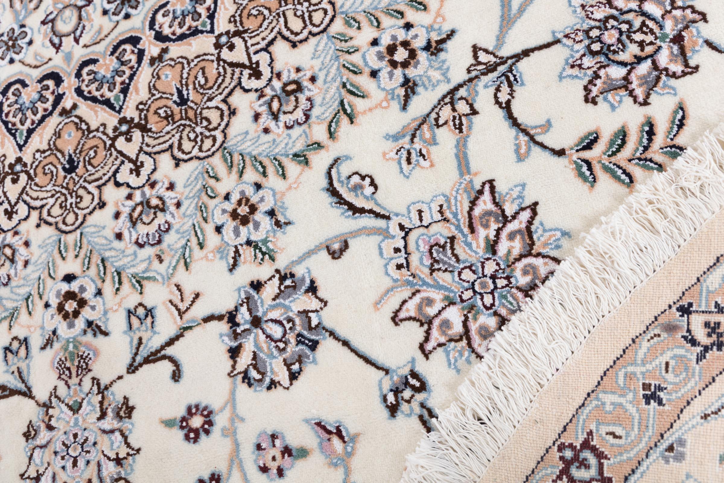 Ce tapis Nain est classifié 9La. La bonne qualité et le splendide design oriental avec ses motifs curvilignes inspirent chacun d’entre nous. Ce tapis persan était noué a la main avec de la laine précieuse et de la soie naturelle à Nain, une ville située à l’extrémité ouest du désert Dasht-e-Kavir.