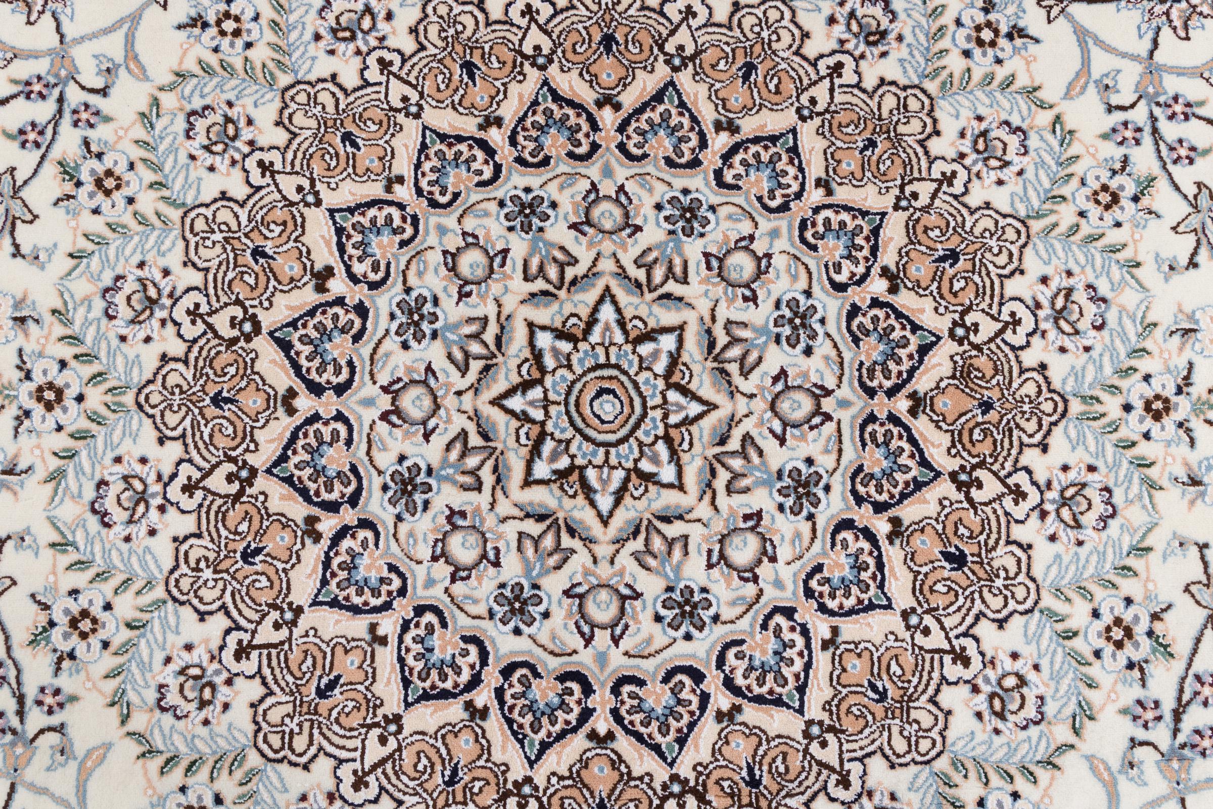 Les tapis de la ville de Nain, à la frontière de l'un des plus grands déserts d'Iran, comptent parmi les plus célèbres tapis persans du monde. Leur design typique est sans équivoque avec des ornements floraux, un médaillon central et des nuances de beige et de rouge ou de bleu. Grâce à leurs désignations 4La, 6La, 9La et 12La, les finesses d'un tapis Nain peuvent être vues d'un seul coup d'œil. Plus le chiffre "La" est bas, plus la densité des nœuds est élevée et donc plus le tapis est fin.