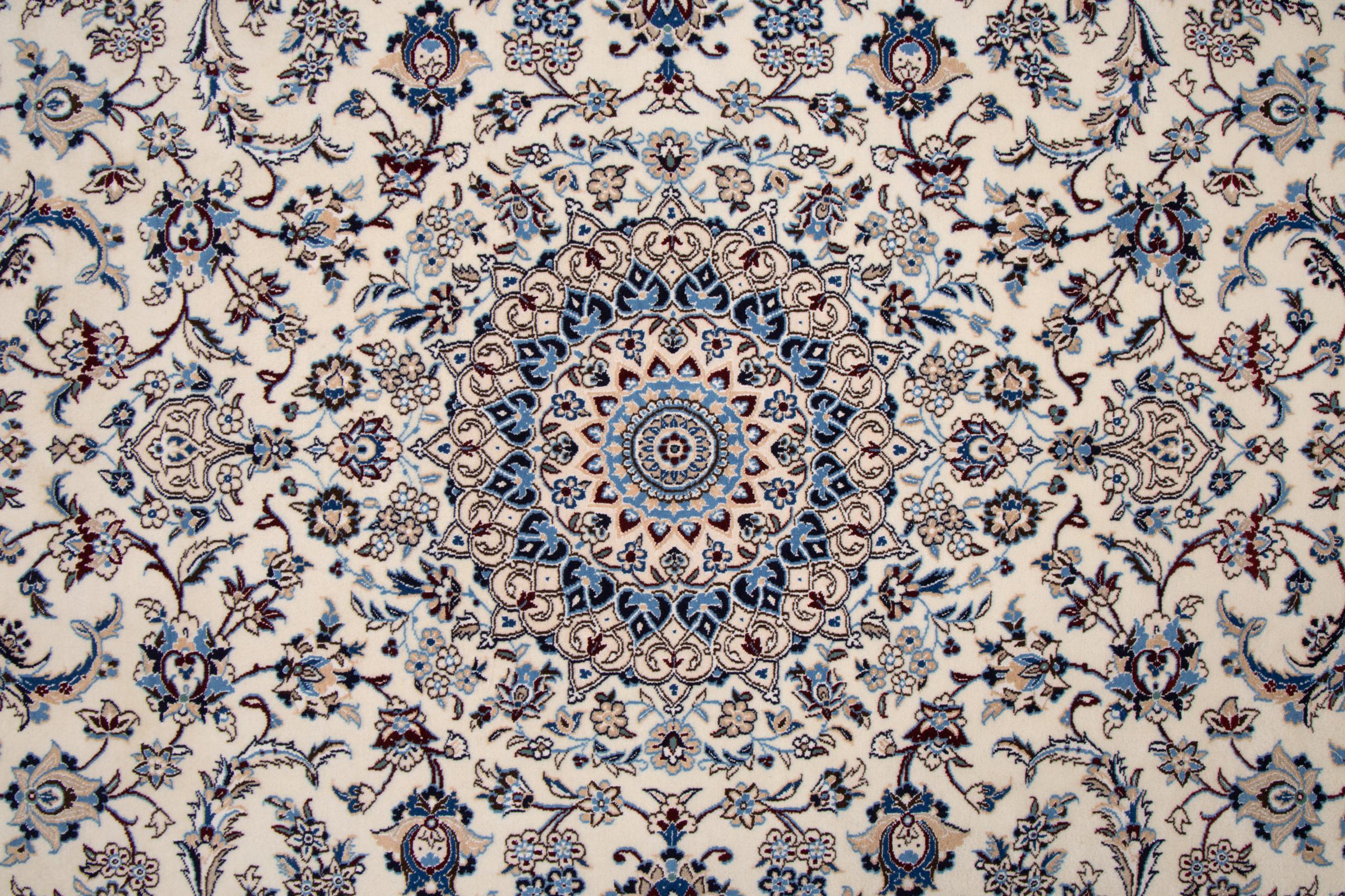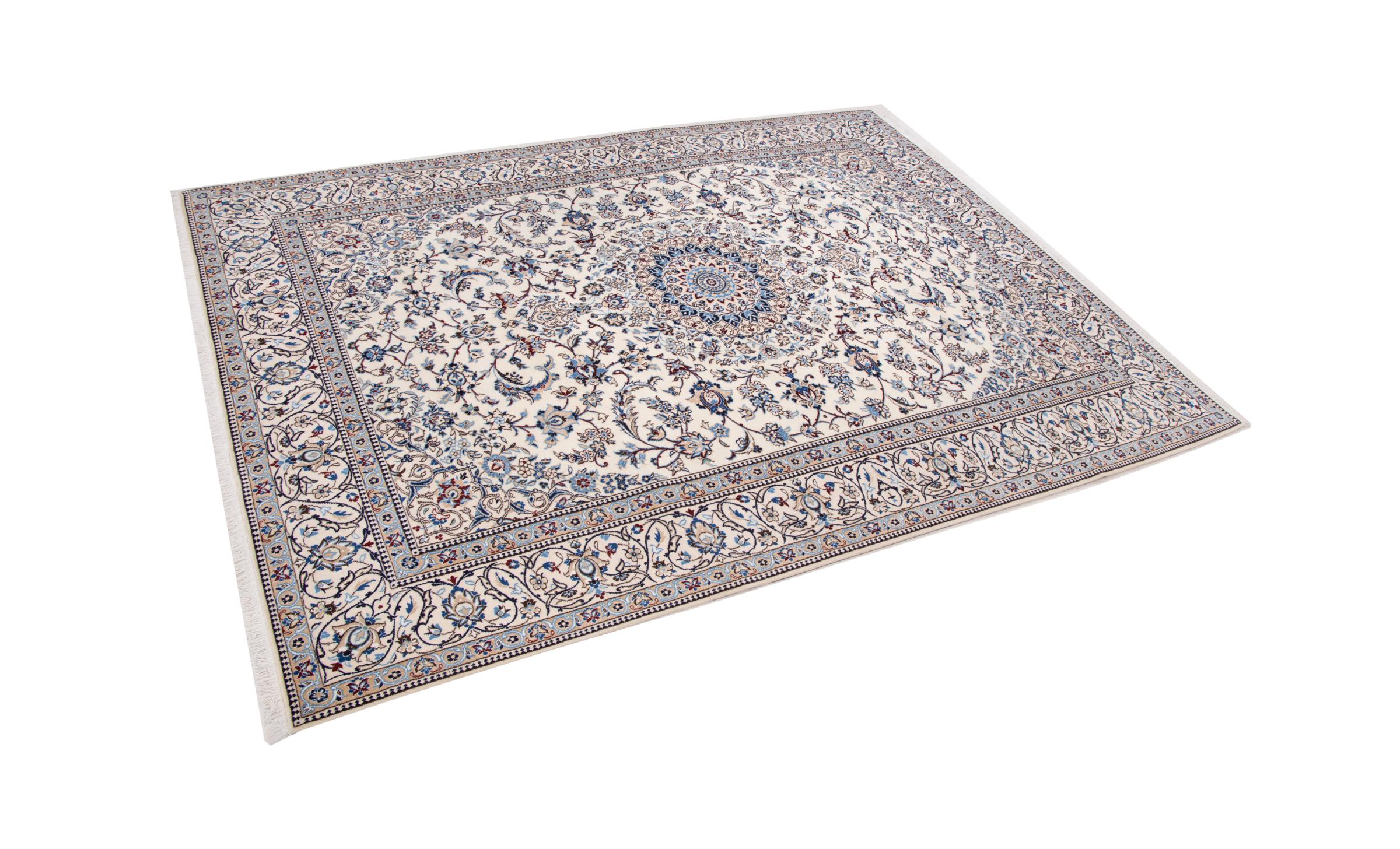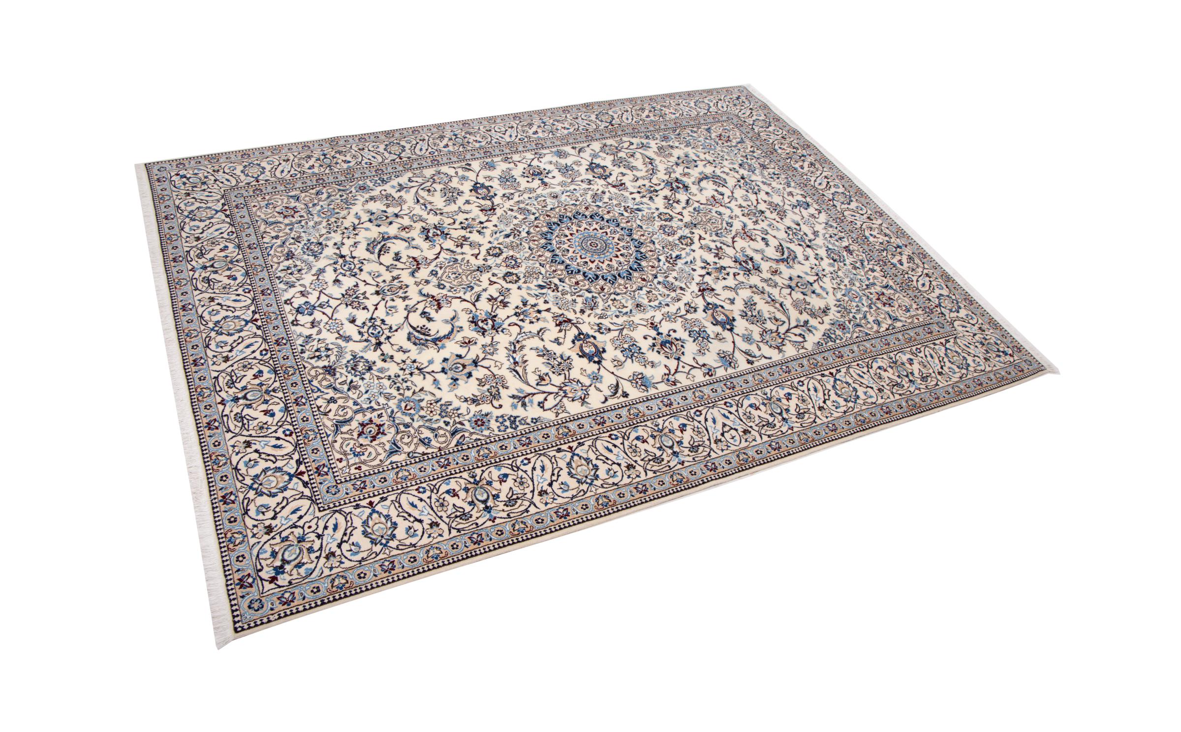 Les tapis de la ville de Nain, à la frontière de l'un des plus grands déserts d'Iran, comptent parmi les plus célèbres tapis persans du monde. Leur design typique est sans équivoque avec des ornements floraux, un médaillon central et des nuances de beige et de rouge ou de bleu. Grâce à leurs désignations 4La, 6La, 9La et 12La, les finesses d'un tapis Nain peuvent être vues d'un seul coup d'œil. Plus le chiffre "La" est bas, plus la densité des nœuds est élevée et donc plus le tapis est fin.