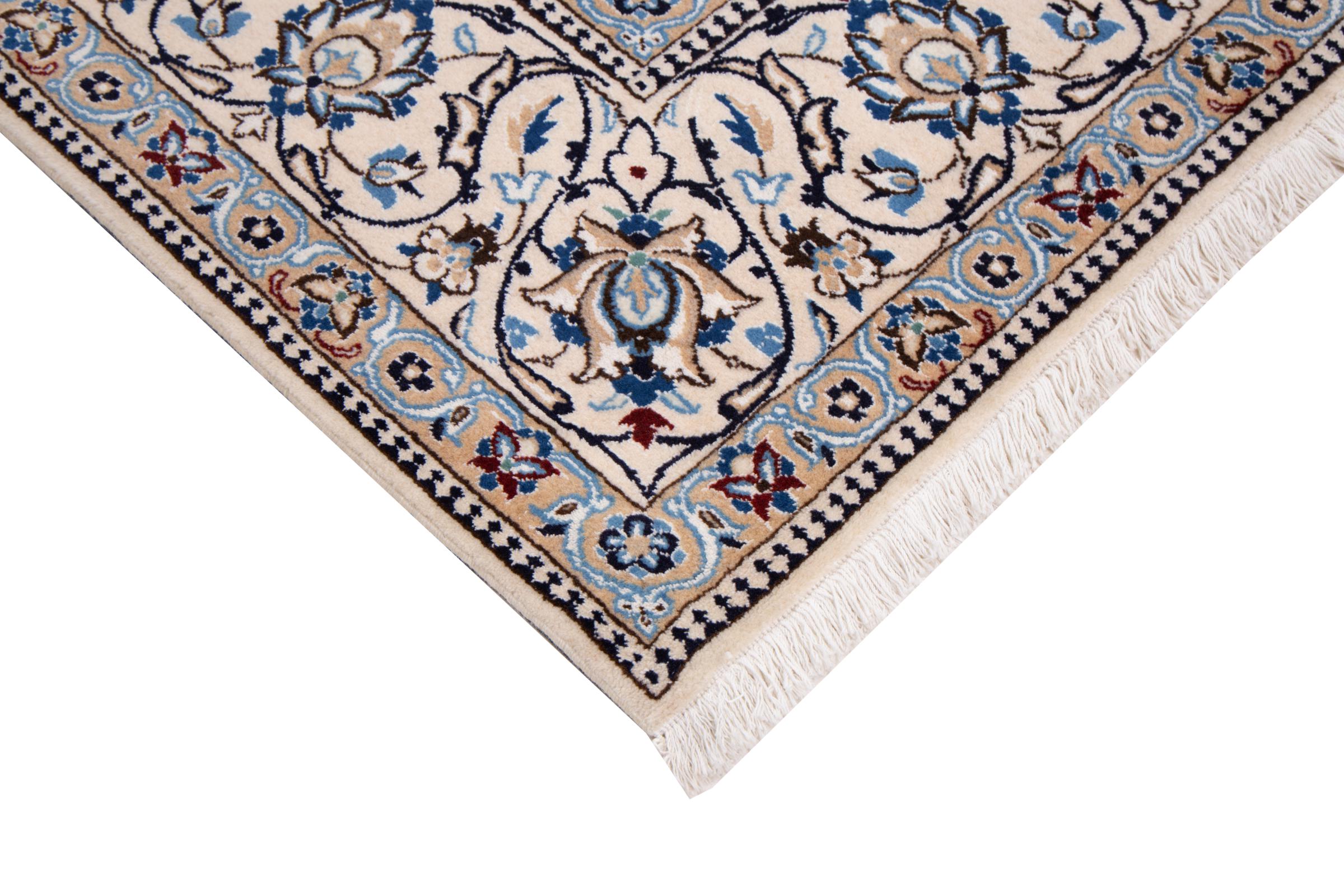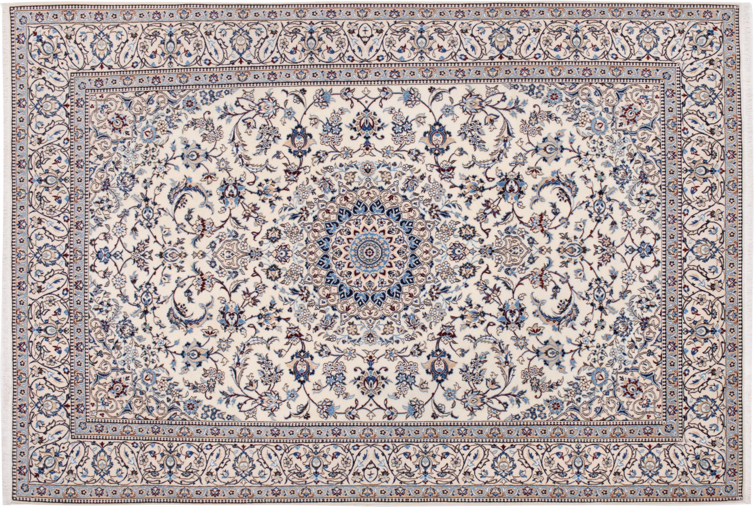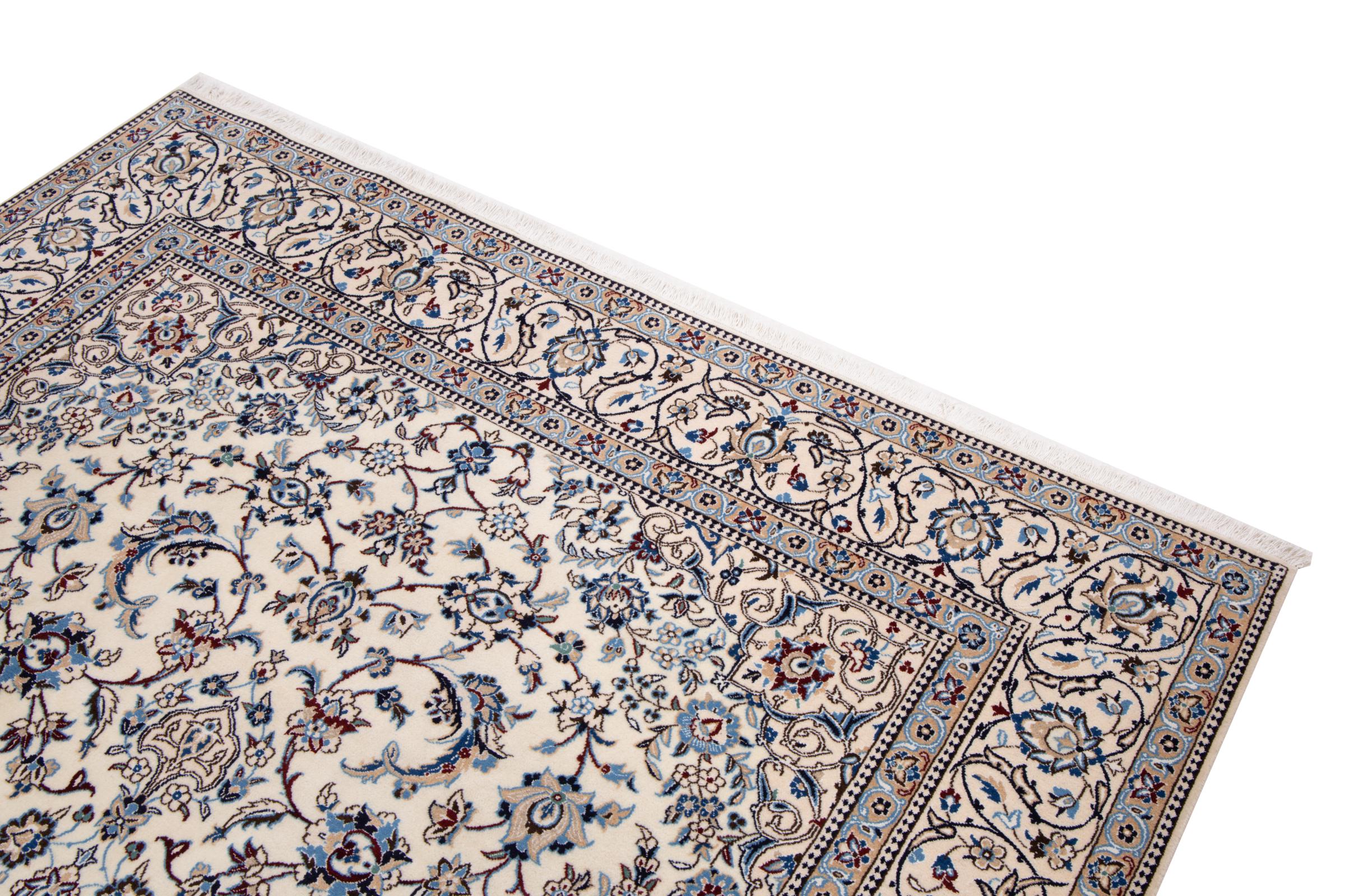 Ce tapis Nain est classifié 9La. La bonne qualité et le splendide design oriental avec ses motifs curvilignes inspirent chacun d’entre nous. Ce tapis persan était noué a la main avec de la laine précieuse et de la soie naturelle à Nain, une ville située à l’extrémité ouest du désert Dasht-e-Kavir.
