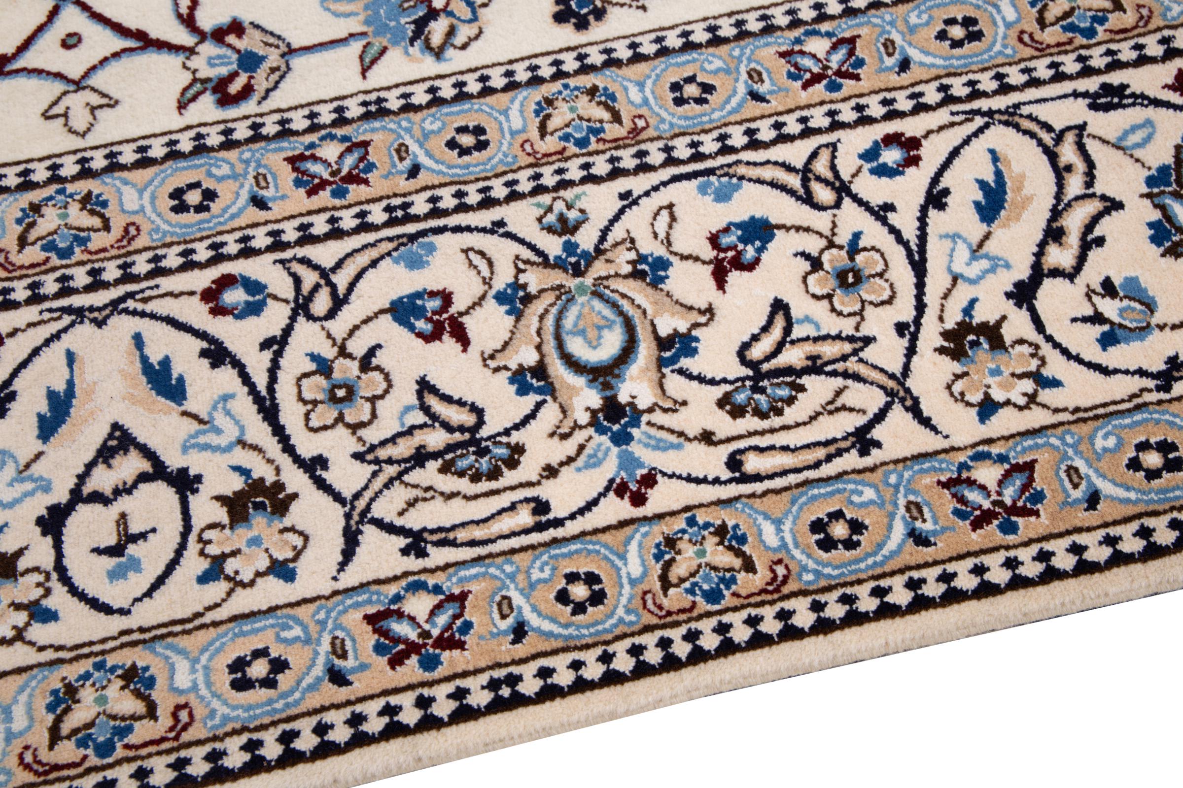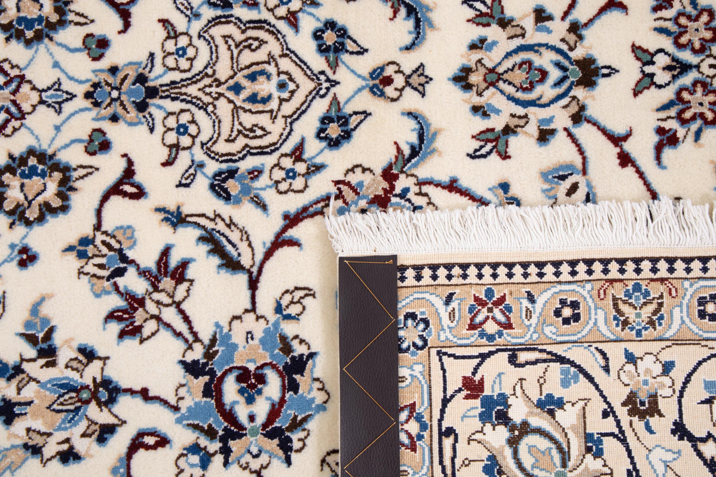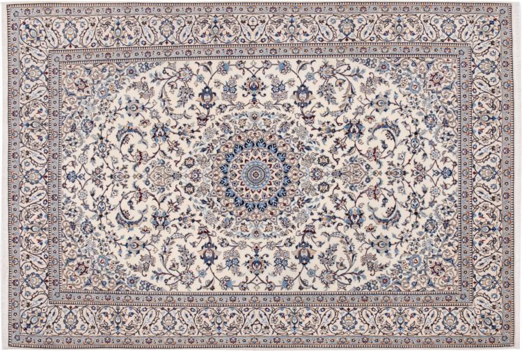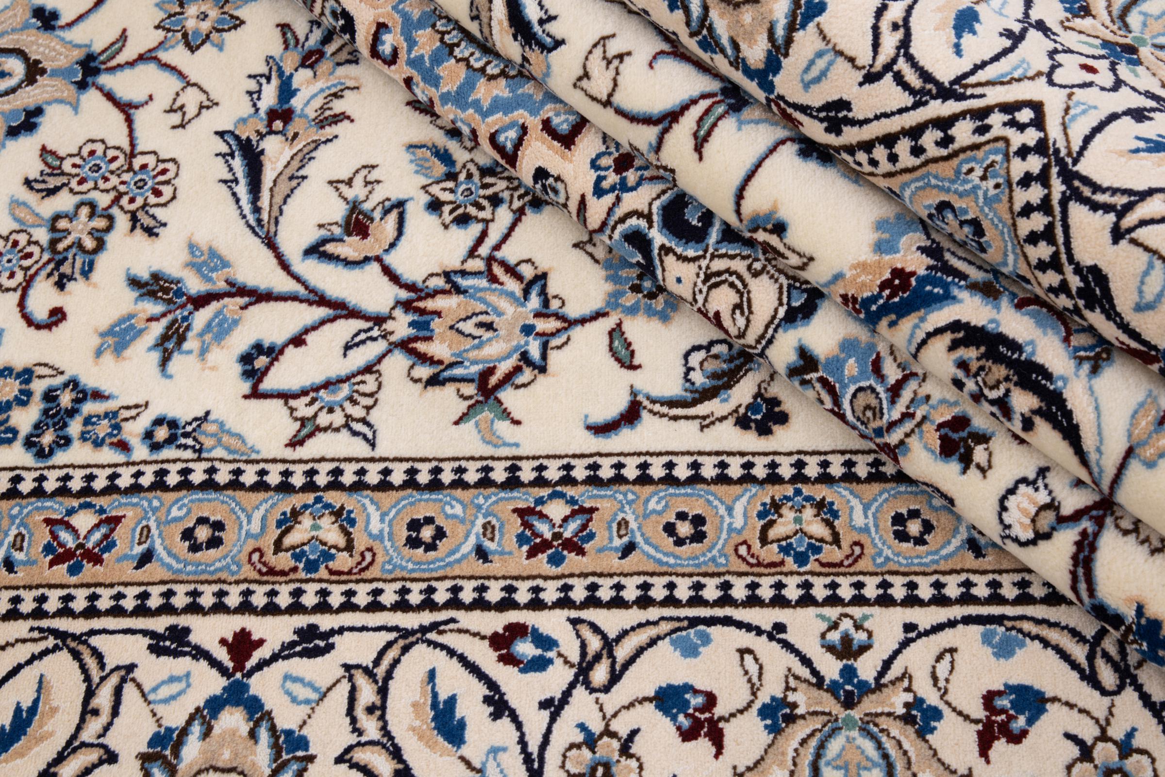 Ce tapis Nain est classifié 9La. La bonne qualité et le splendide design oriental avec ses motifs curvilignes inspirent chacun d’entre nous. Ce tapis persan était noué a la main avec de la laine précieuse et de la soie naturelle à Nain, une ville située à l’extrémité ouest du désert Dasht-e-Kavir.