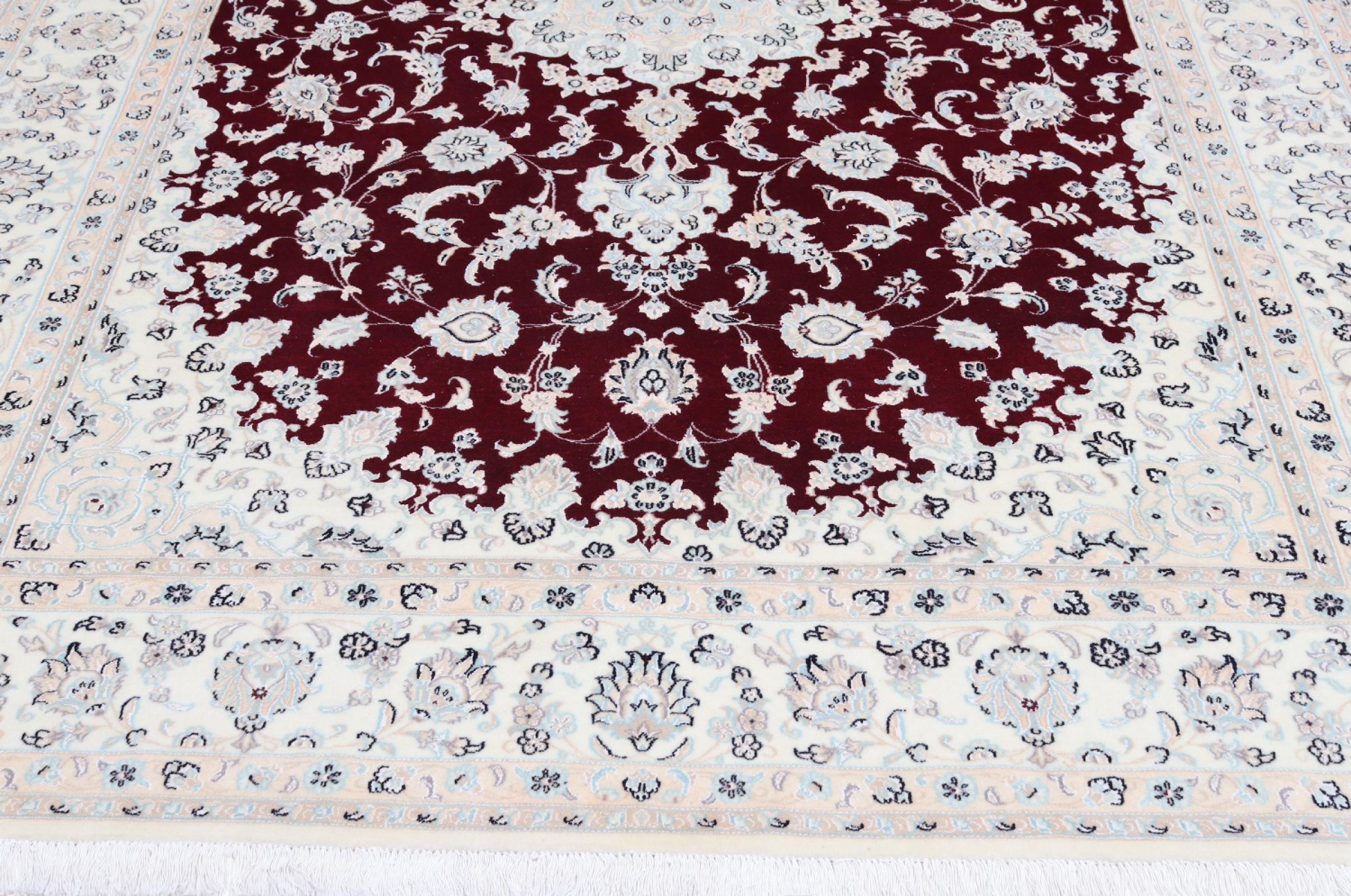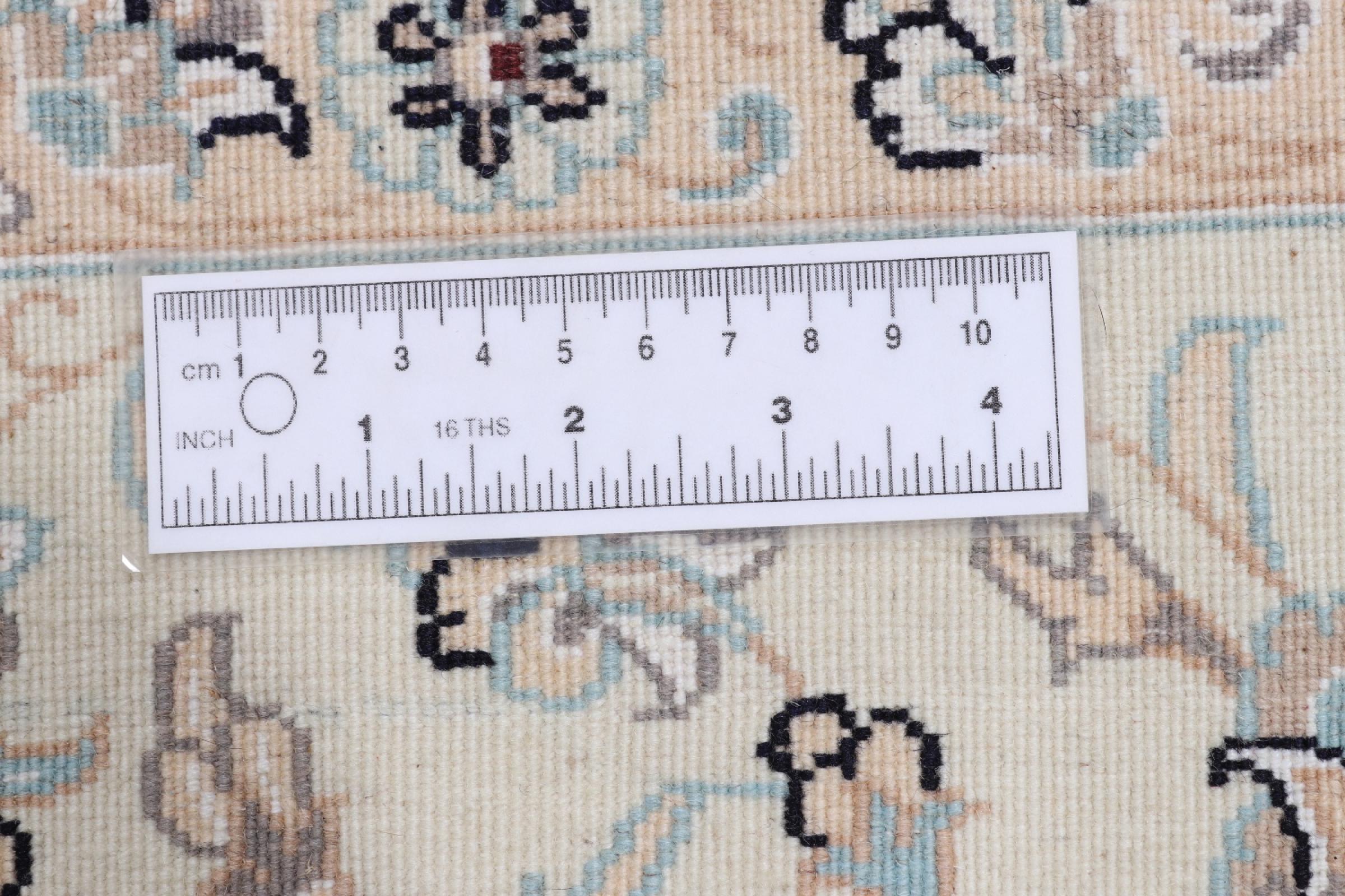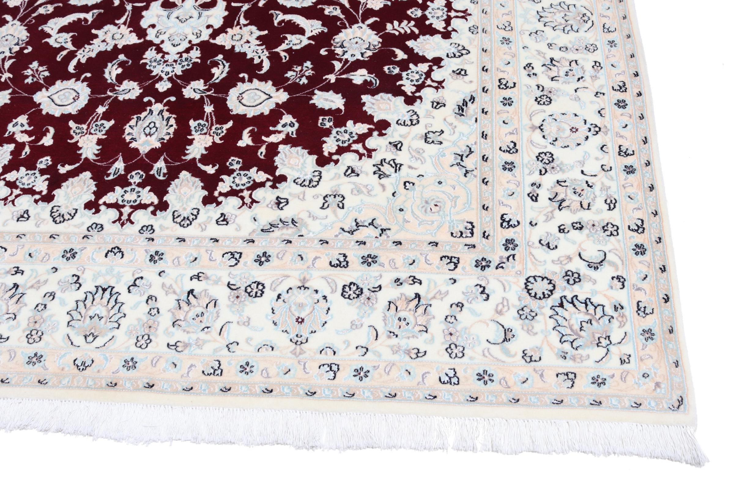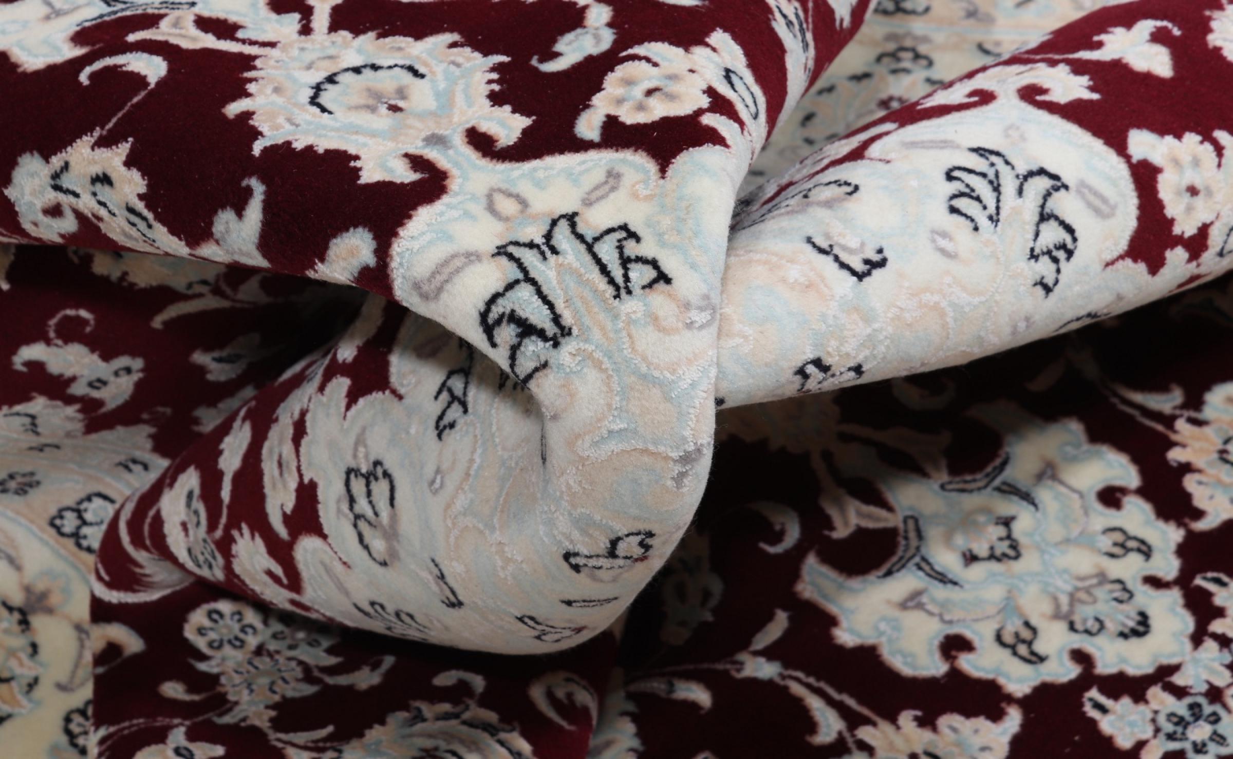 Ce tapis Nain est classifié 9La. La bonne qualité et le splendide design oriental avec ses motifs curvilignes inspirent chacun d’entre nous. Ce tapis persan était noué a la main avec de la laine précieuse et de la soie naturelle à Nain, une ville située à l’extrémité ouest du désert Dasht-e-Kavir.
