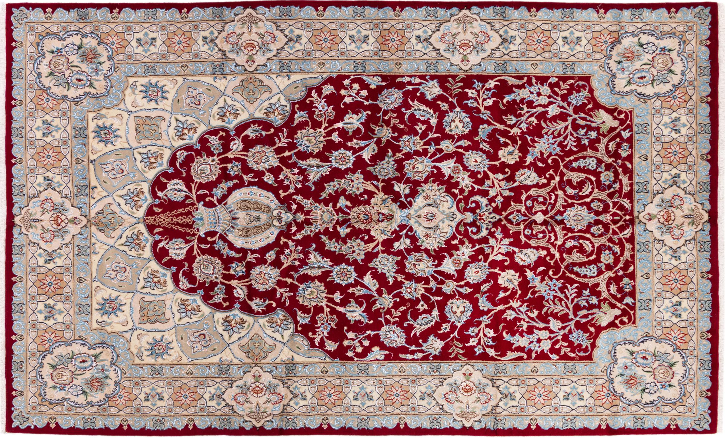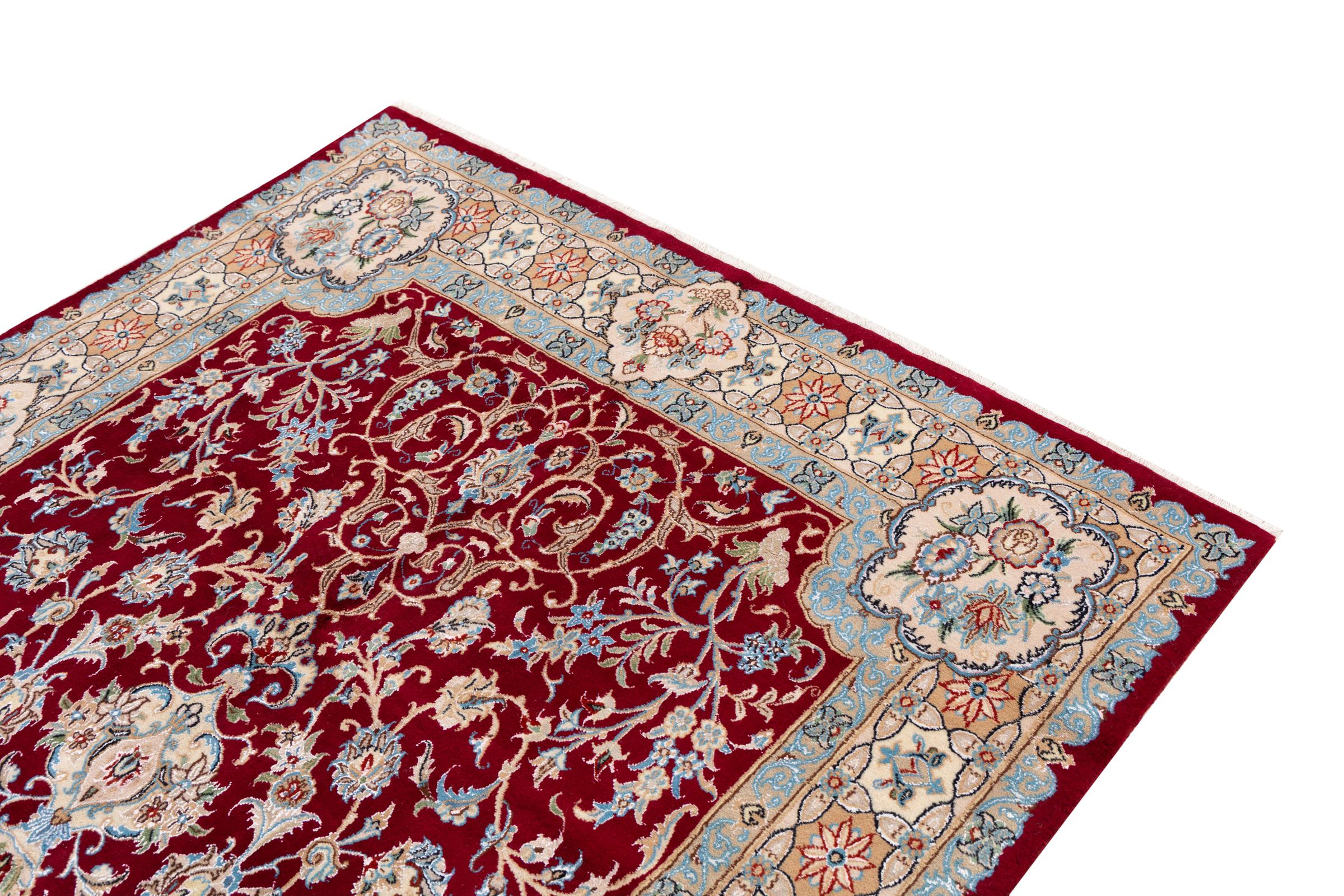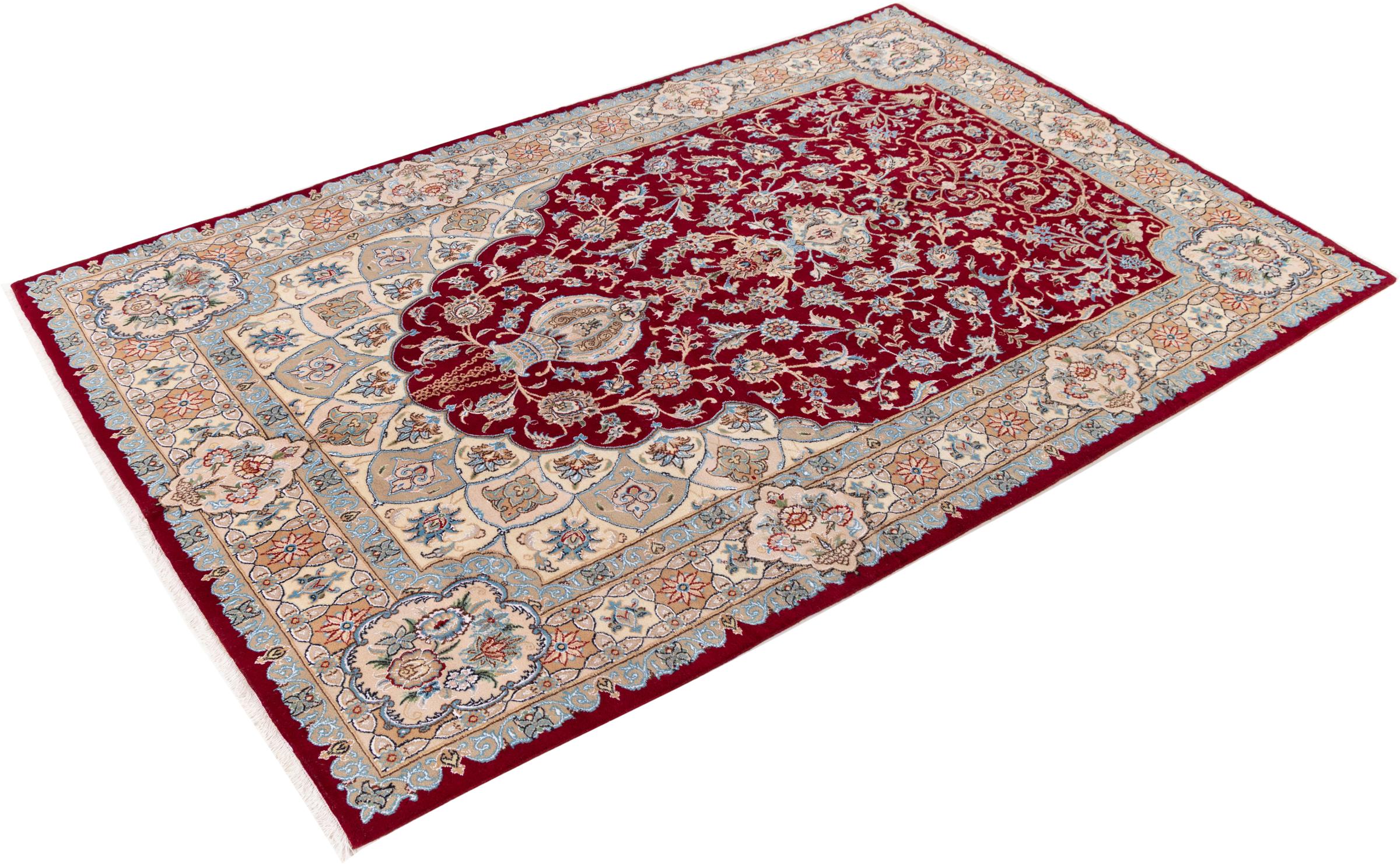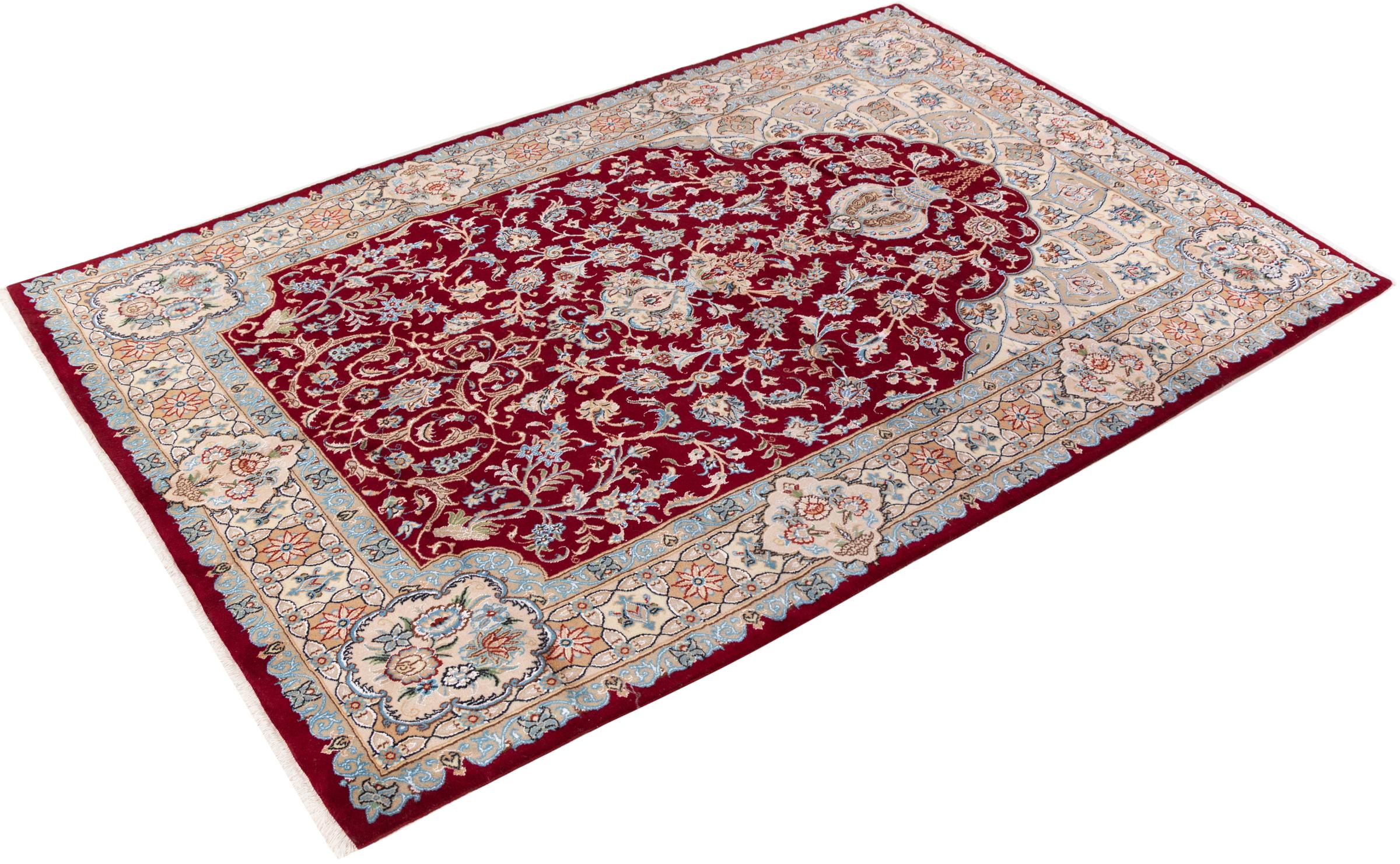 Ce tapis Nain est classifié 9La. La bonne qualité et le splendide design oriental avec ses motifs curvilignes inspirent chacun d’entre nous. Ce tapis persan était noué a la main avec de la laine précieuse et de la soie naturelle à Nain, une ville située à l’extrémité ouest du désert Dasht-e-Kavir.