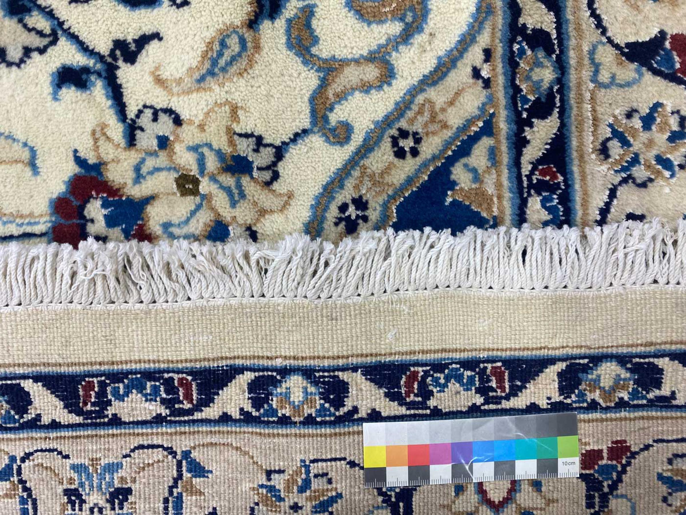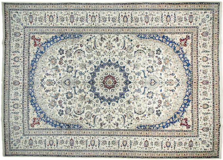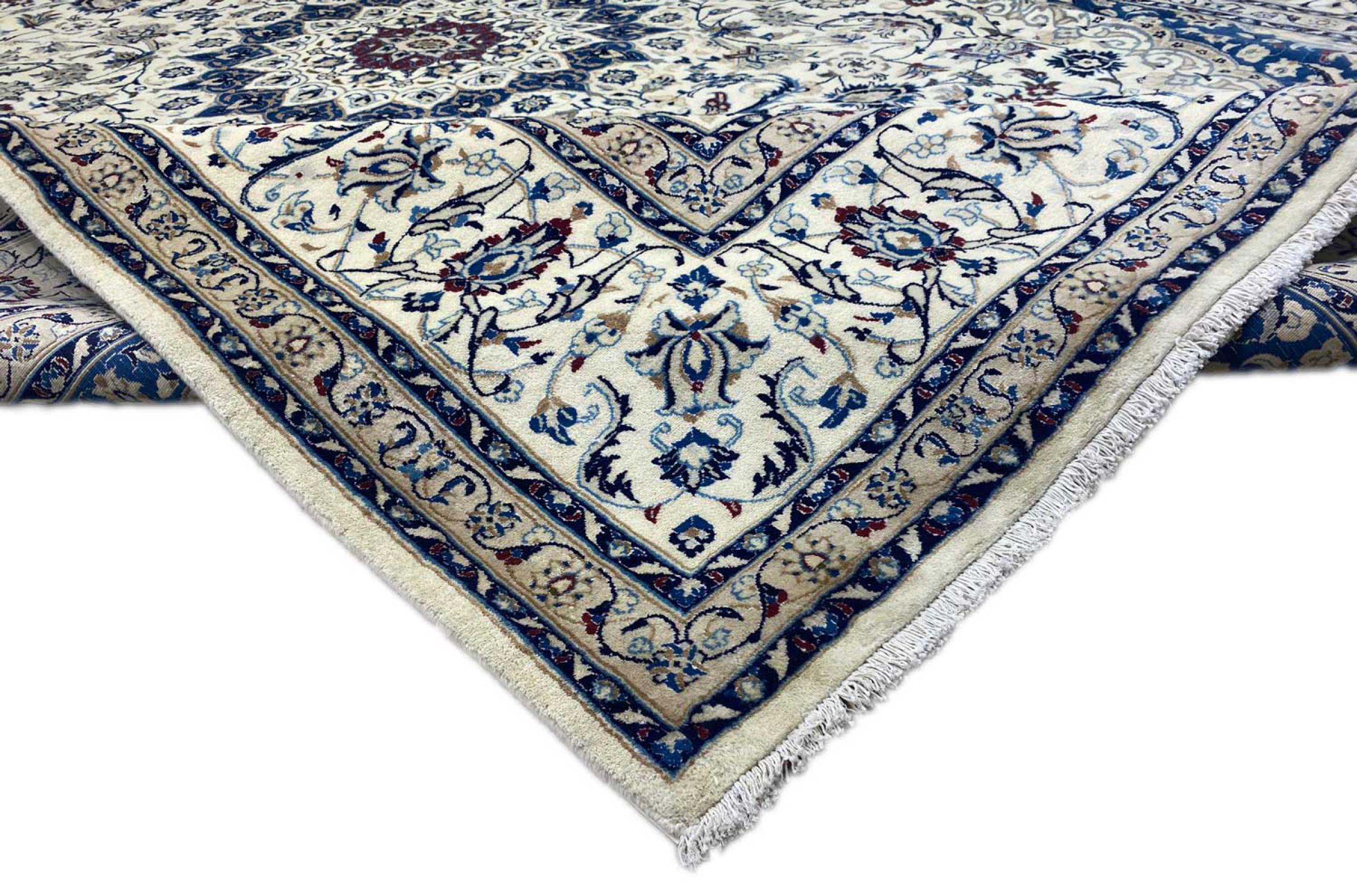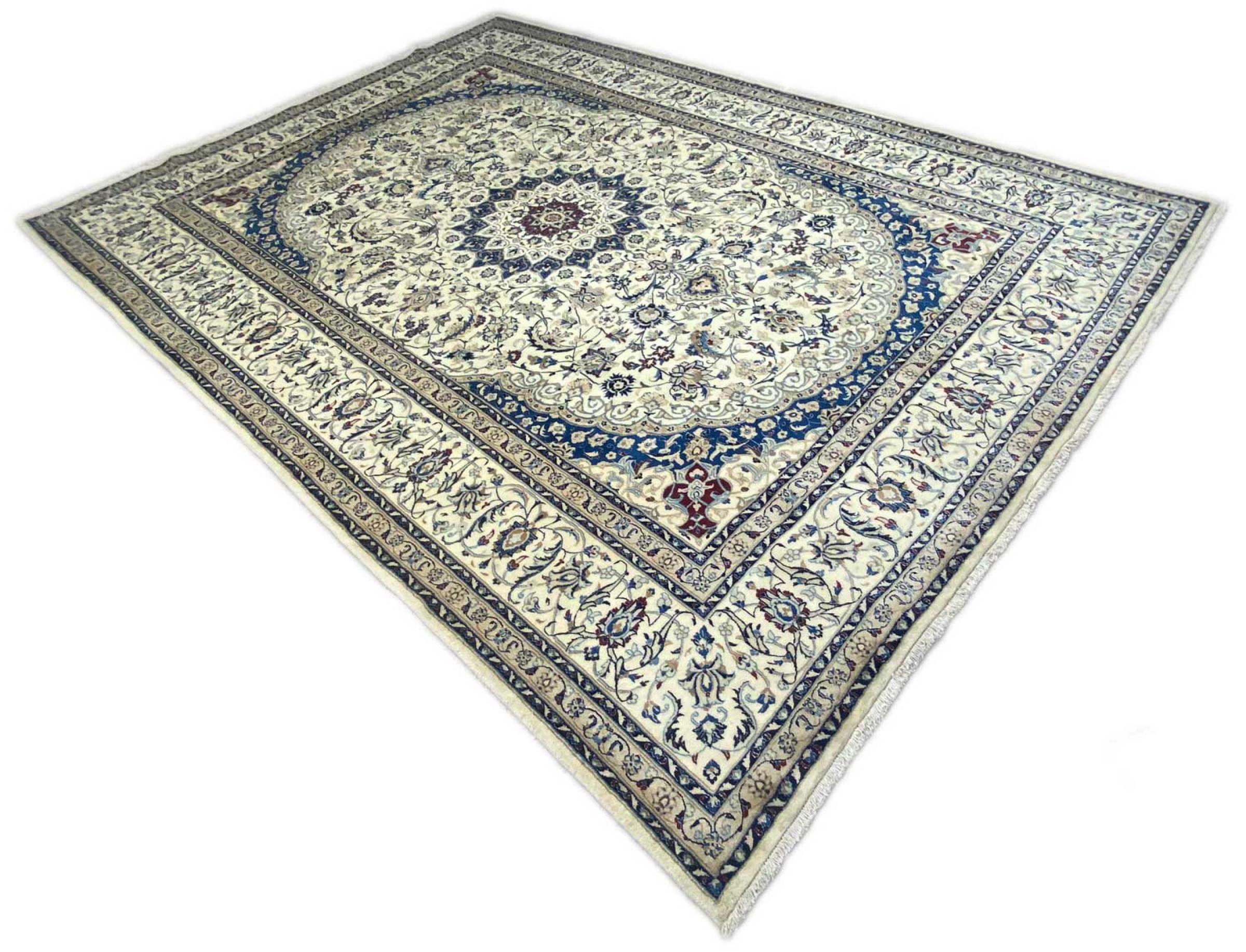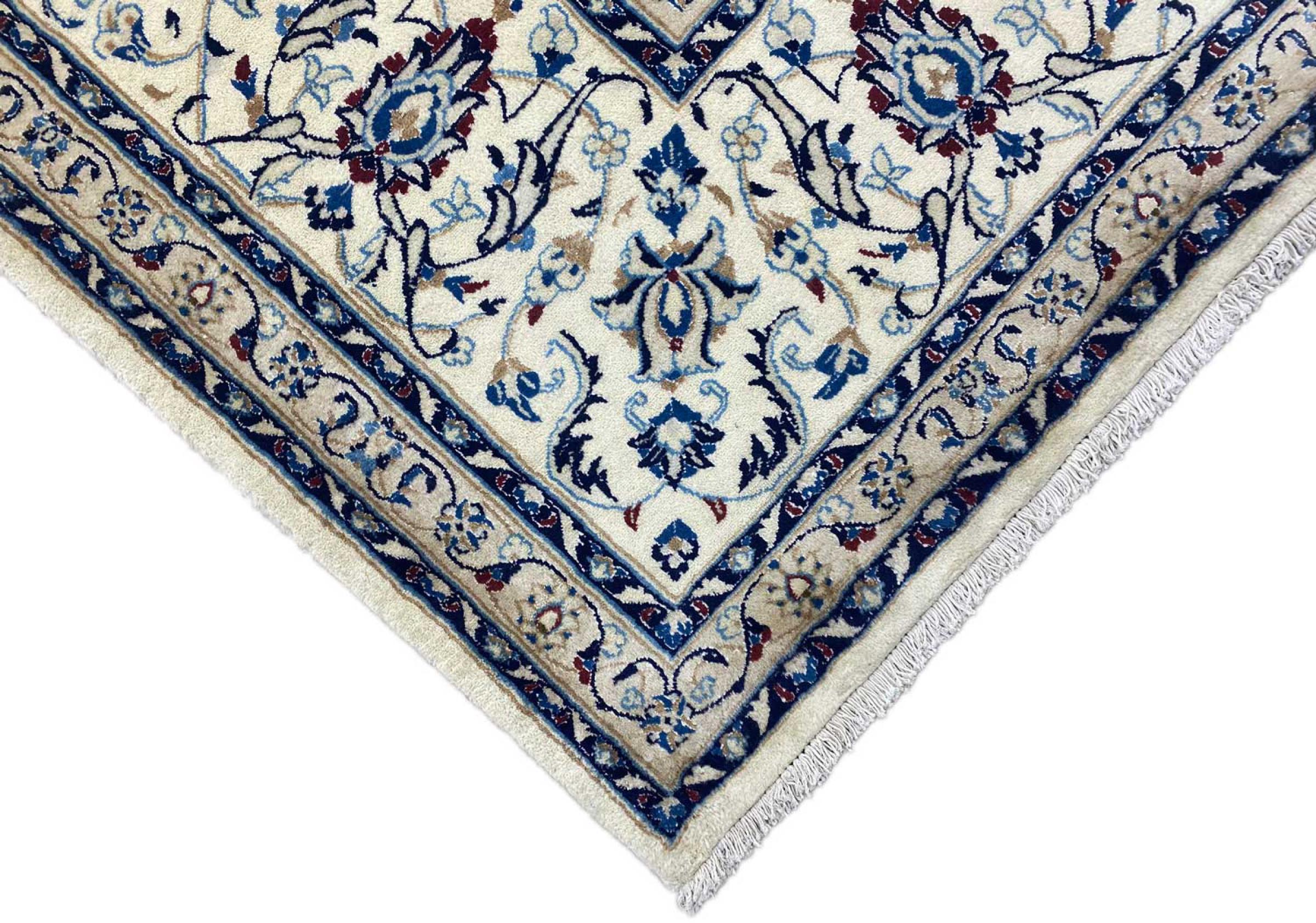 Les tapis de la ville de Nain, à la frontière de l'un des plus grands déserts d'Iran, comptent parmi les plus célèbres tapis persans du monde. Leur design typique est sans équivoque avec des ornements floraux, un médaillon central et des nuances de beige et de rouge ou de bleu. Grâce à leurs désignations 4La, 6La, 9La et 12La, les finesses d'un tapis Nain peuvent être vues d'un seul coup d'œil. Plus le chiffre "La" est bas, plus la densité des nœuds est élevée et donc plus le tapis est fin.