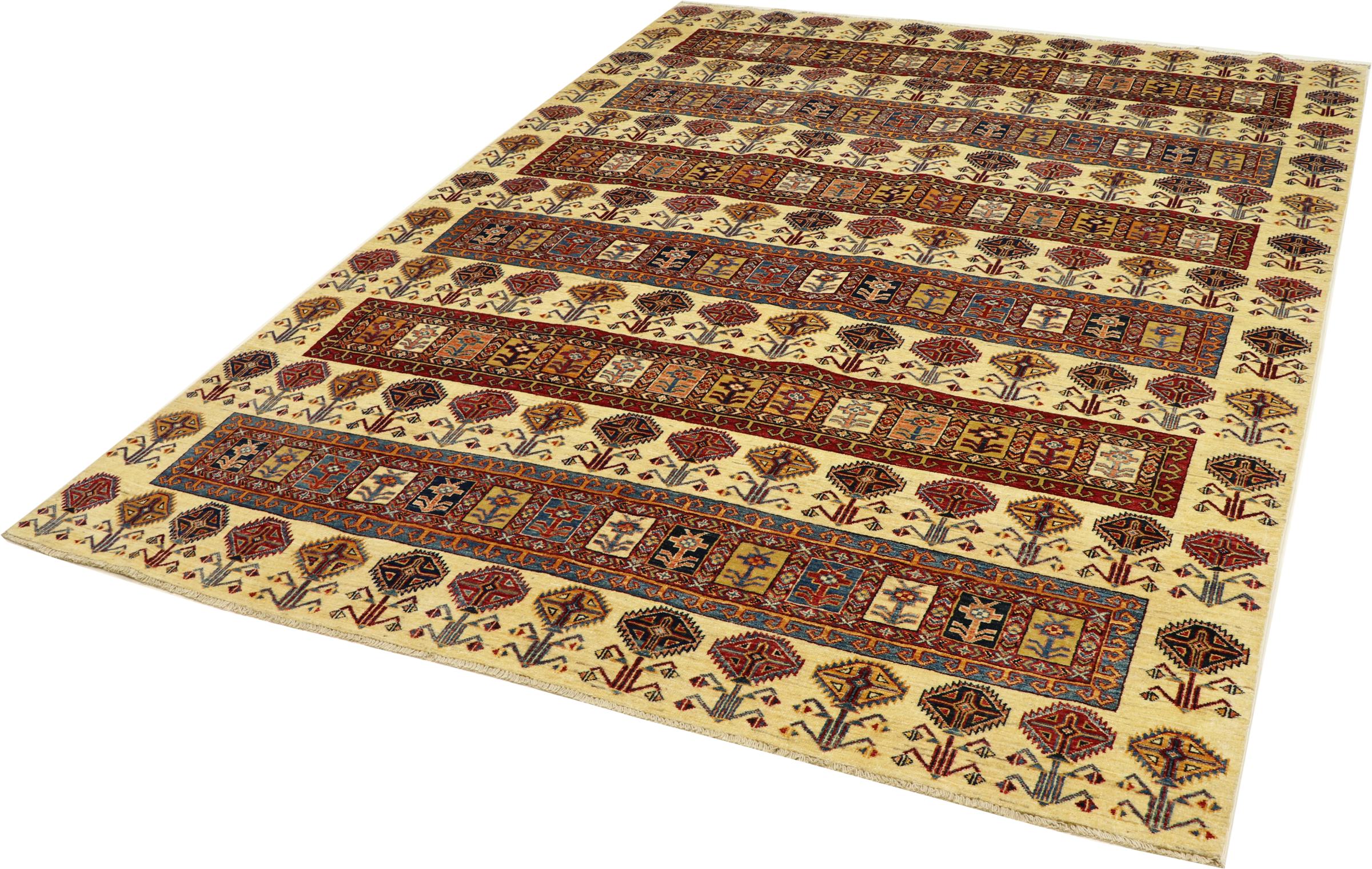 Ce tapis est fait de laine de mouton filée à la main de la plus haute qualité. En Iran (ancienne Perse), en Afghanistan et au Pakistan notamment, la laine est encore filée à la main avant que ne commence le nouage proprement dit du tapis. La laine a fait ses preuves en tant que matière naturelle et extrêmement résistante au fil des siècles. Il a notamment des propriétés antisalissures et d'isolation thermique. En même temps, la laine est incomparablement douce et a un éclat naturel.