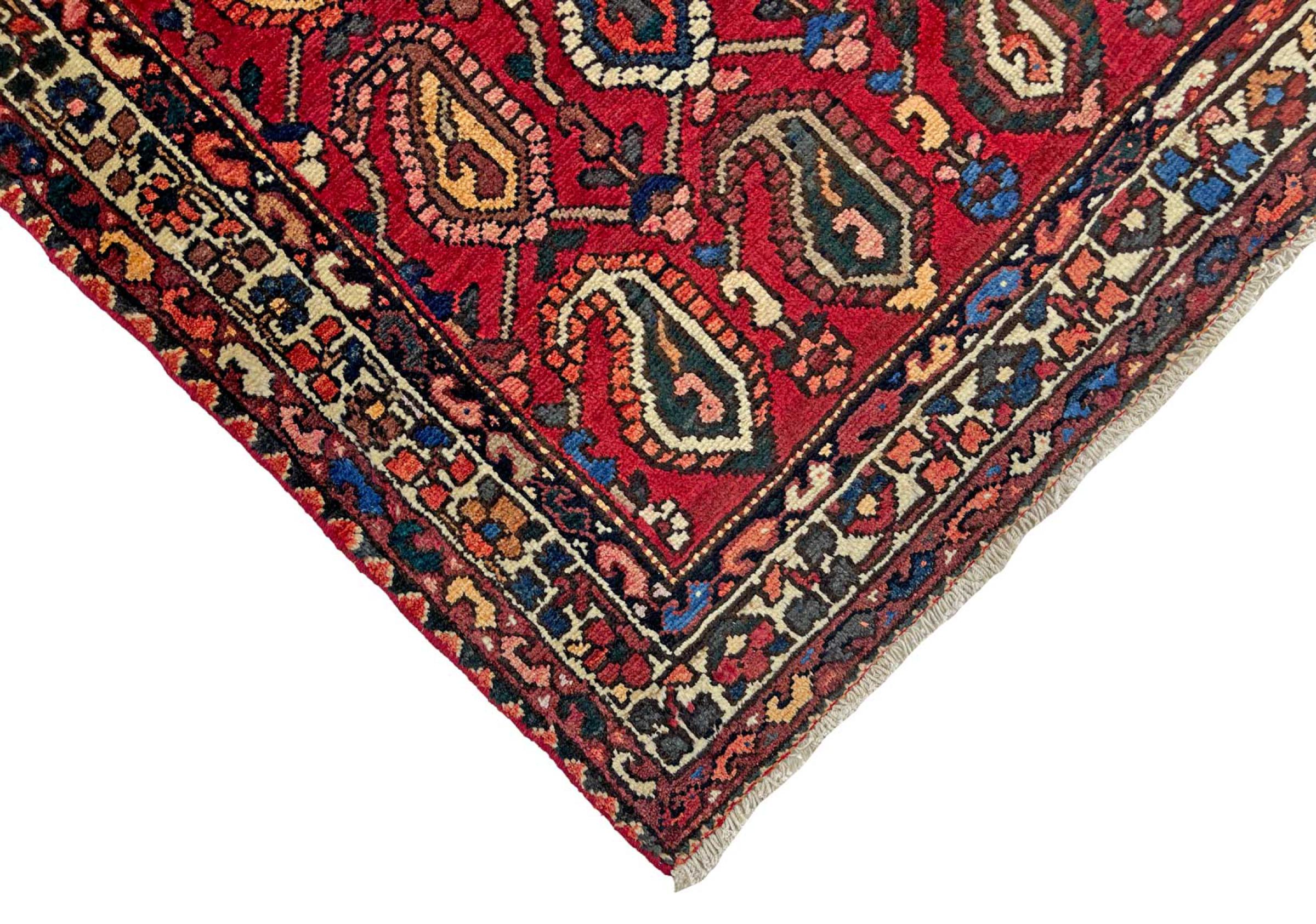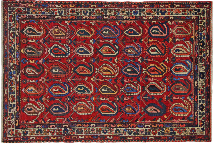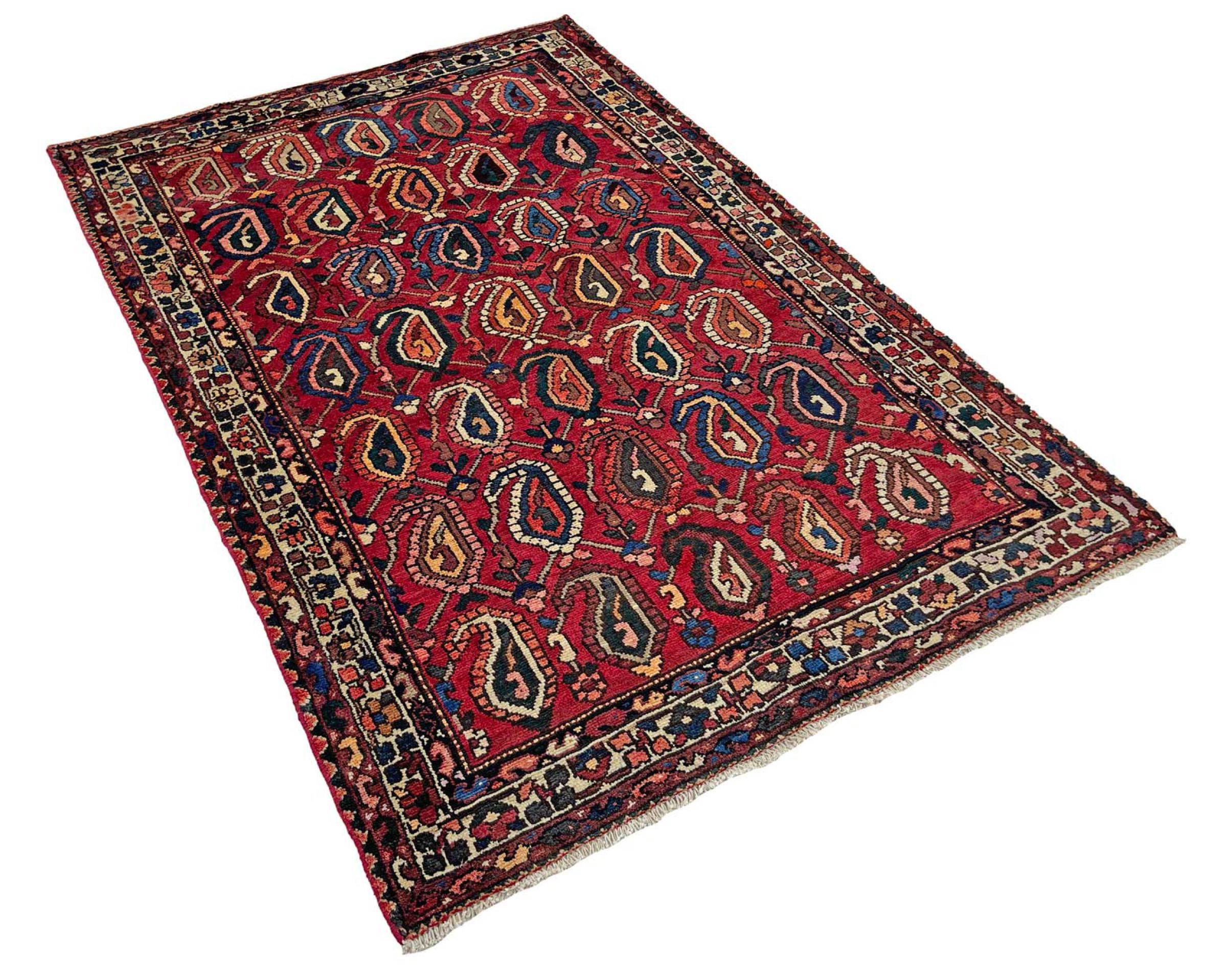 Ce tapis appartient aux tapis de village et de nomade d'Iran, anciennement la Perse. Ce type de tapis est noué à la main dans les petites villes et les villages selon l'ancienne tradition. Même les nomades nouent encore des tapis persans en plein air. Les tapis sont noués sans schéma et entièrement à partir de la tête. Ils se caractérisent par des ornements classiques, qui sont disposés en motifs droits et géométriques. Grâce à leur origine culturelle et traditionnelle, ces tapis ont un caractère unique qui incarne la Perse ancienne.