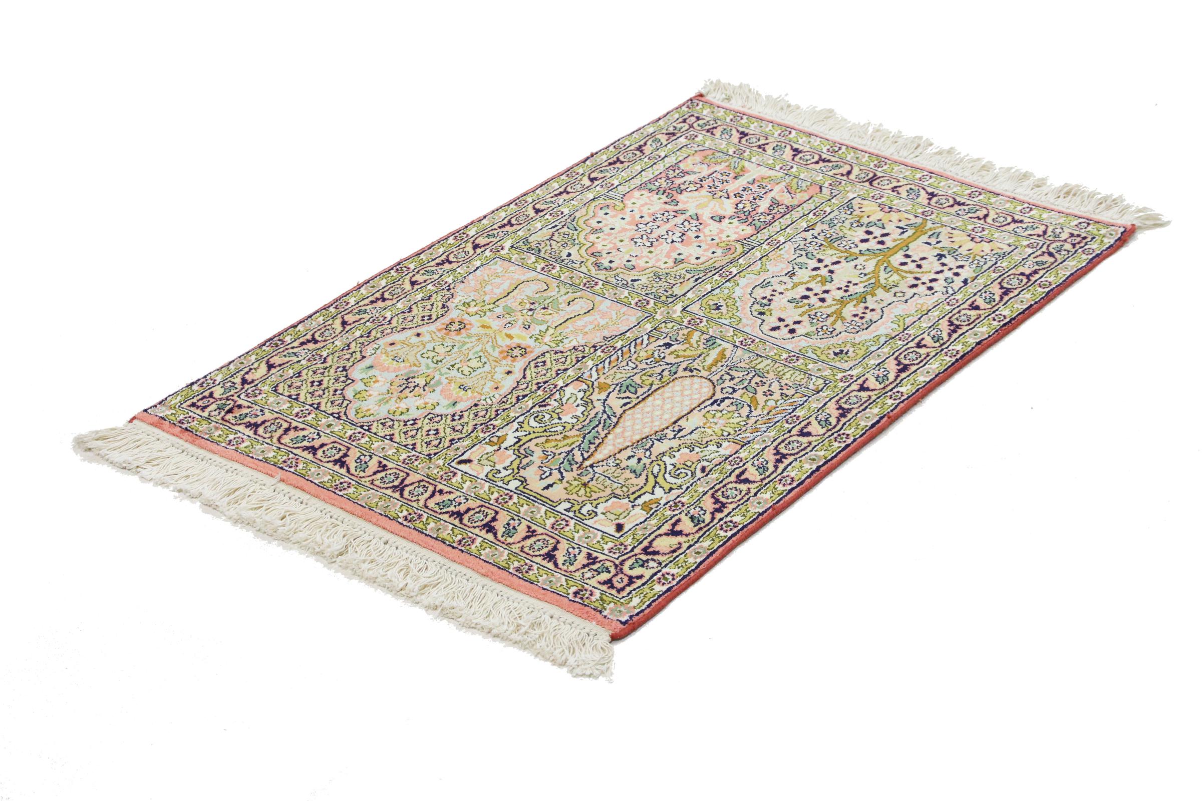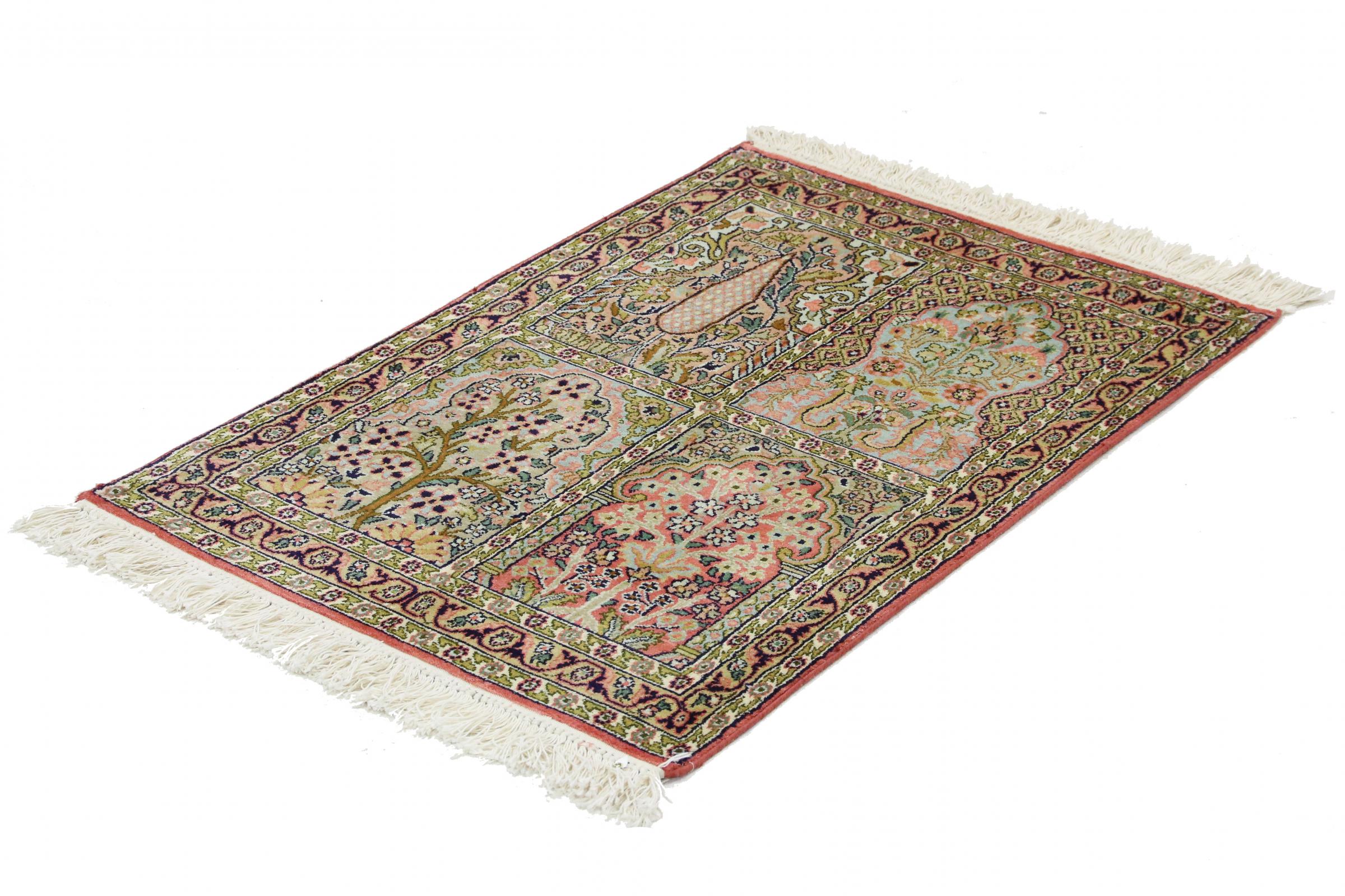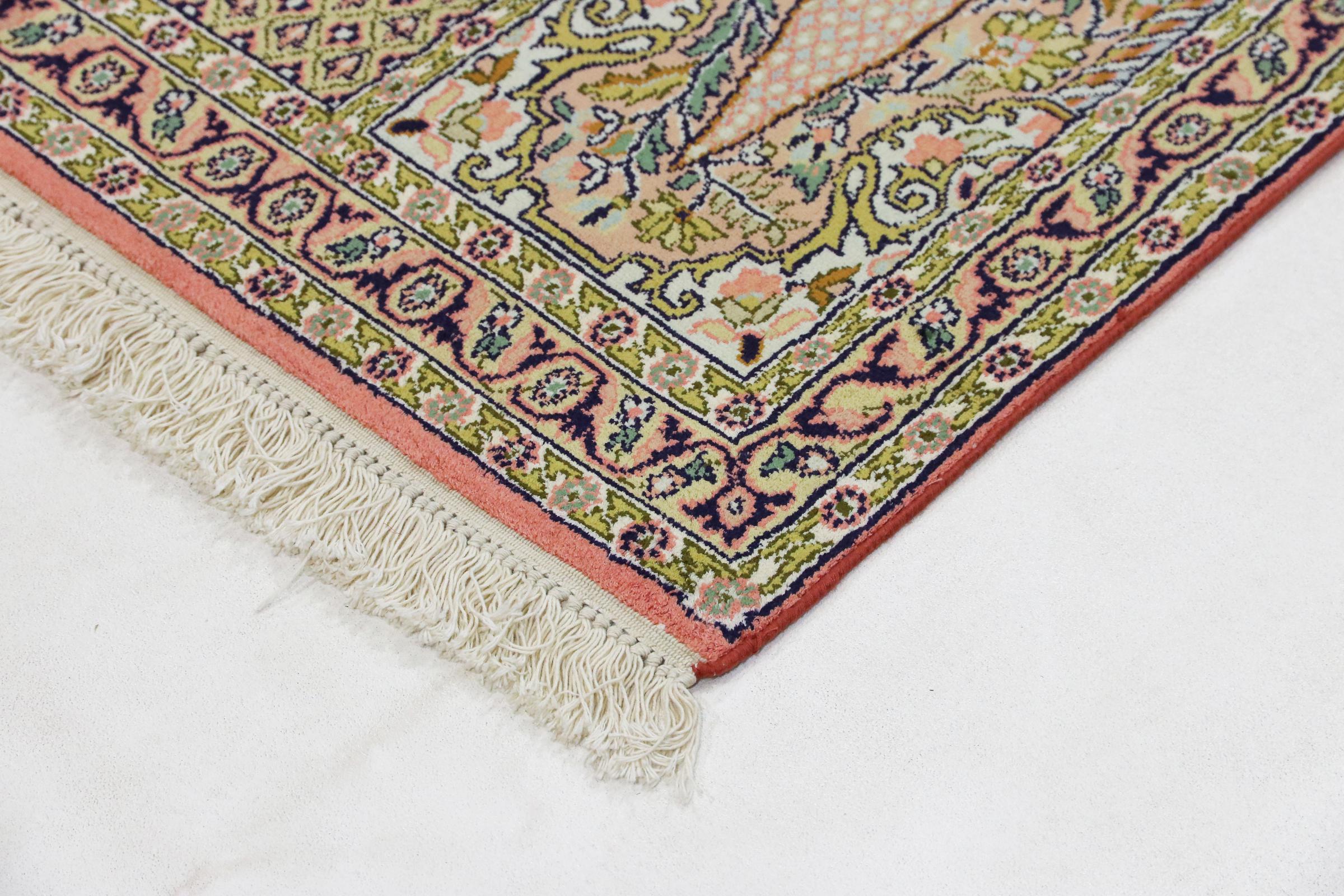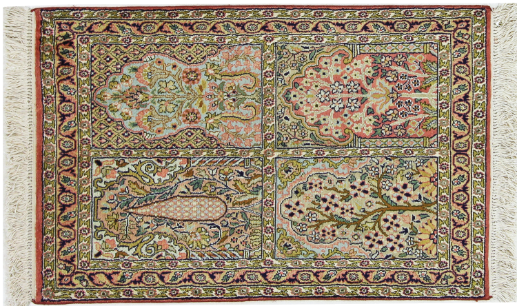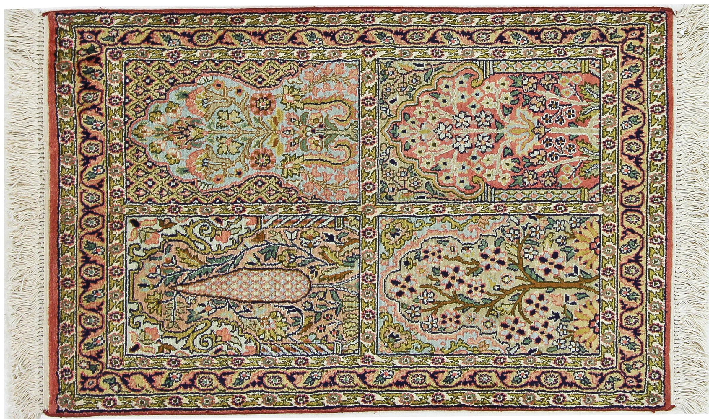 Réf. Article: 70603002379391 Taille: 93x61 cm Épaisseur: ap. 4 mm Densité de nouage: 500 000 - 550 000 / m² Fabrication: Noué à la main Velours: Soie Chaîne: Coton Origine: Inde Âge: Nouveau Poids: ap. 1 kg Nombre en stock: Unique