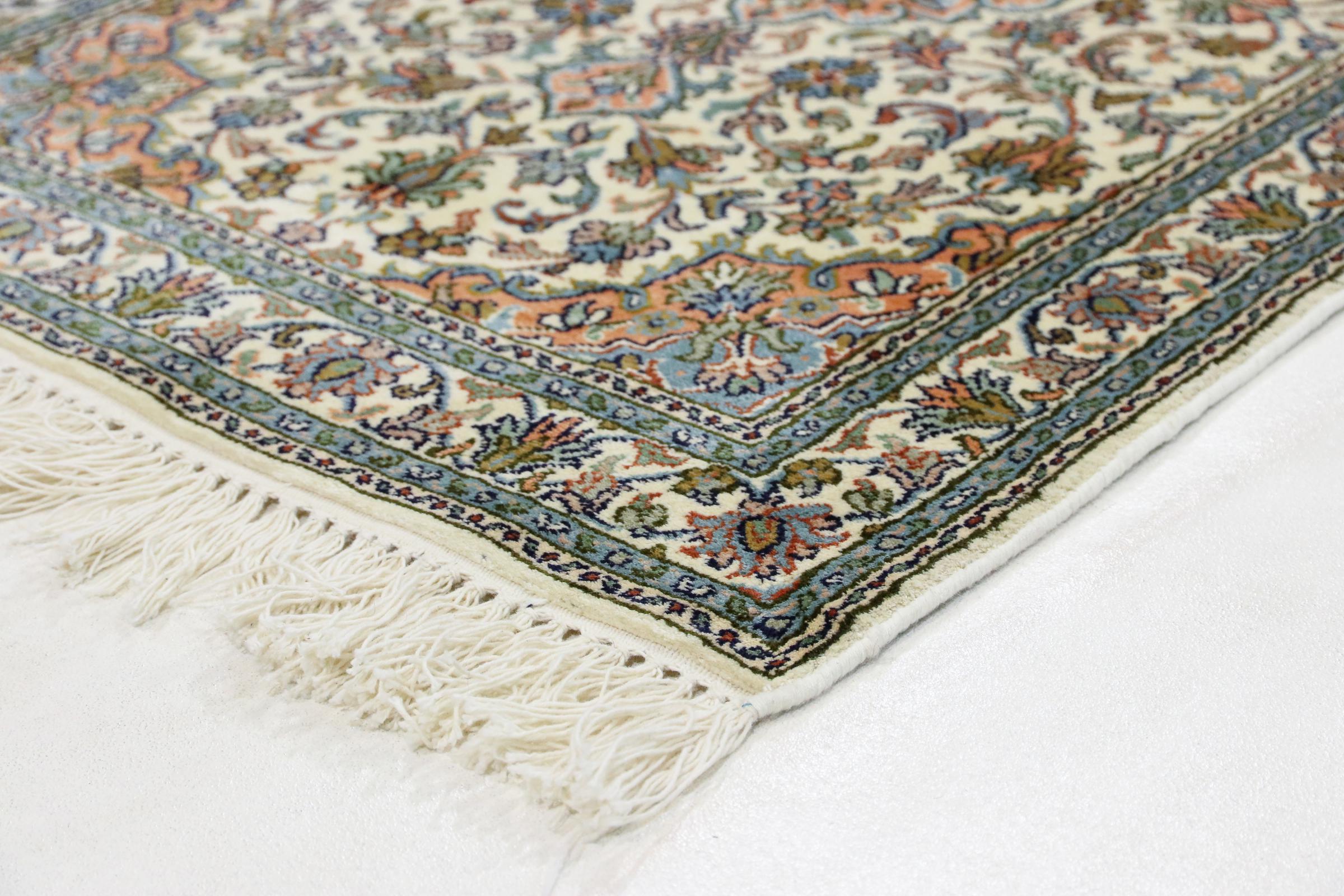 Réf. Article: 70599005064243 Taille: 96x62 cm Épaisseur: ap. 4 mm Densité de nouage: 500 000 - 550 000 / m² Fabrication: Noué à la main Velours: Soie Chaîne: Coton Origine: Inde Âge: Nouveau Poids: ap. 1 kg Nombre en stock: Unique