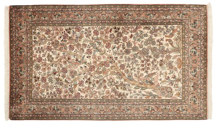 Réf. Article: 309171001529686 Taille: 131x78 cm Épaisseur: ap. 4 mm Densité de nouage: 720 000 / m² Fabrication: Noué à la main Velours: Soie Chaîne: Soie Origine: Inde Âge: Nouveau Poids: ap. 2 kg Nombre en stock: Unique - Seulement 1 en stock
