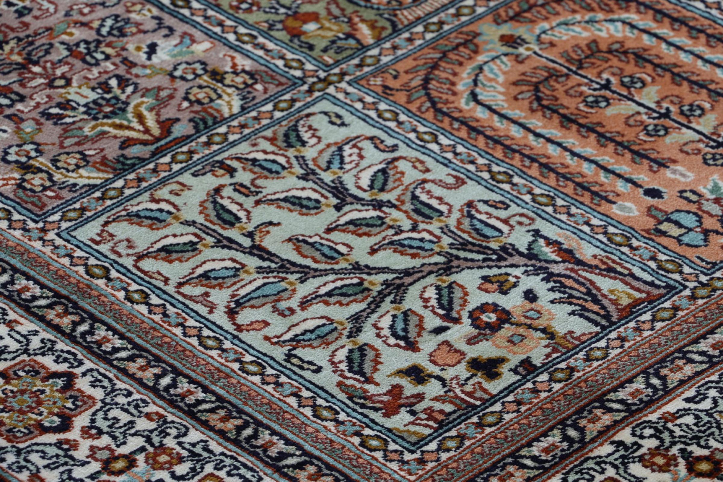 Ce splendide tapis de soie noué à la main originaire de Kashmir reflète le savoir-faire des noueurs de tapis indiens, qui utilisent les meilleurs matériaux pour former des motifs à couper le soufflé. Une pièce de luxe, juste pour vous.