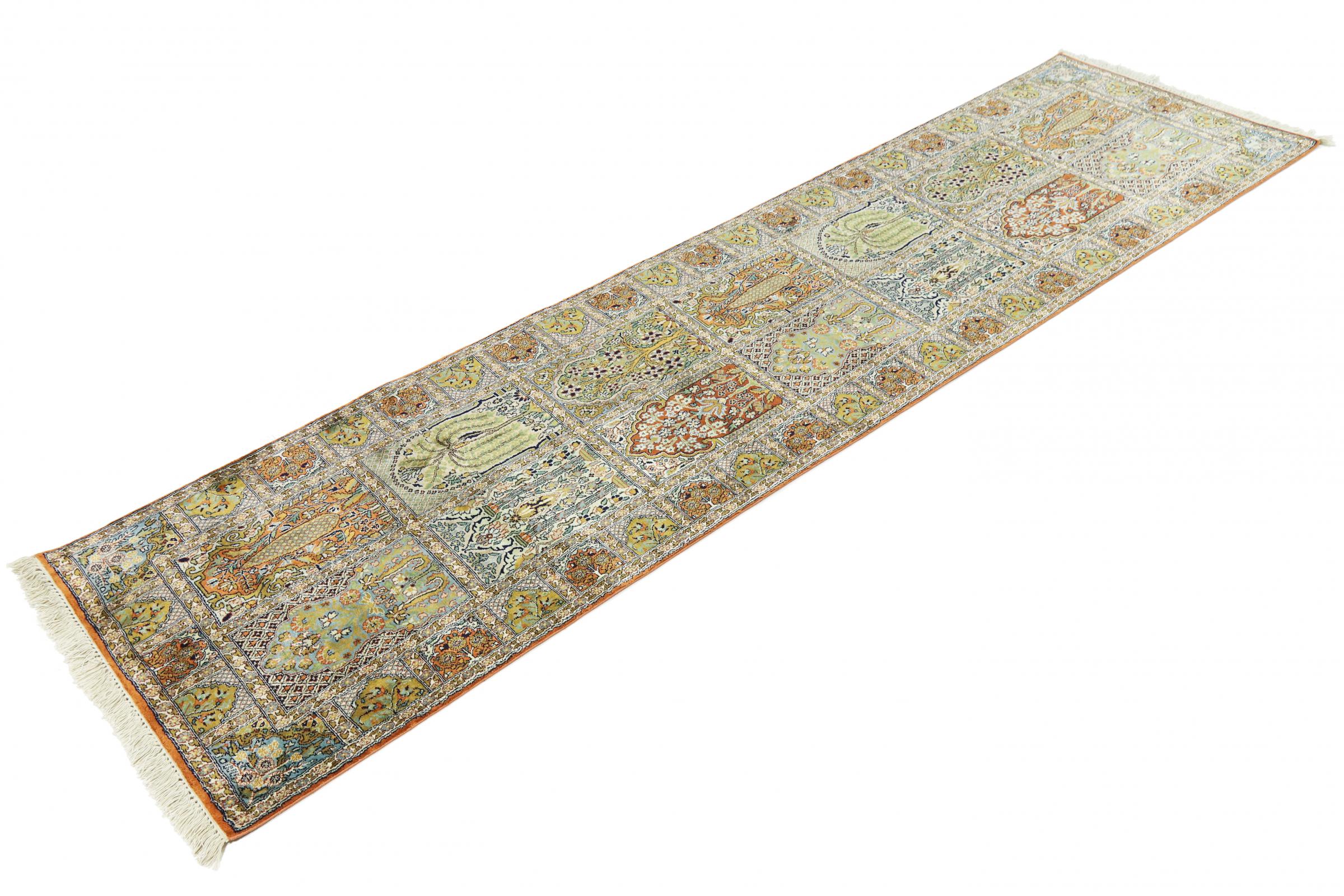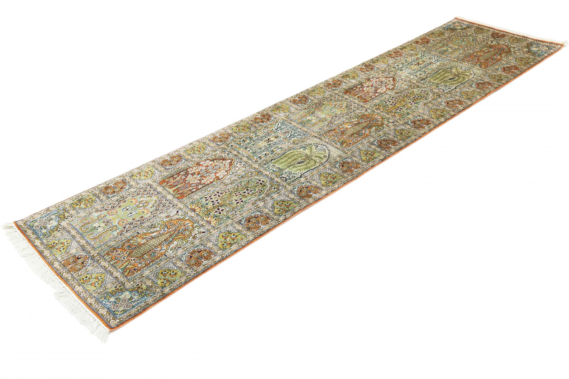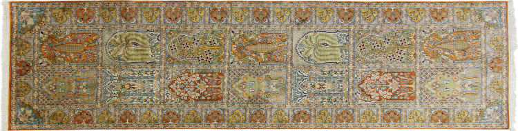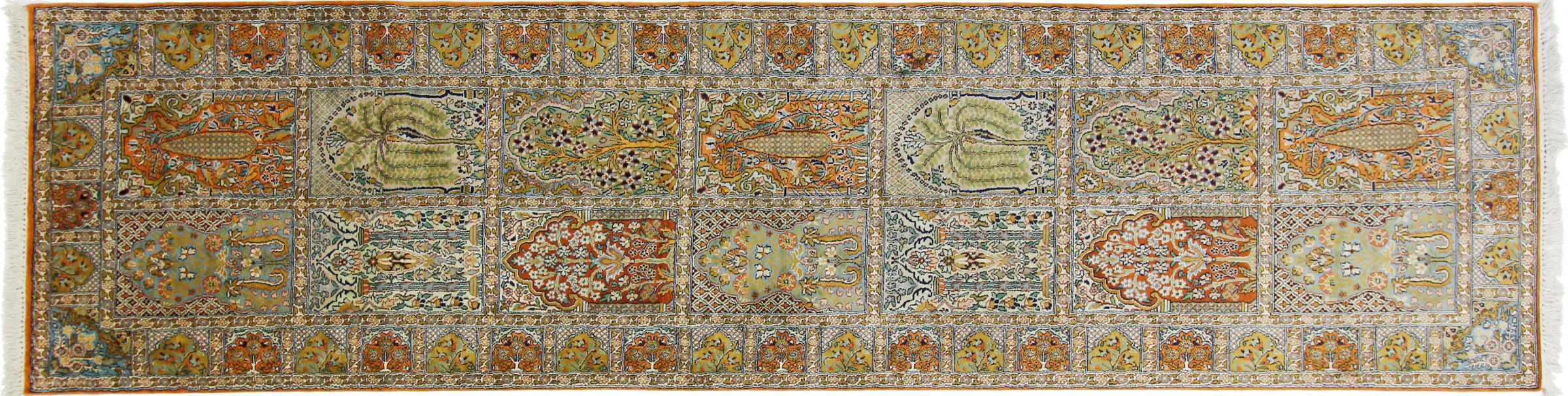 Réf. Article: 13641100481667 Taille: 319x80 cm Épaisseur: ap. 4 mm Densité de nouage: 440 000 - 490 000 / m² Fabrication: Noué à la main Velours: Soie Chaîne: Coton Origine: Inde Âge: Nouveau Poids: ap. 5 kg Nombre en stock: Unique