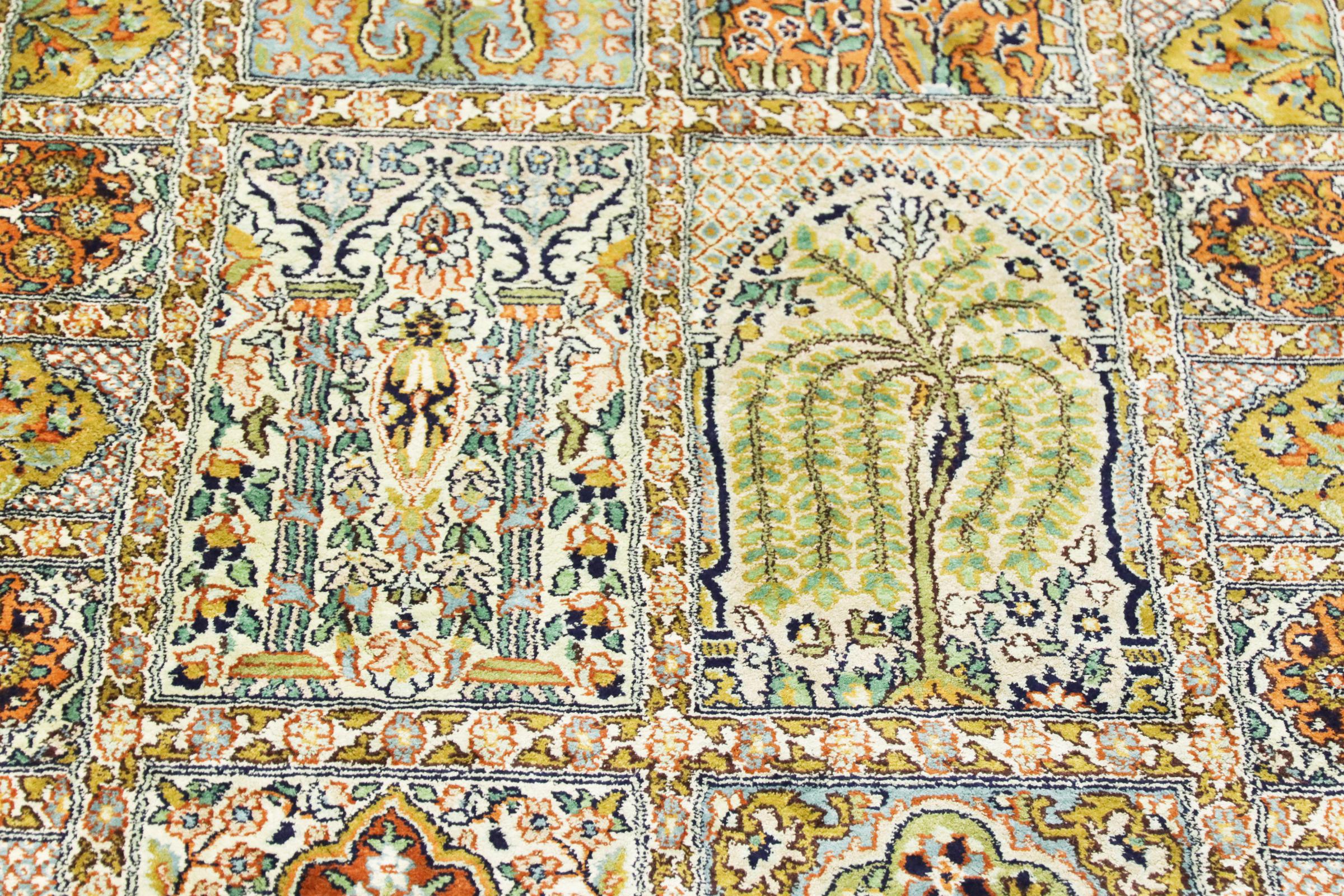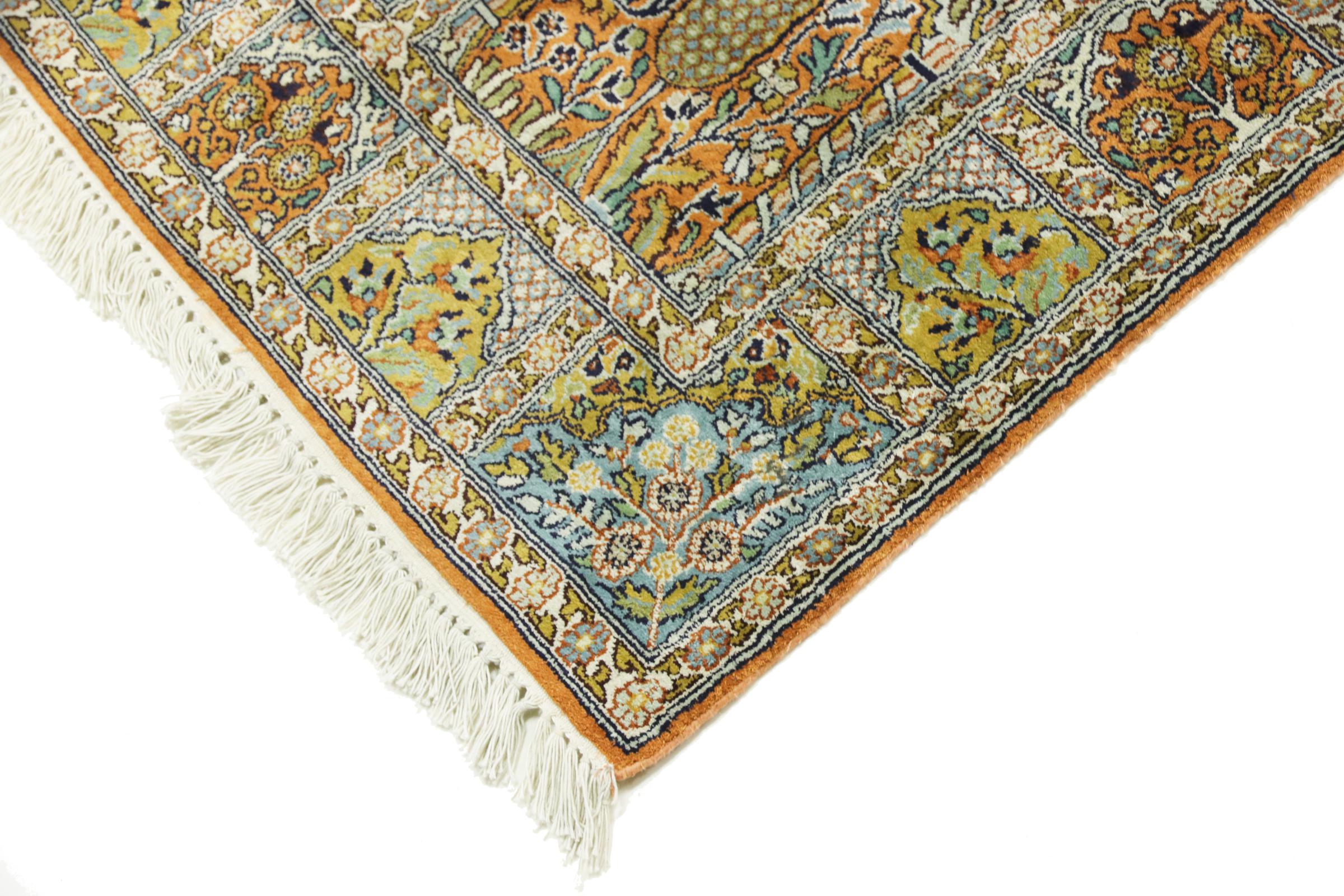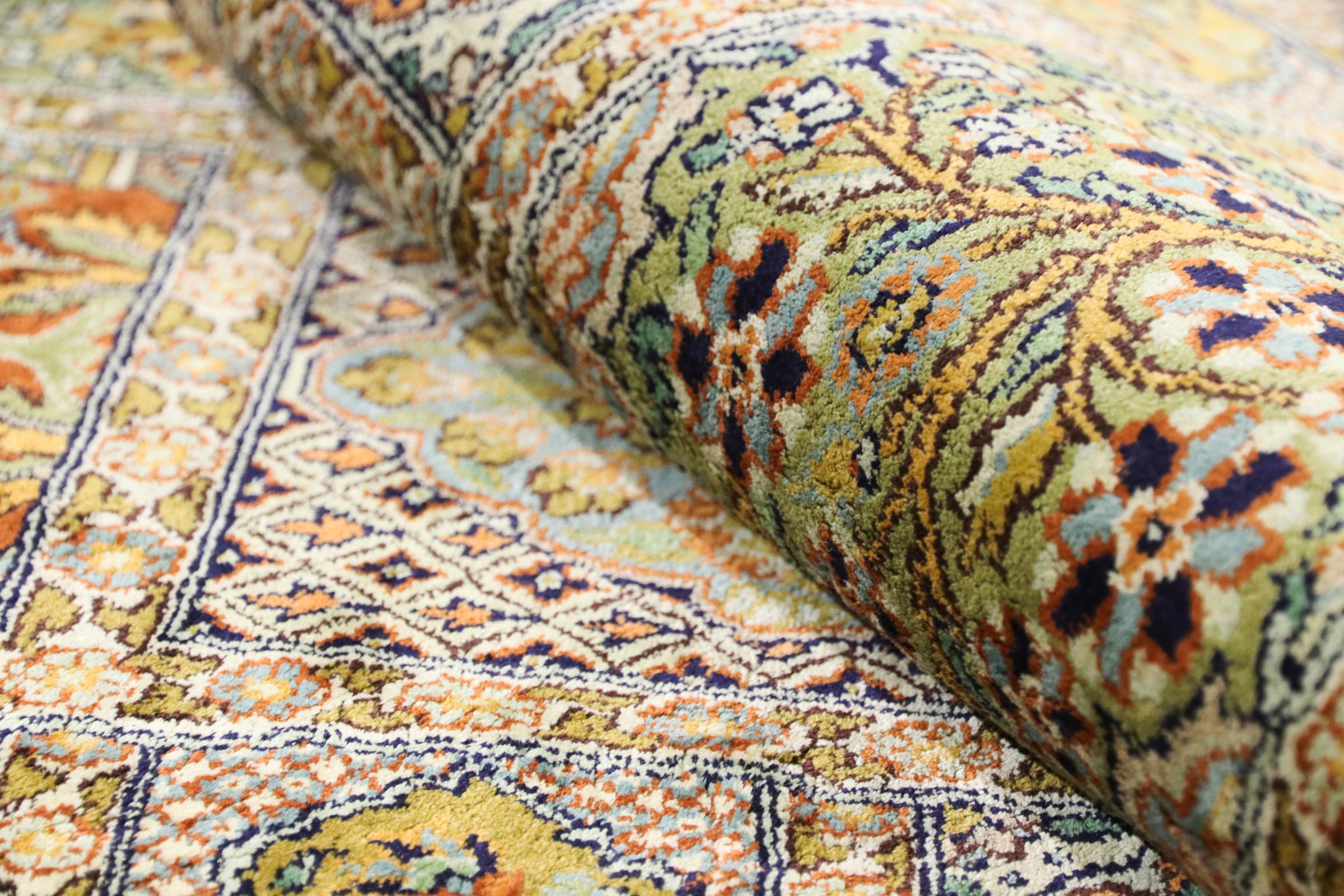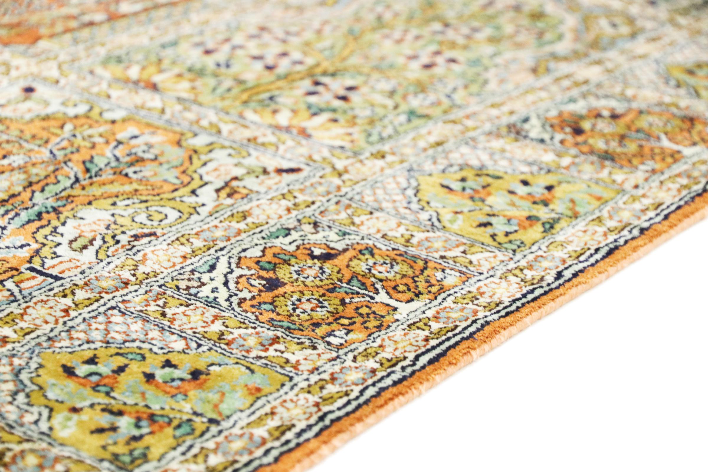 Ce splendide tapis de soie noué à la main originaire de Kashmir reflète le savoir-faire des noueurs de tapis indiens, qui utilisent les meilleurs matériaux pour former des motifs à couper le soufflé. Une pièce de luxe, juste pour vous.