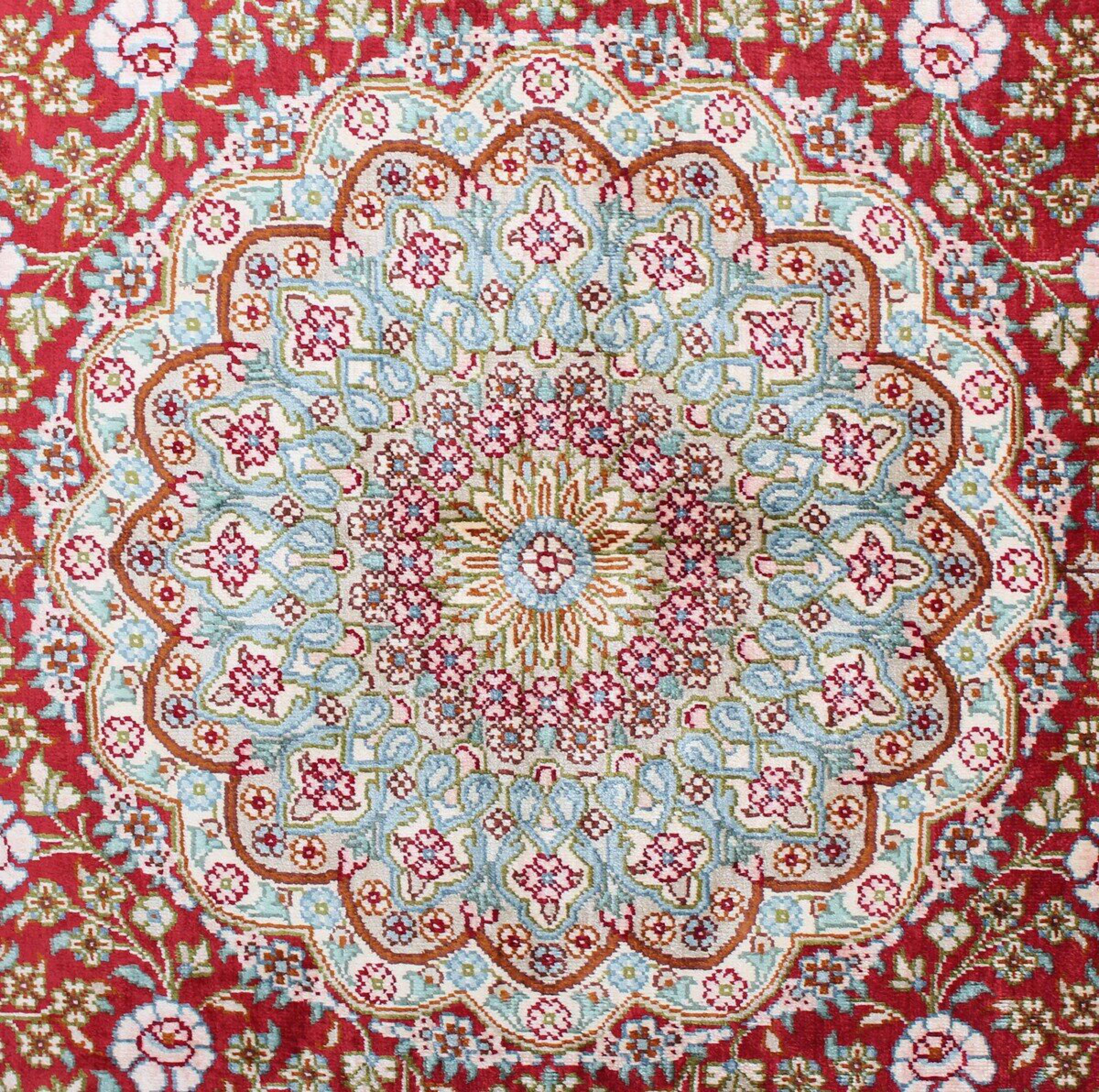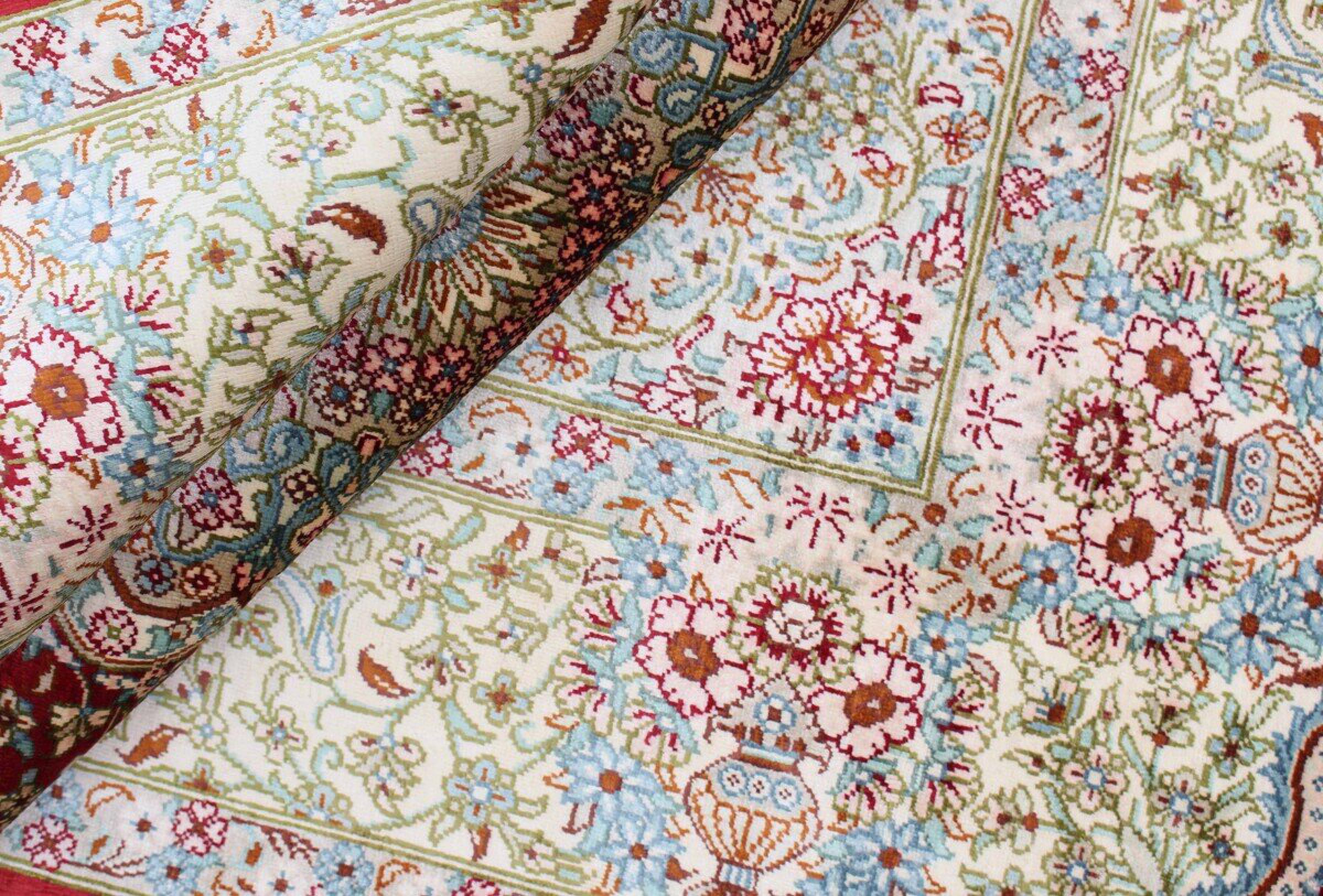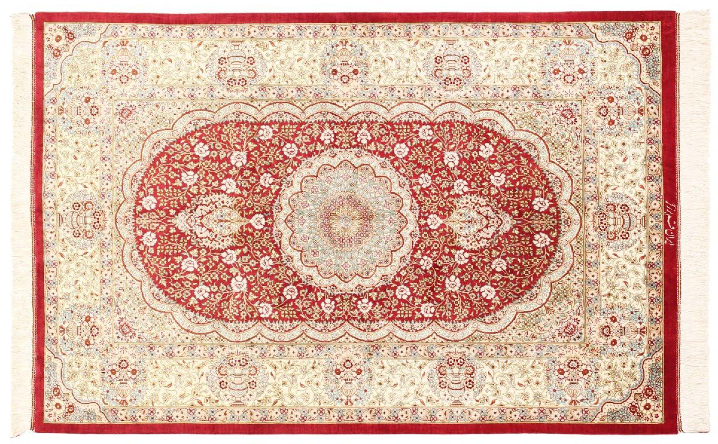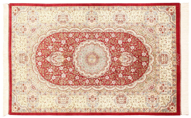 Réf. Article: 24420001157235 Taille: 144x96 cm Épaisseur: ap. 3 mm Densité de nouage: 1 000 000 / m² Fabrication: Noué à la main Velours: Soie Chaîne: Soie Origine: Persie / Iran Âge: Nouveau Poids: ap. 3 kg Nombre en stock: Unique - Seulement 1 en stock