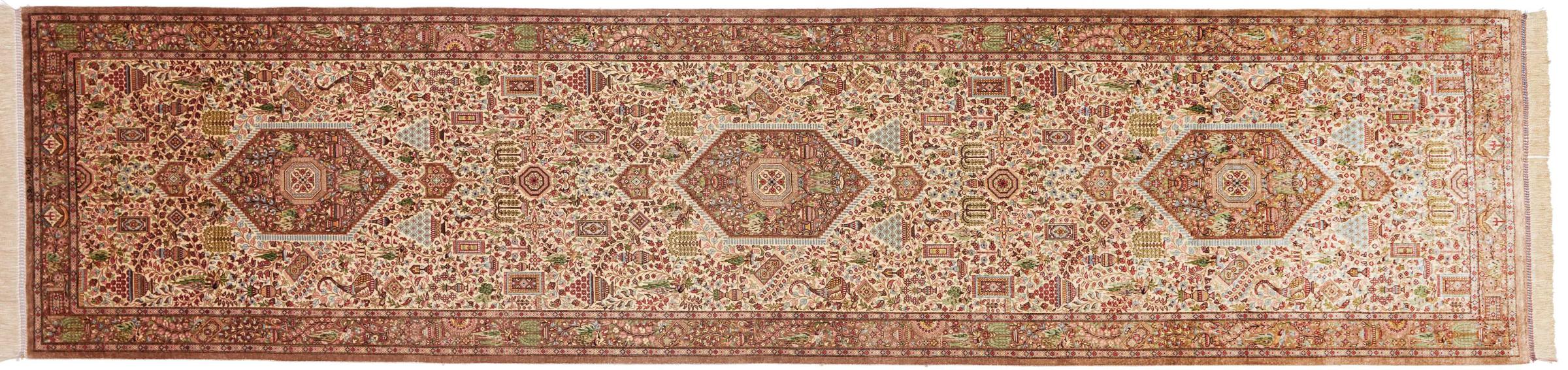 Réf. Article: 306183003113376 Taille: 298x69 cm Épaisseur: ap. 3 mm Densité de nouage: 800 000 / m² Fabrication: Noué à la main Velours: Soie Chaîne: Coton Origine: Persie / Iran Âge: Nouveau Poids: ap. 4 kg Nombre en stock: Unique - Seulement 1 en stock