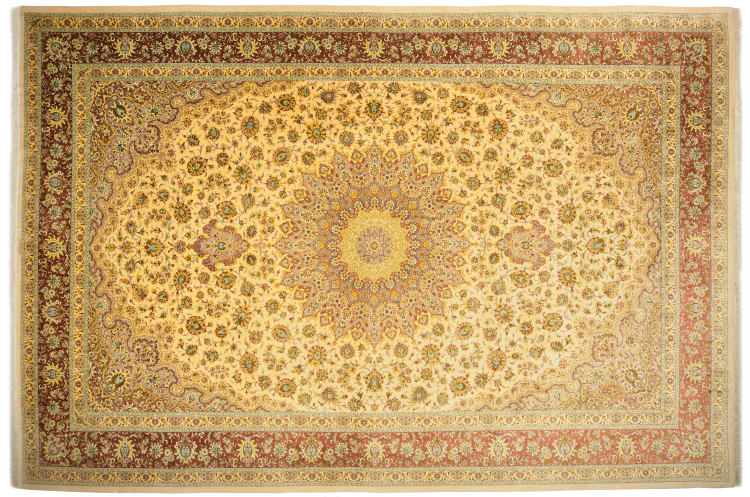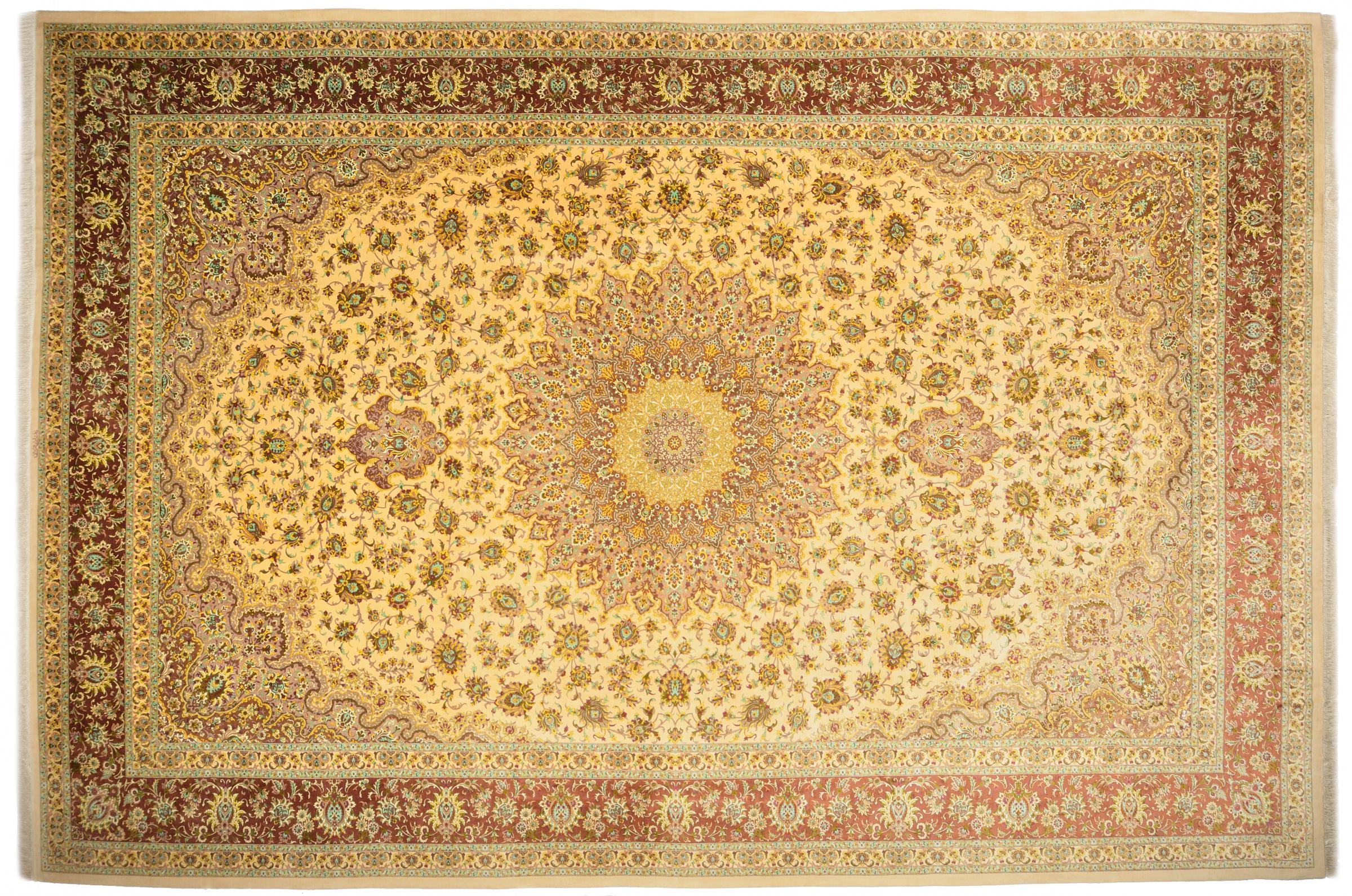 Réf. Article: 127419007411029 Taille: 593x399 cm Épaisseur: ap. 3 mm Densité de nouage: 1 000 000 / m² Fabrication: Noué à la main Velours: Soie Chaîne: Soie Origine: Persie / Iran Âge: Nouveau Poids: ap. 47 kg Nombre en stock: Unique - Seulement 1 en stock