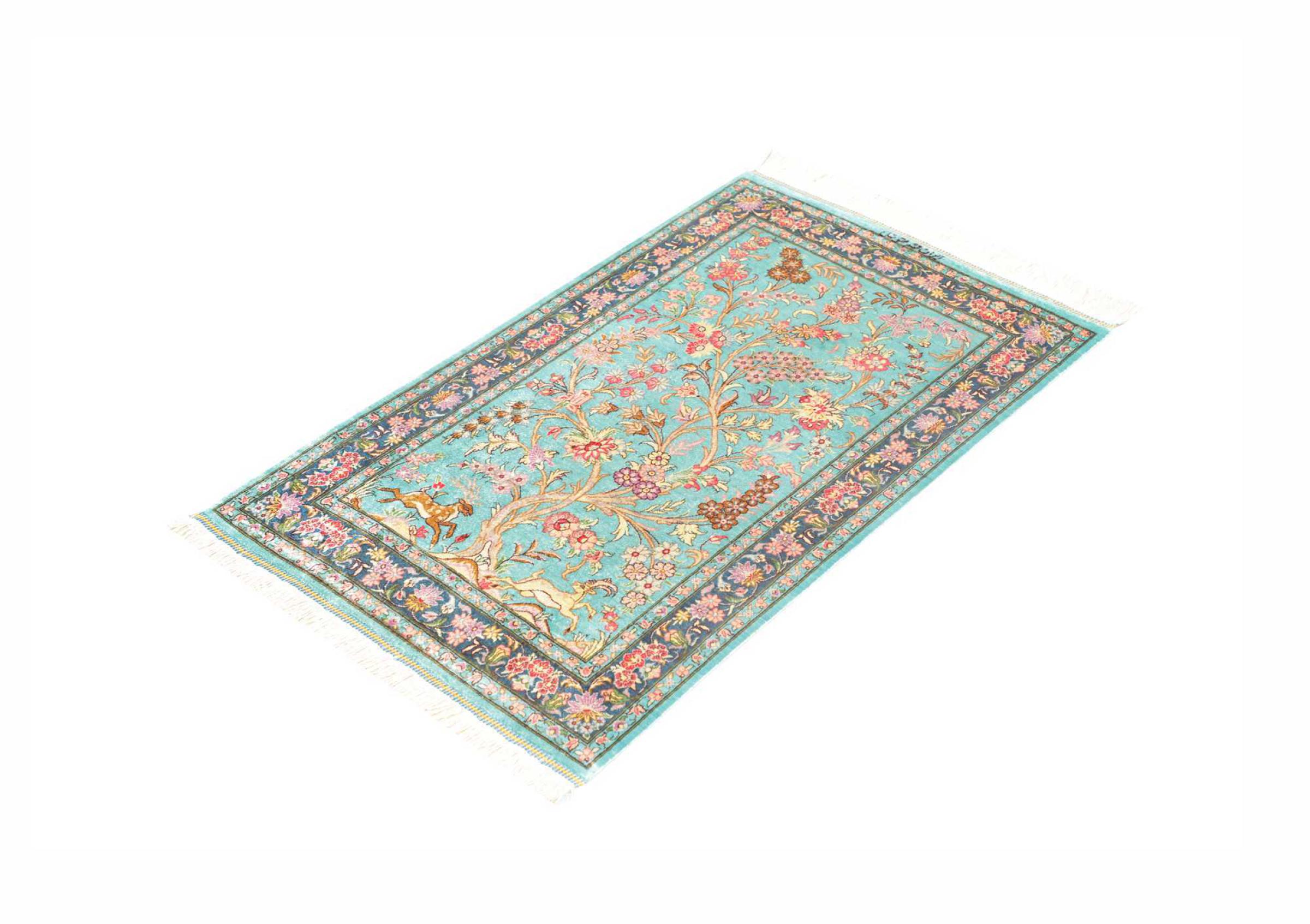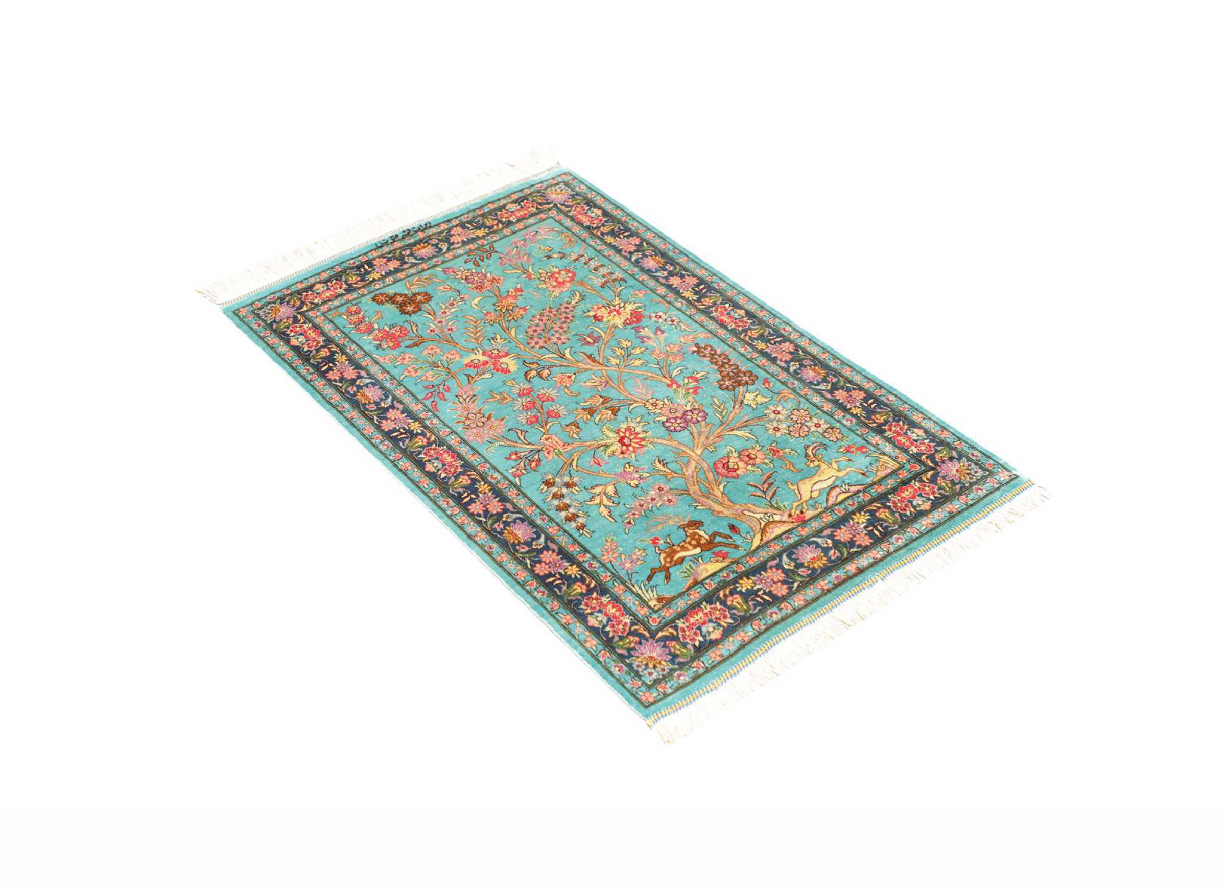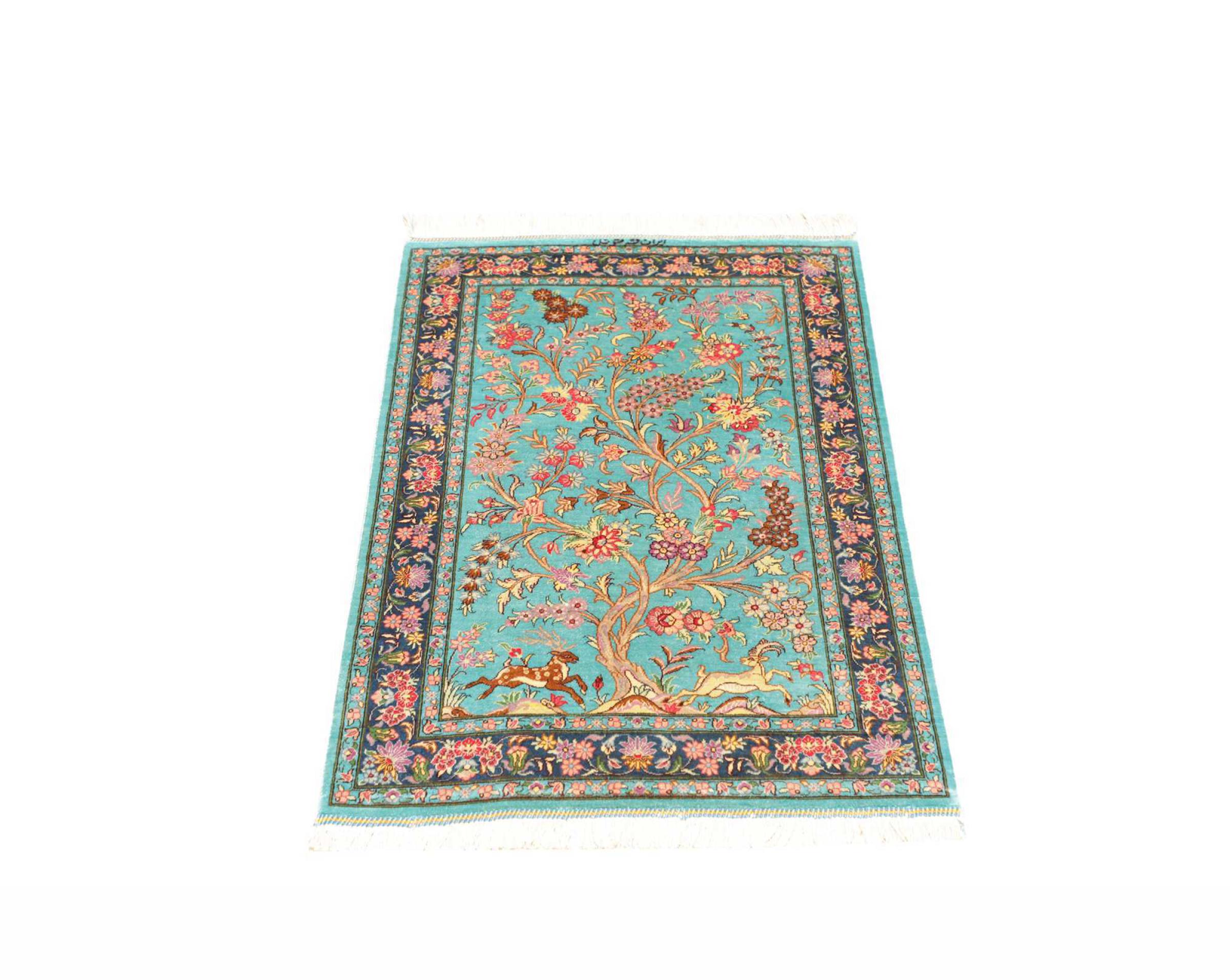 Réf. Article: 306189001369663 Taille: 87x56 cm Épaisseur: ap. 3 mm Densité de nouage: 800 000 / m² Fabrication: Noué à la main Velours: Soie Chaîne: Coton Origine: Persie / Iran Âge: Nouveau Poids: ap. 1 kg Nombre en stock: Unique - Seulement 1 en stock
