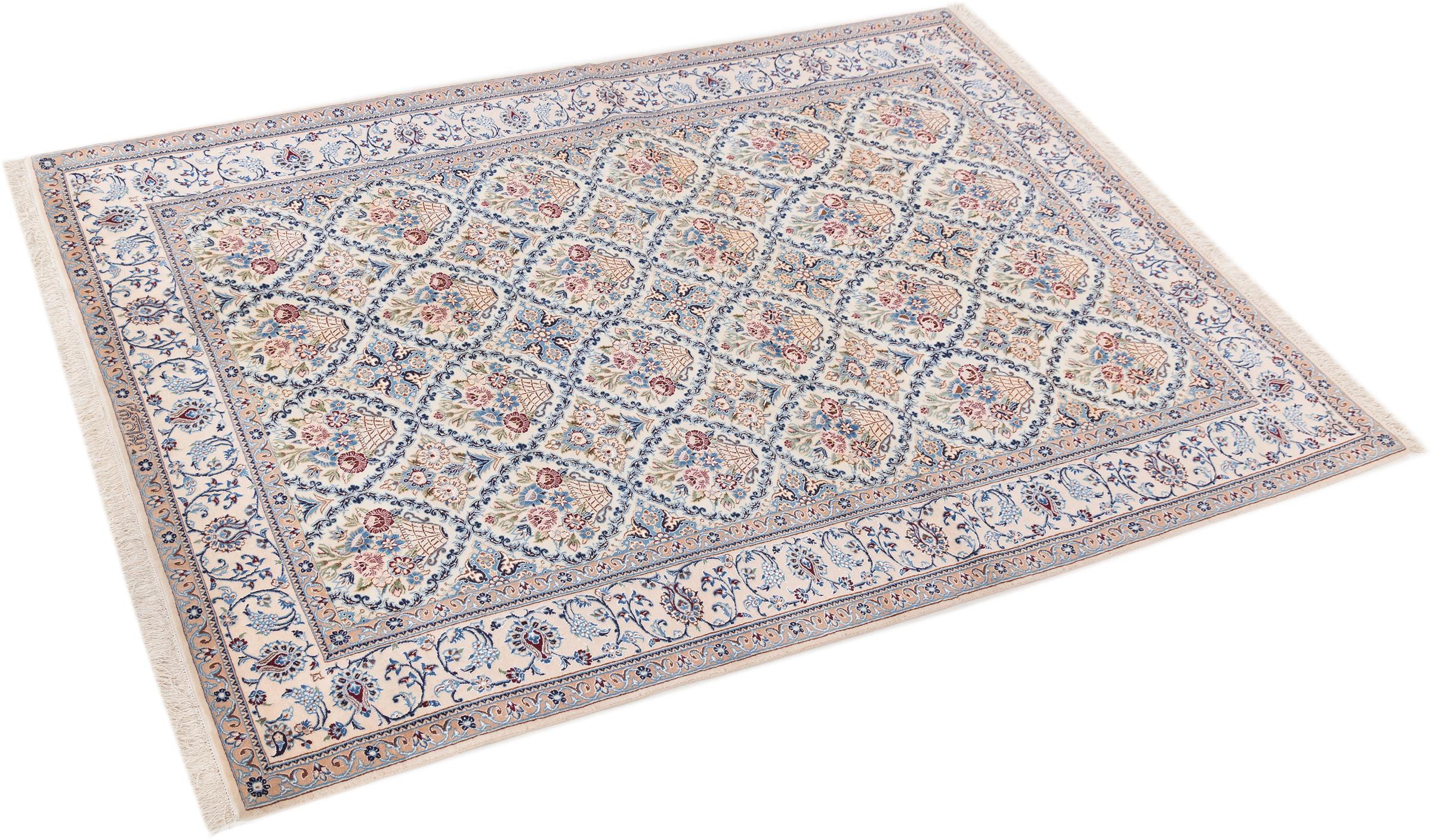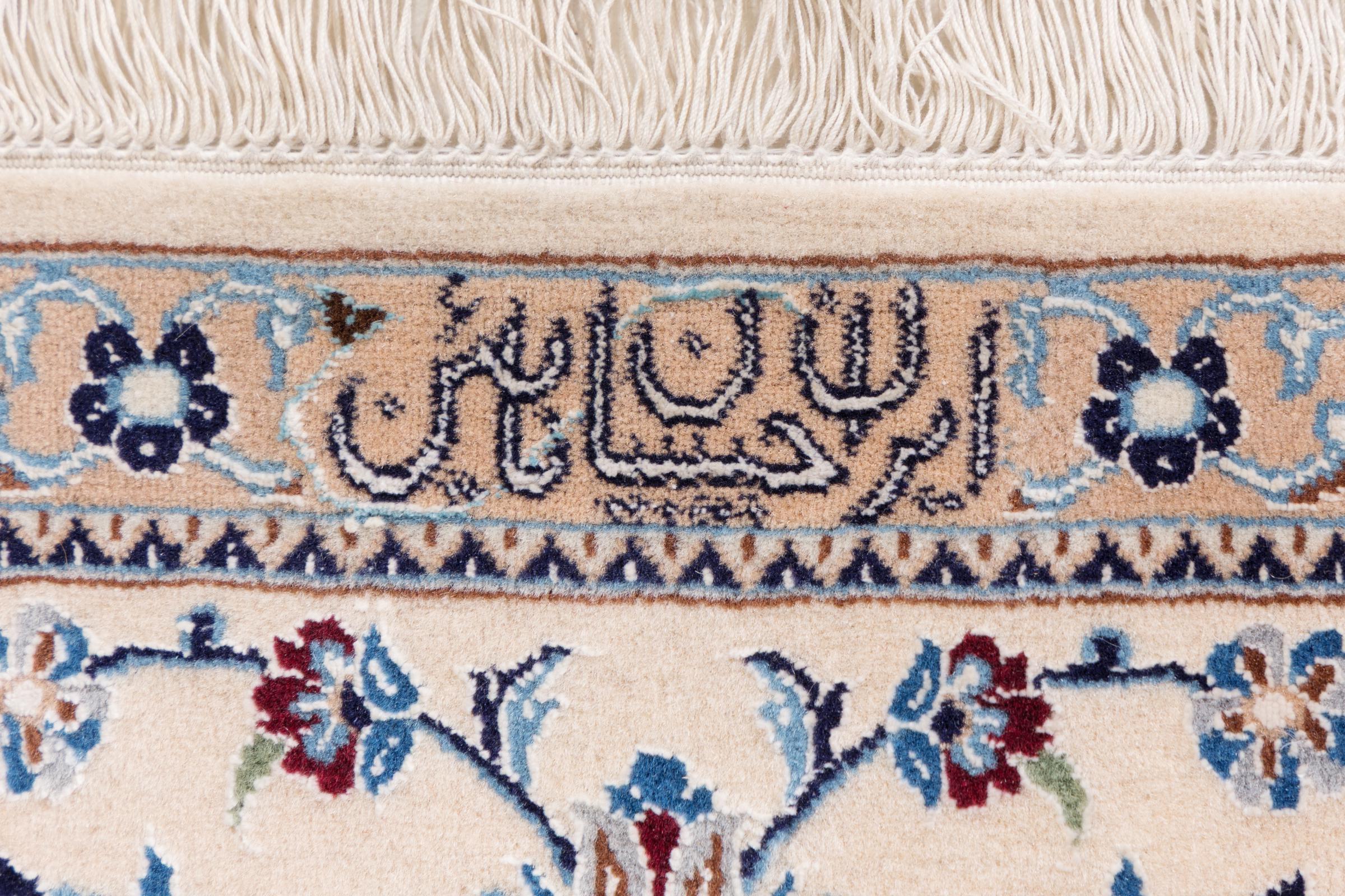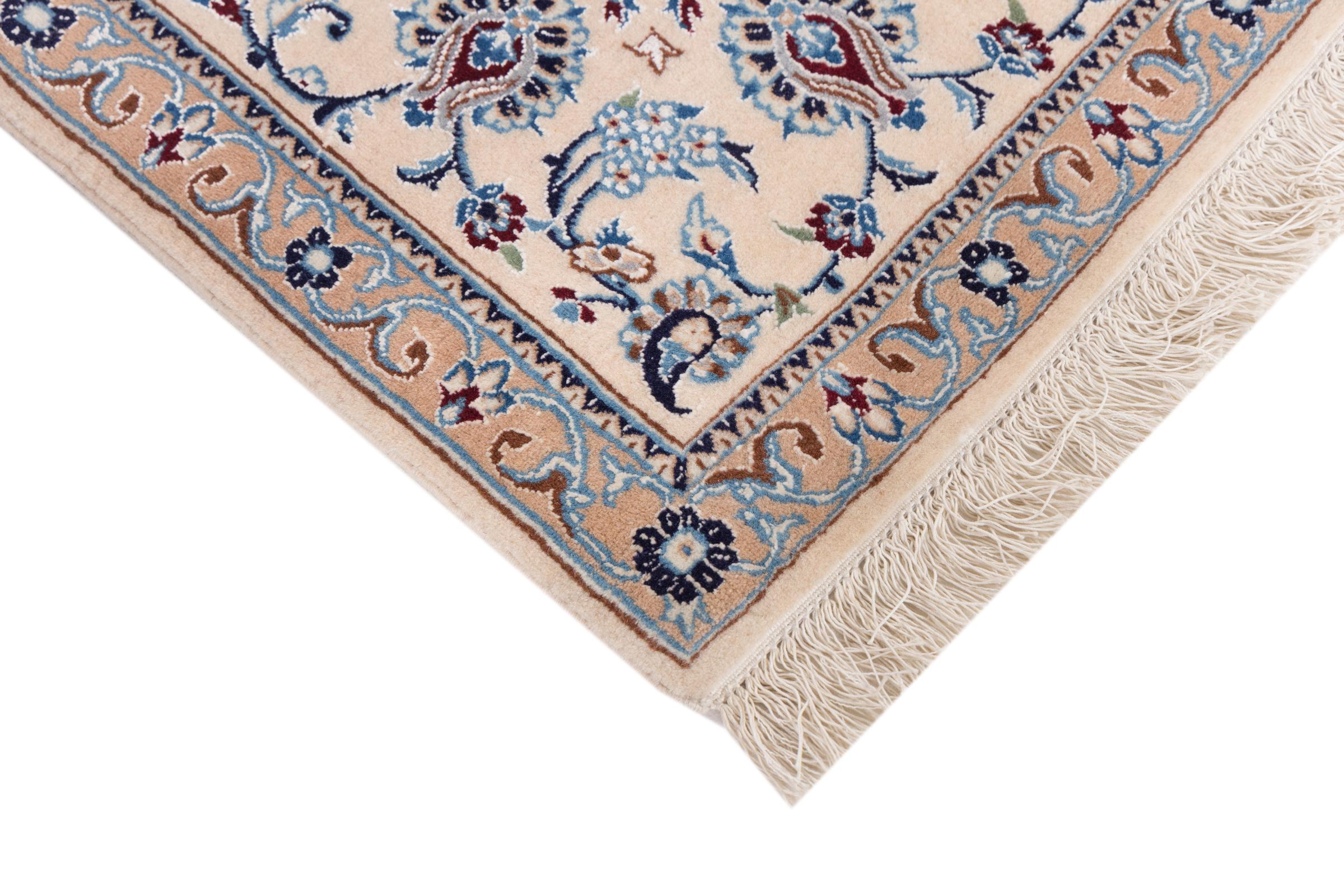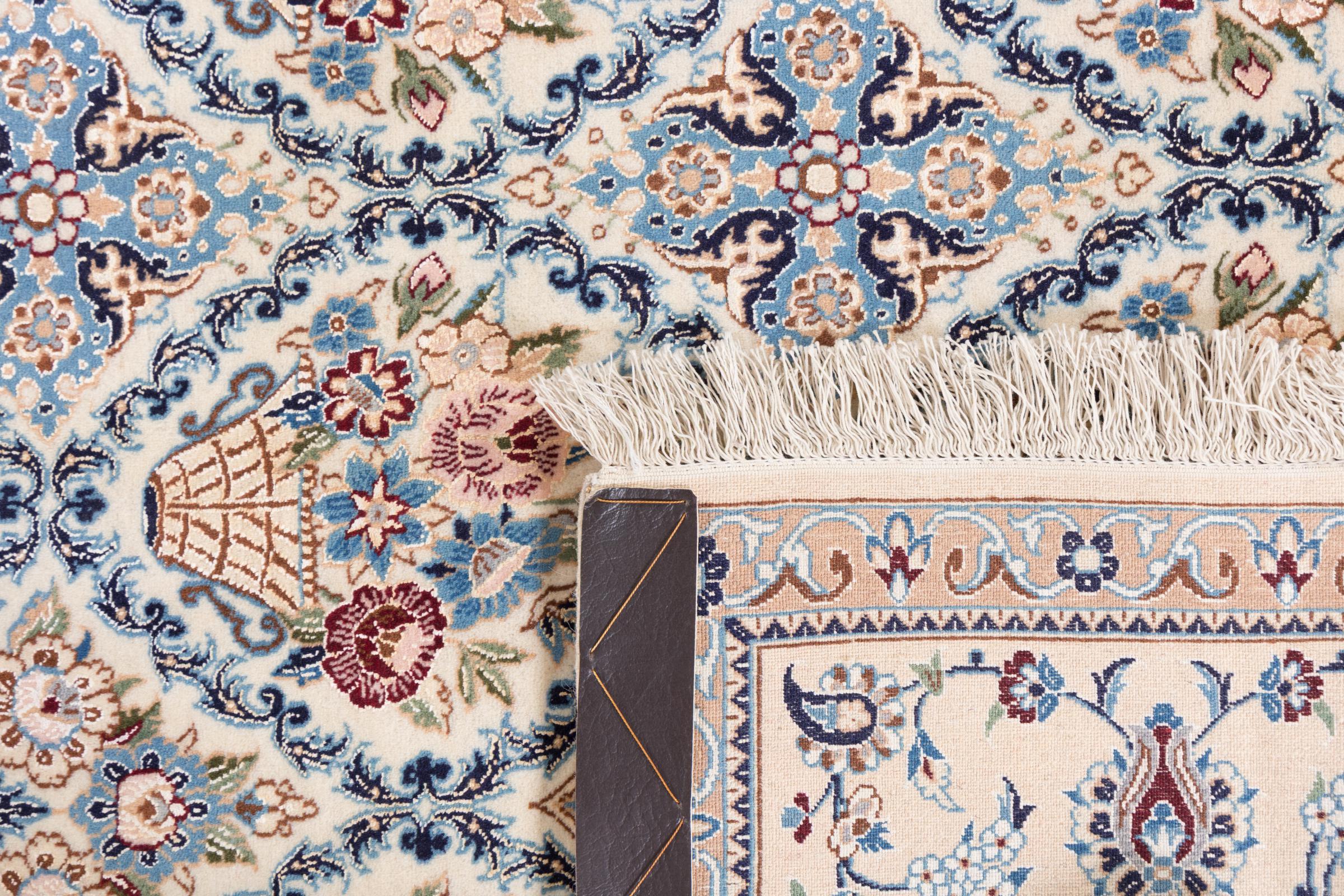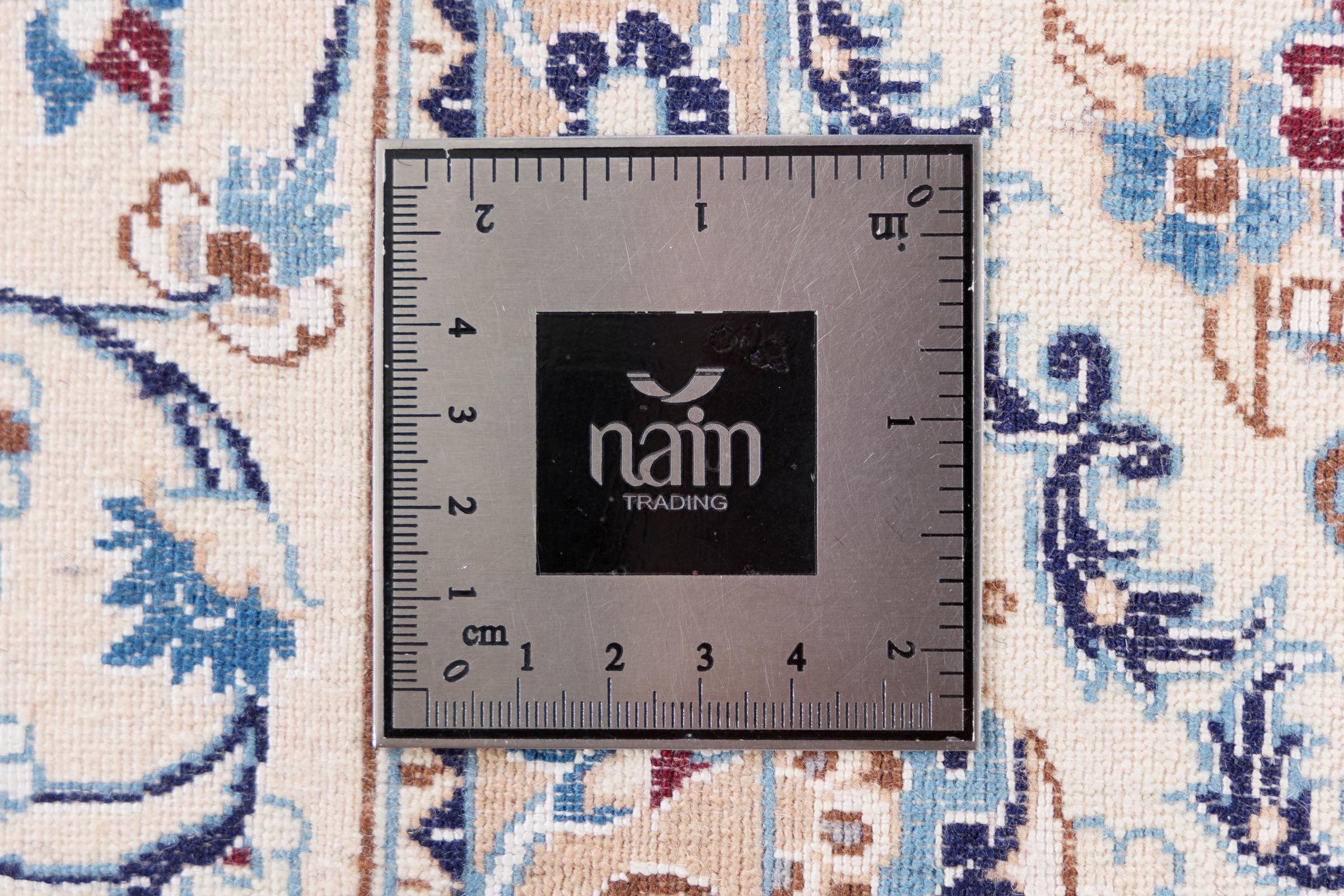 Les tapis de la ville de Nain, à la frontière de l'un des plus grands déserts d'Iran, comptent parmi les plus célèbres tapis persans du monde. Leur design typique est sans équivoque avec des ornements floraux, un médaillon central et des nuances de beige et de rouge ou de bleu. Grâce à leurs désignations 4La, 6La, 9La et 12La, les finesses d'un tapis Nain peuvent être vues d'un seul coup d'œil. Plus le chiffre "La" est bas, plus la densité des nœuds est élevée et donc plus le tapis est fin.
