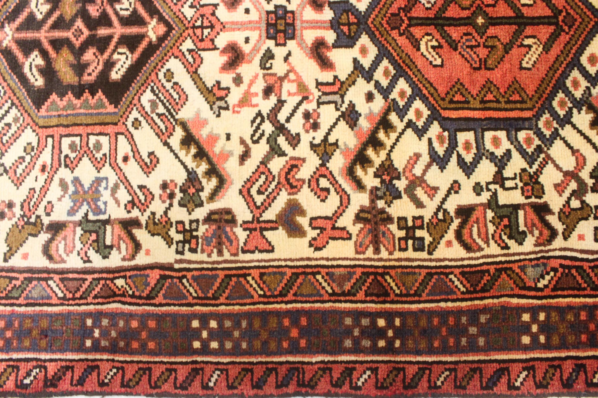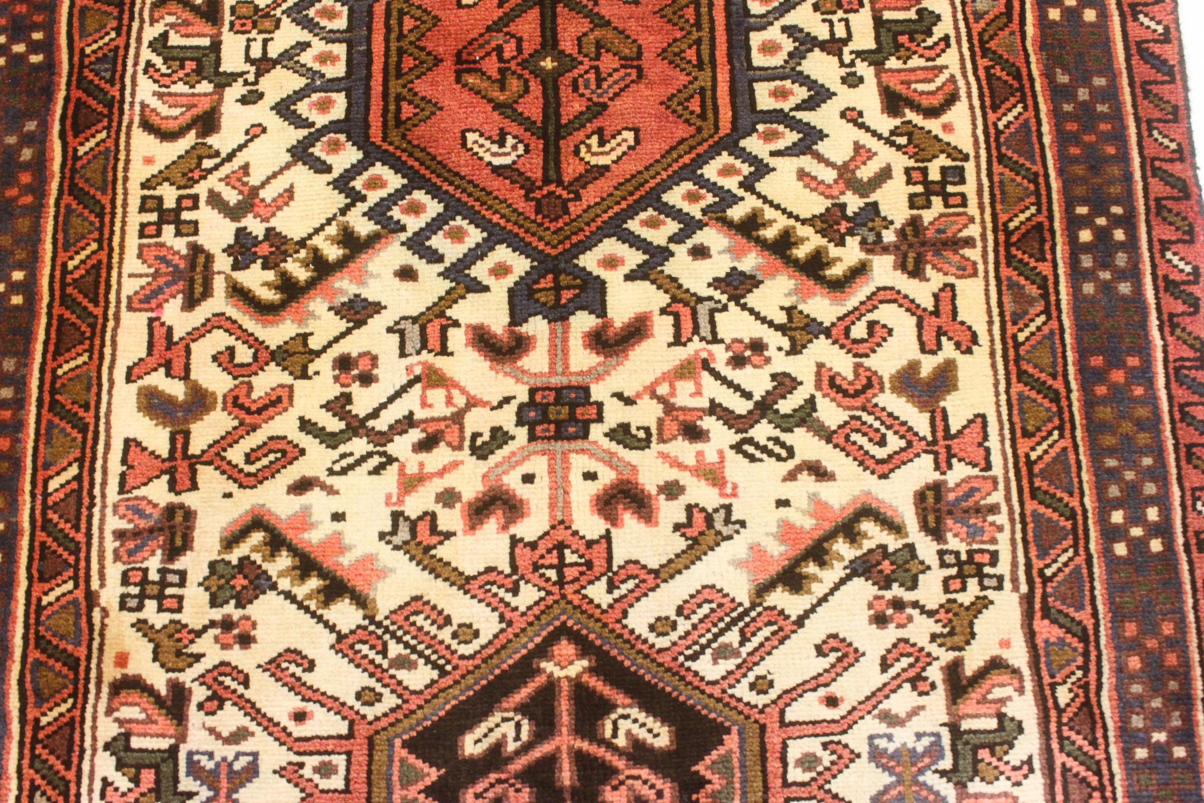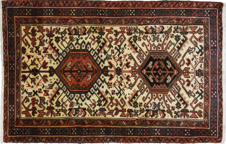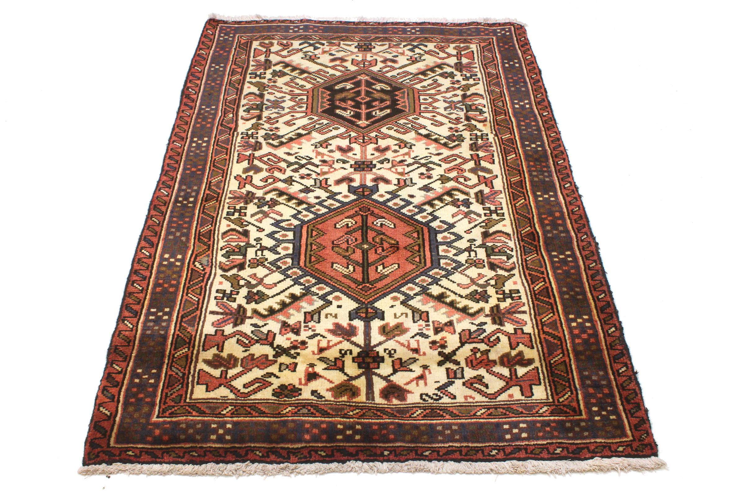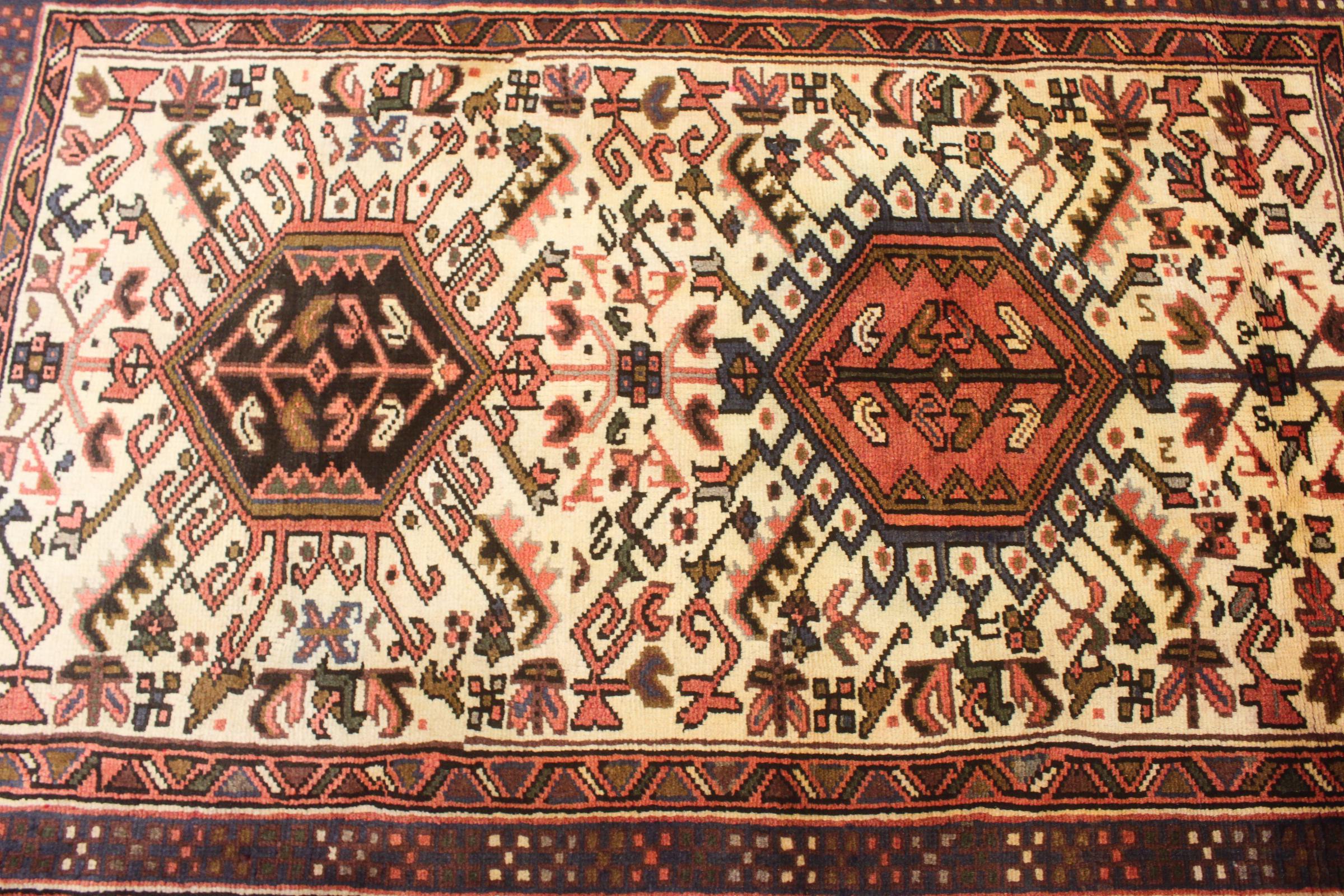 Ce tapis appartient aux tapis de village et de nomade d'Iran, anciennement la Perse. Ce type de tapis est noué à la main dans les petites villes et les villages selon l'ancienne tradition. Même les nomades nouent encore des tapis persans en plein air. Les tapis sont noués sans schéma et entièrement à partir de la tête. Ils se caractérisent par des ornements classiques, qui sont disposés en motifs droits et géométriques. Grâce à leur origine culturelle et traditionnelle, ces tapis ont un caractère unique qui incarne la Perse ancienne.