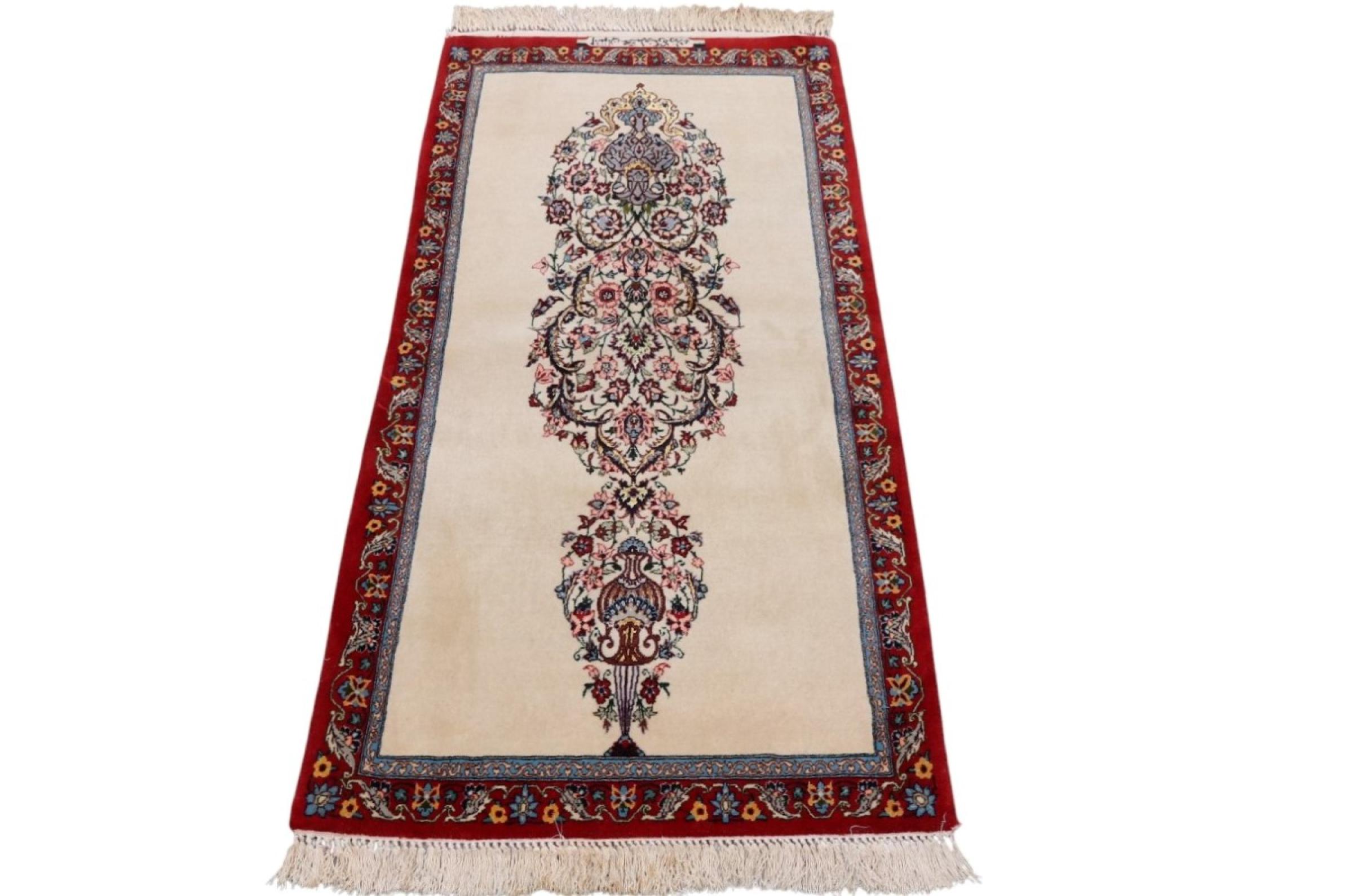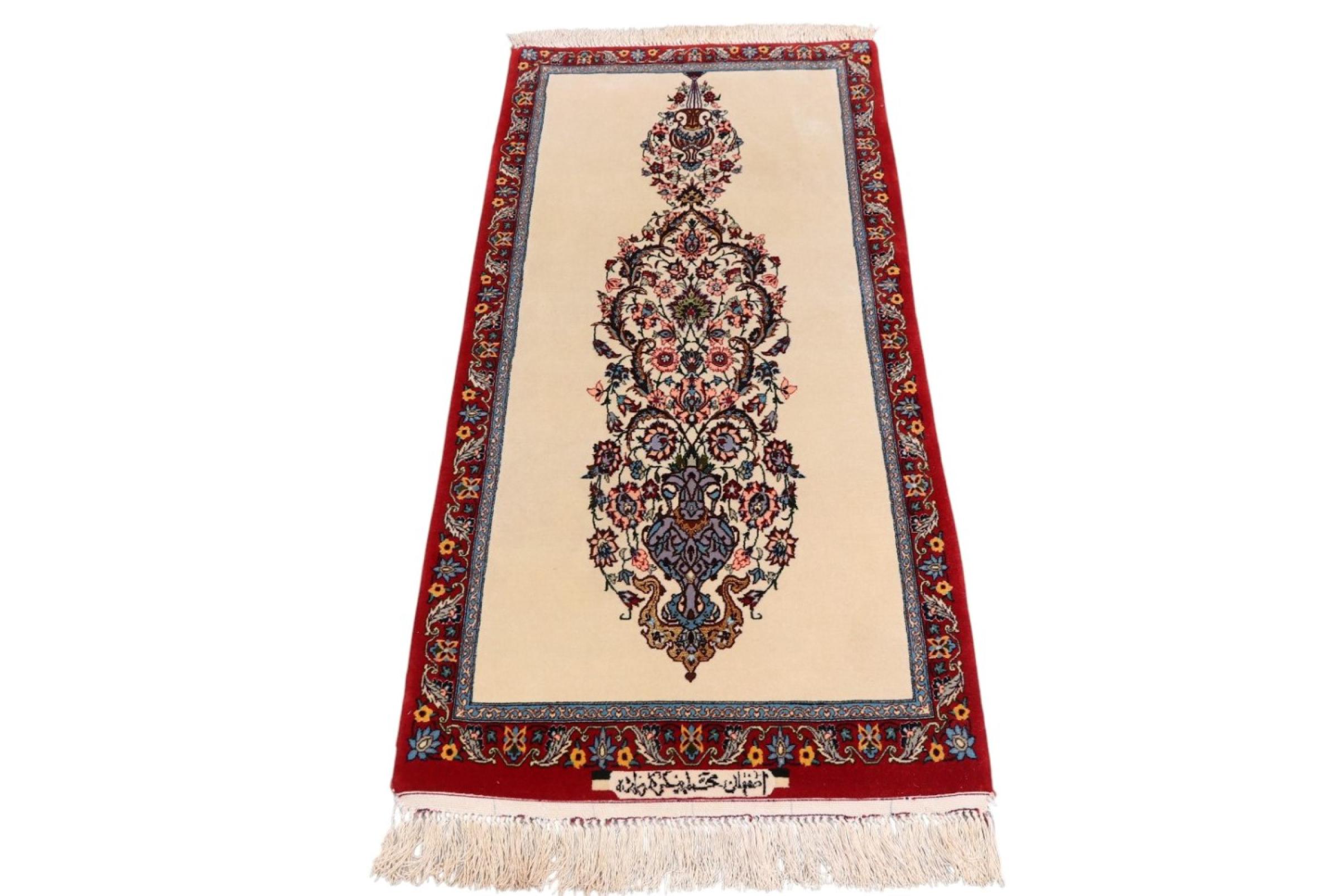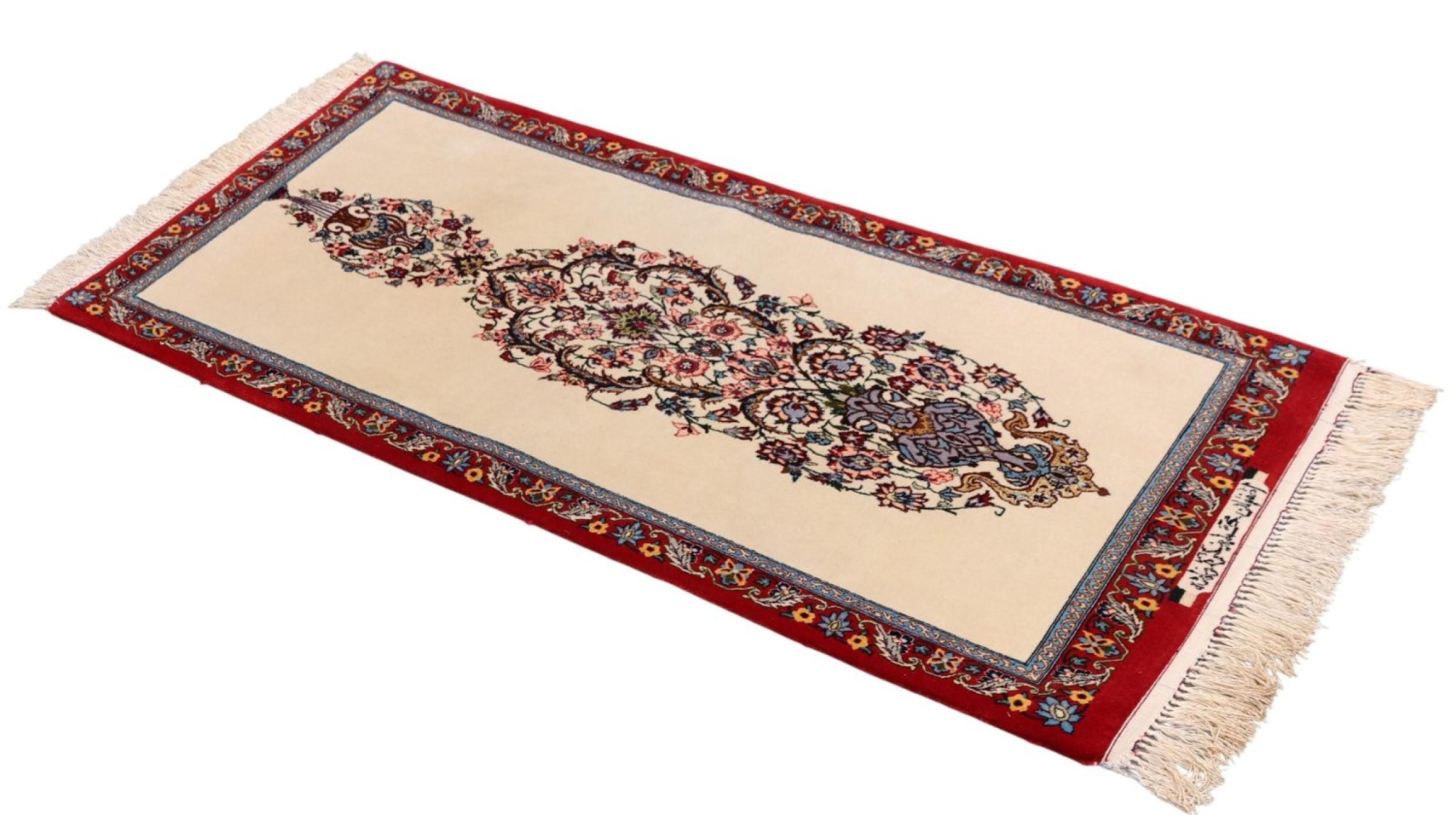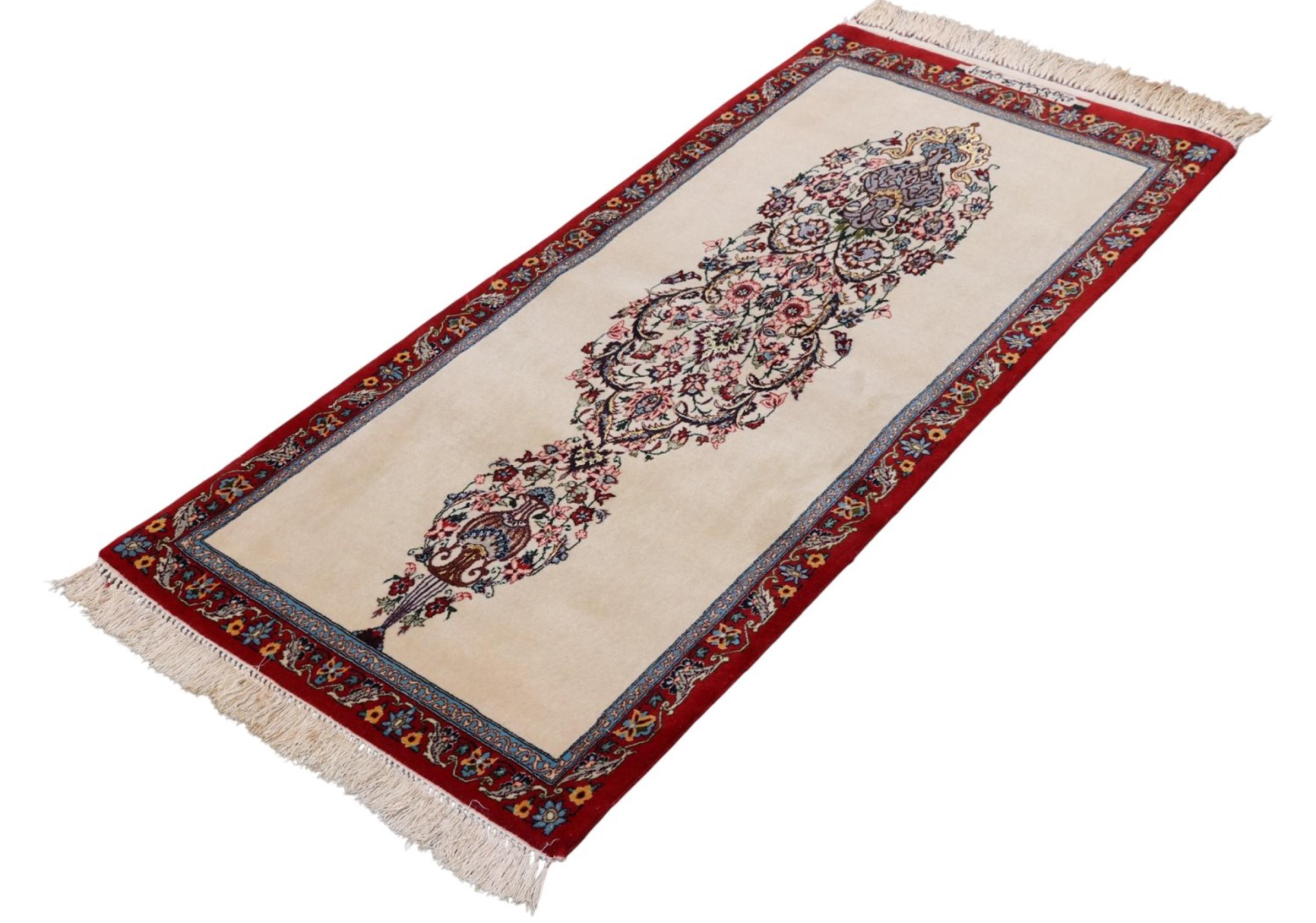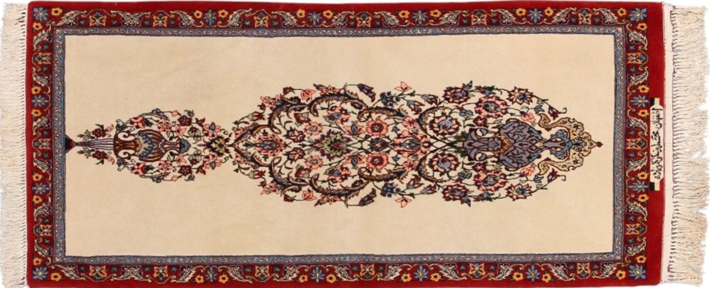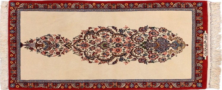 Réf. Article: 306141009509200 Taille: 138x62 cm Épaisseur: ap. 8 mm Densité de nouage: 750 000 / m² Fabrication: Noué à la main Velours: Laine avec de la soie Chaîne: Coton Origine: Persie / Iran Âge: Nouveau Poids: ap. 3 kg Nombre en stock: Unique - Seulement 1 en stock