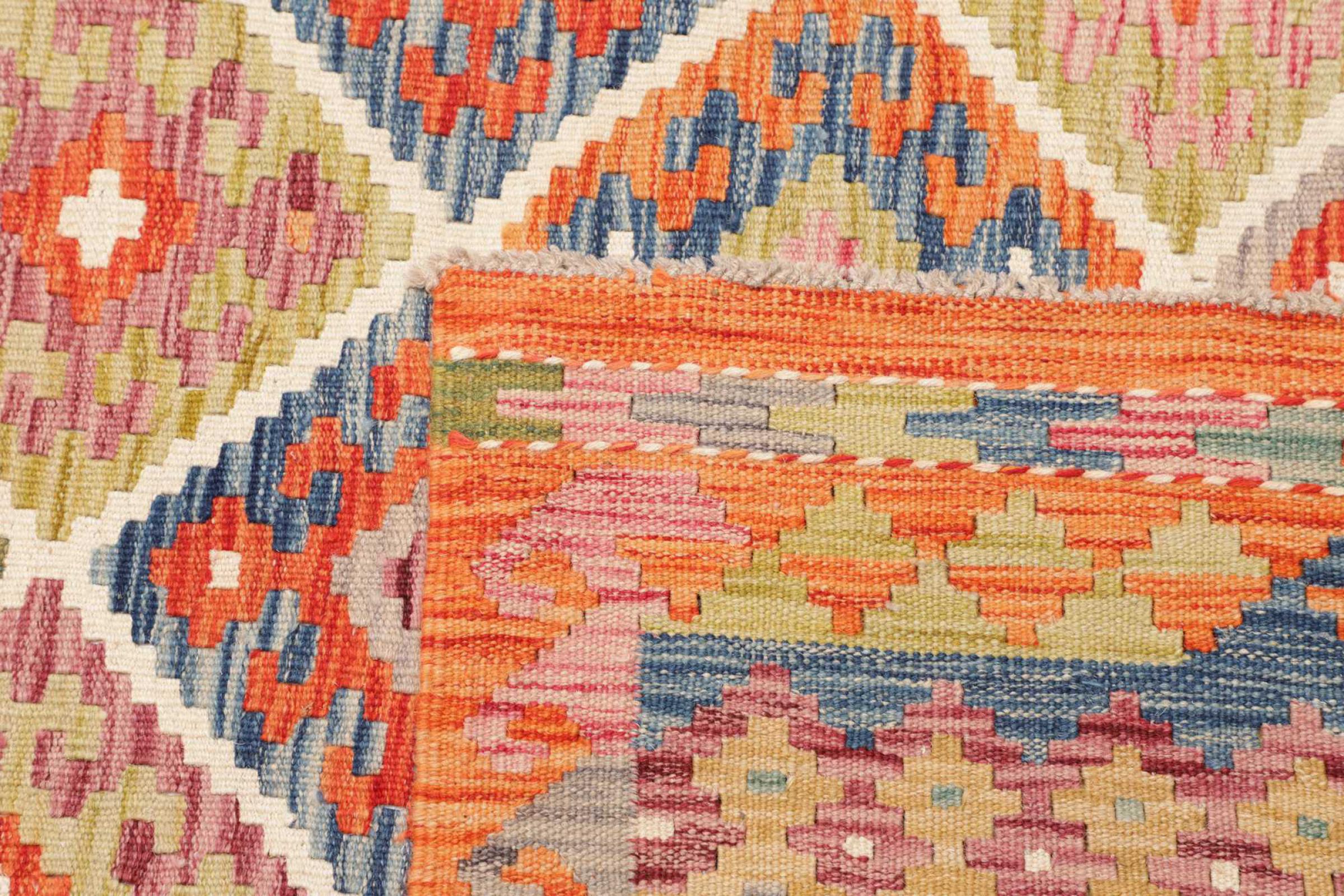 Ces tapis kilim présentent une différence décisive par rapport aux tapis noués à la main - ils sont tissés à la main. Ainsi, ils n'ont pas un haut velours de laine et sont souvent plus plats et plus rugueux que les tapis de laine à nœuds. Leur fabrication est moins élaborée et ils sont donc généralement beaucoup moins chers. Les tapis kilim sont également beaucoup plus légers et peuvent être posés par devant et par derrière. Les kilims tissés à la main proviennent de l'ancienne Perse et sont maintenant souvent fabriqués en Afghanistan. Ils ont des motifs assez simples et directs, qui sont dus à leur technique de tissage.