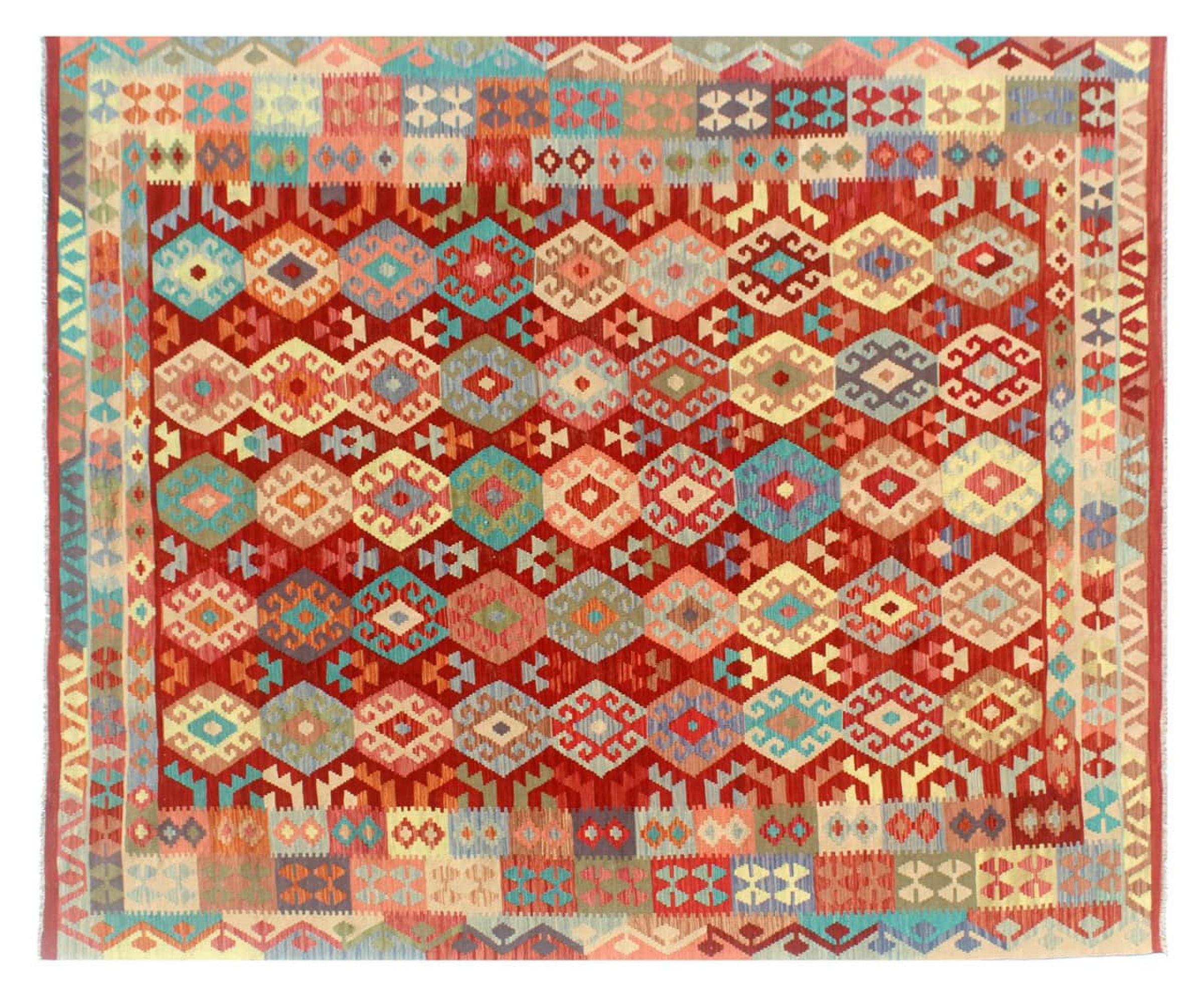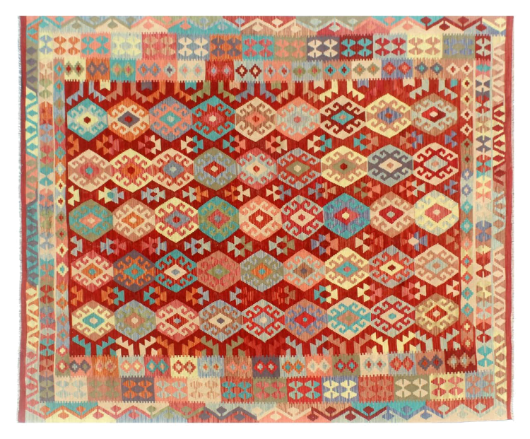 Ce tapis Afghan Kilim tissé main est une merveille, grâce à ses couleurs et à ses motifs caractéristiques. Il a été fabriqué en Afghanistan avec de la laine, et a bien sûr été fait à la main. Il est robuste et durable. Il est un véritable bénéfice pour votre maison.
