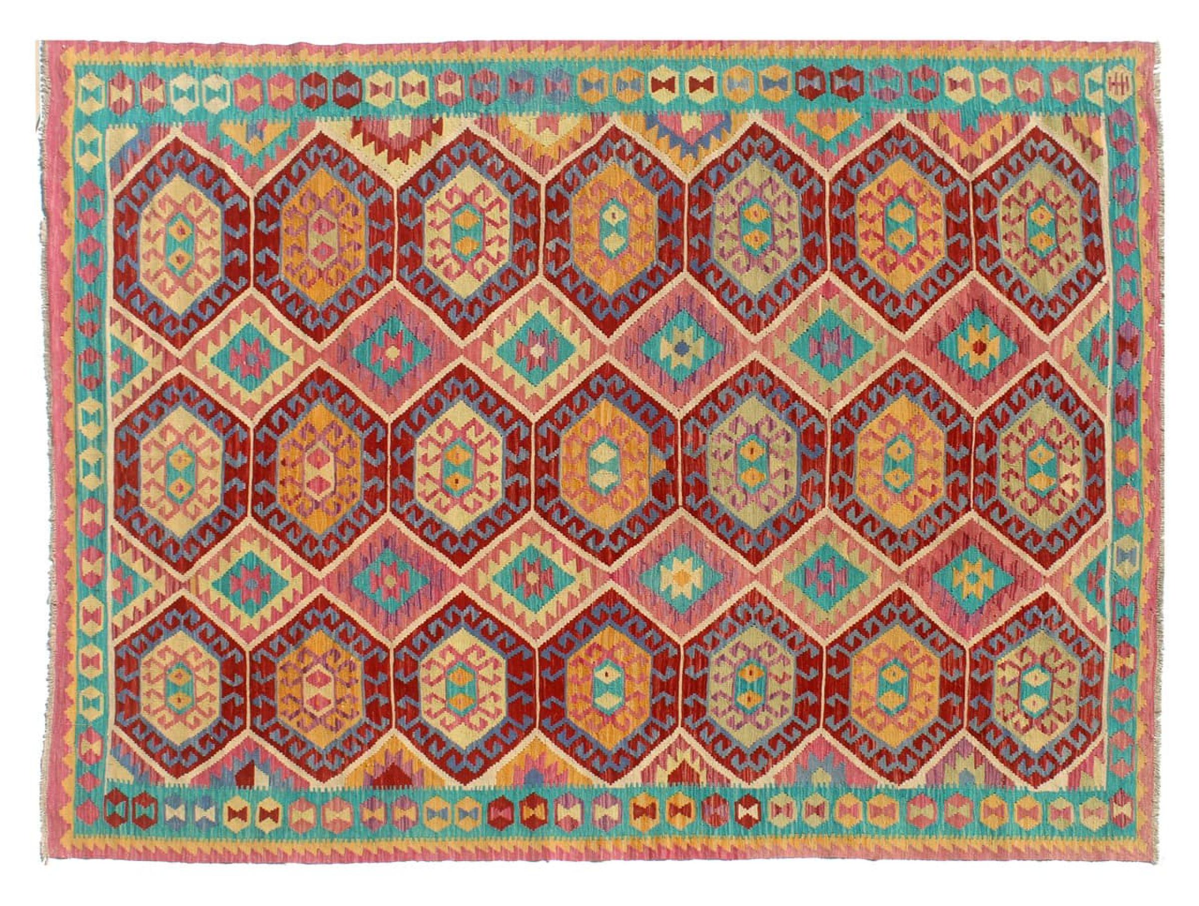 Ce tapis Afghan Kilim tissé main est une merveille, grâce à ses couleurs et à ses motifs caractéristiques. Il a été fabriqué en Afghanistan avec de la laine, et a bien sûr été fait à la main. Il est robuste et durable. Il est un véritable bénéfice pour votre maison.