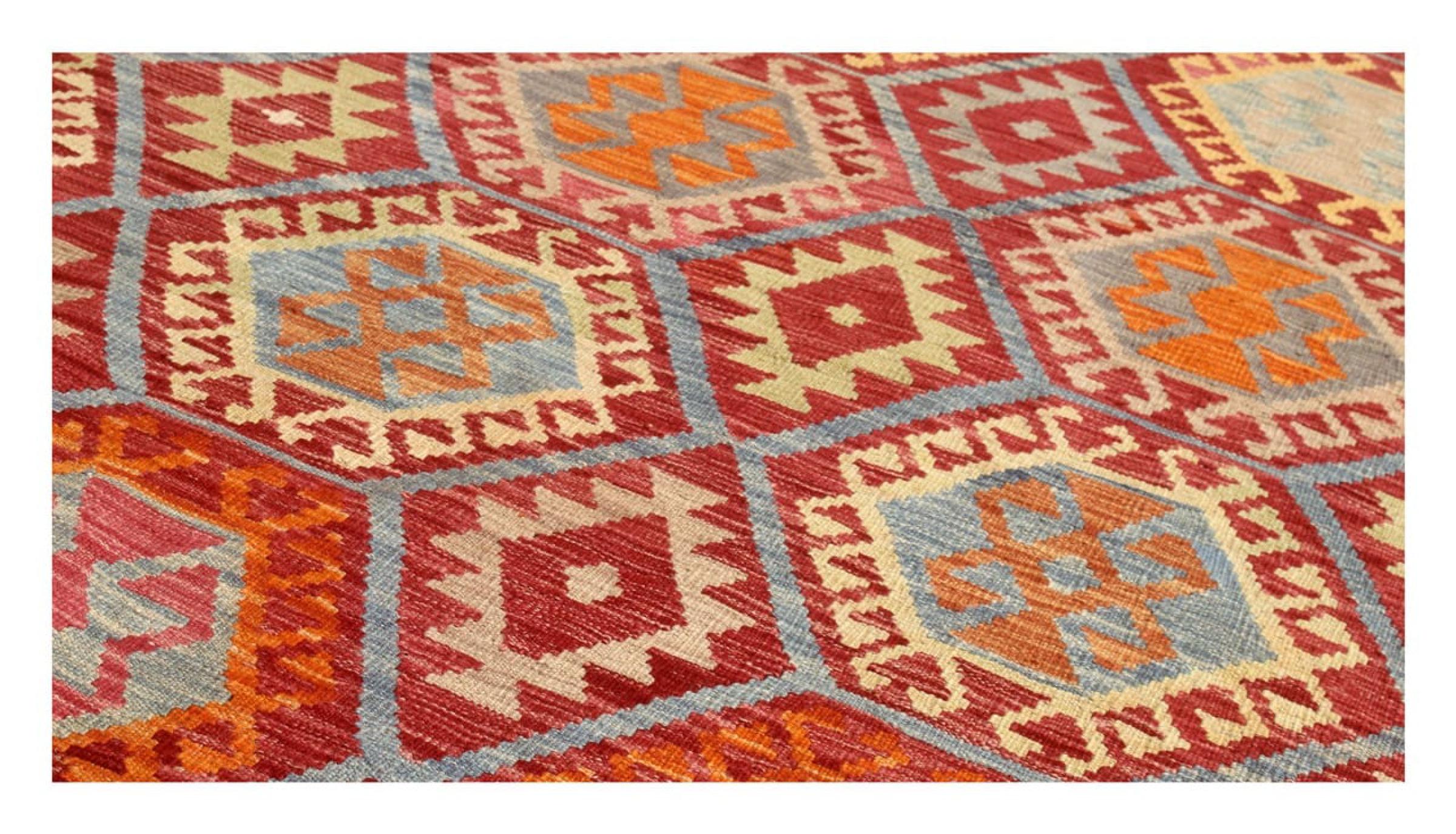 Ces tapis kilim présentent une différence décisive par rapport aux tapis noués à la main - ils sont tissés à la main. Ainsi, ils n'ont pas un haut velours de laine et sont souvent plus plats et plus rugueux que les tapis de laine à nœuds. Leur fabrication est moins élaborée et ils sont donc généralement beaucoup moins chers. Les tapis kilim sont également beaucoup plus légers et peuvent être posés par devant et par derrière. Les kilims tissés à la main proviennent de l'ancienne Perse et sont maintenant souvent fabriqués en Afghanistan. Ils ont des motifs assez simples et directs, qui sont dus à leur technique de tissage.