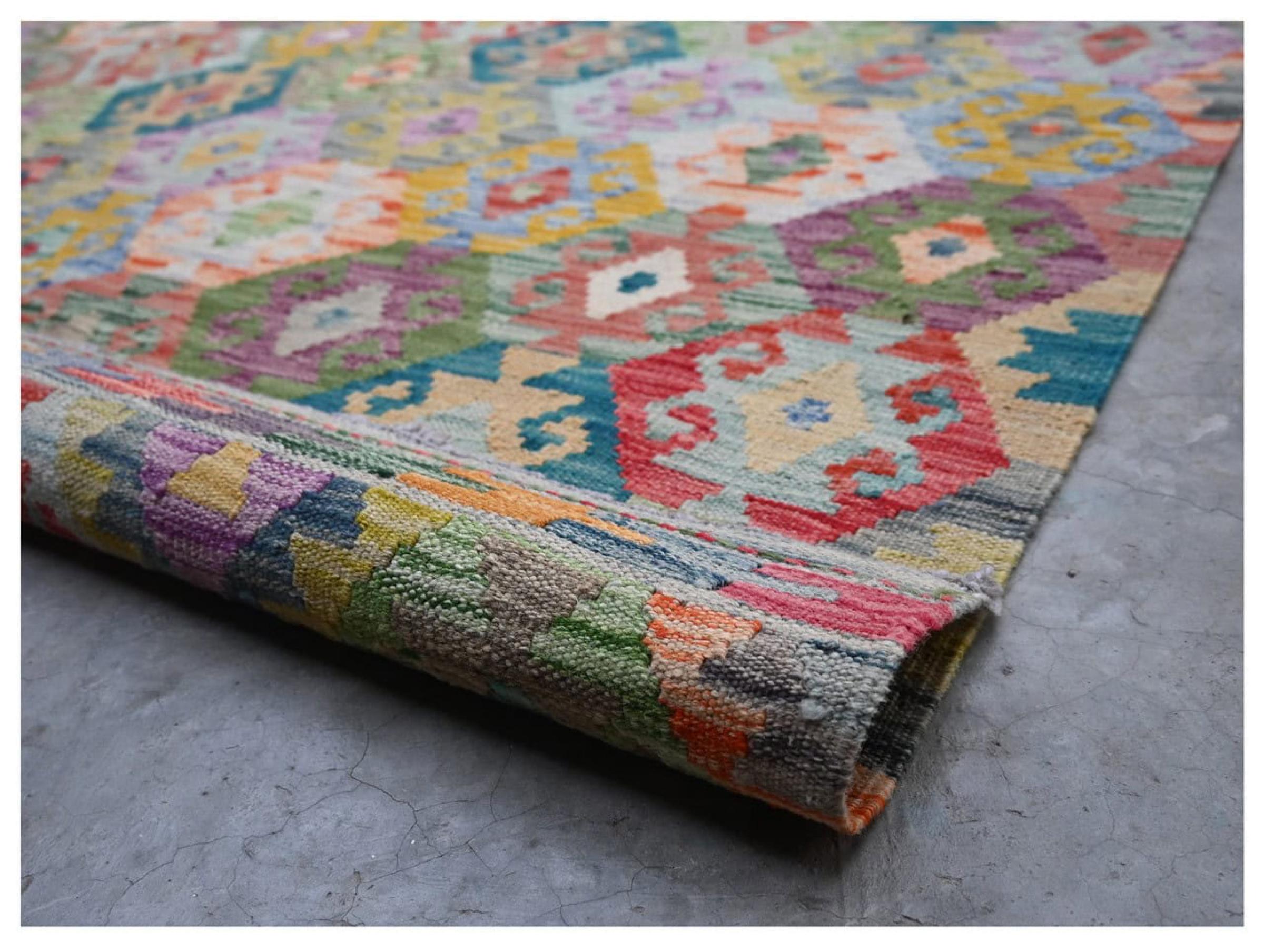 Ce tapis Afghan Kilim tissé main est une merveille, grâce à ses couleurs et à ses motifs caractéristiques. Il a été fabriqué en Afghanistan avec de la laine, et a bien sûr été fait à la main. Il est robuste et durable. Il est un véritable bénéfice pour votre maison.