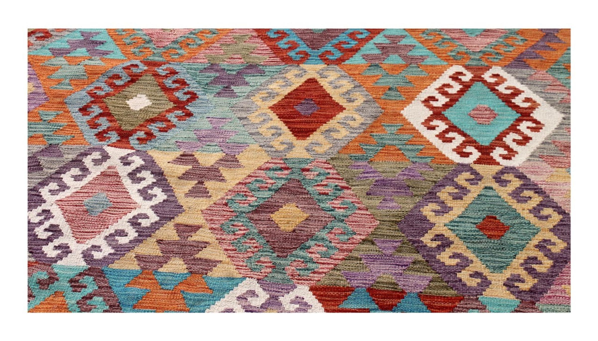 Ces tapis kilim présentent une différence décisive par rapport aux tapis noués à la main - ils sont tissés à la main. Ainsi, ils n'ont pas un haut velours de laine et sont souvent plus plats et plus rugueux que les tapis de laine à nœuds. Leur fabrication est moins élaborée et ils sont donc généralement beaucoup moins chers. Les tapis kilim sont également beaucoup plus légers et peuvent être posés par devant et par derrière. Les kilims tissés à la main proviennent de l'ancienne Perse et sont maintenant souvent fabriqués en Afghanistan. Ils ont des motifs assez simples et directs, qui sont dus à leur technique de tissage.
