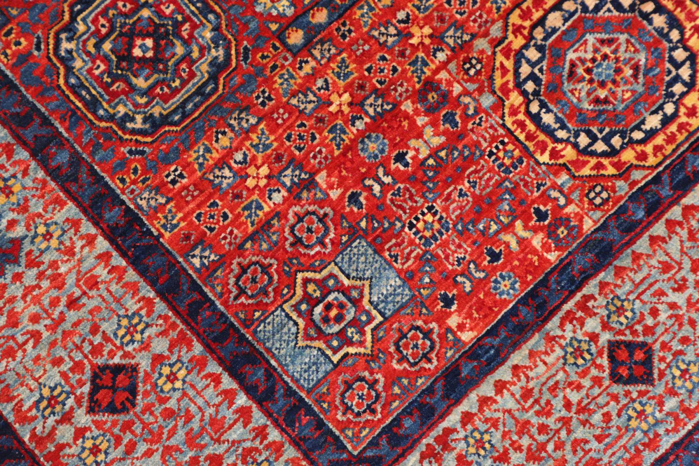 Ce tapis est fait de laine de mouton filée à la main de la plus haute qualité. En Iran (ancienne Perse), en Afghanistan et au Pakistan notamment, la laine est encore filée à la main avant que ne commence le nouage proprement dit du tapis. La laine a fait ses preuves en tant que matière naturelle et extrêmement résistante au fil des siècles. Il a notamment des propriétés antisalissures et d'isolation thermique. En même temps, la laine est incomparablement douce et a un éclat naturel.