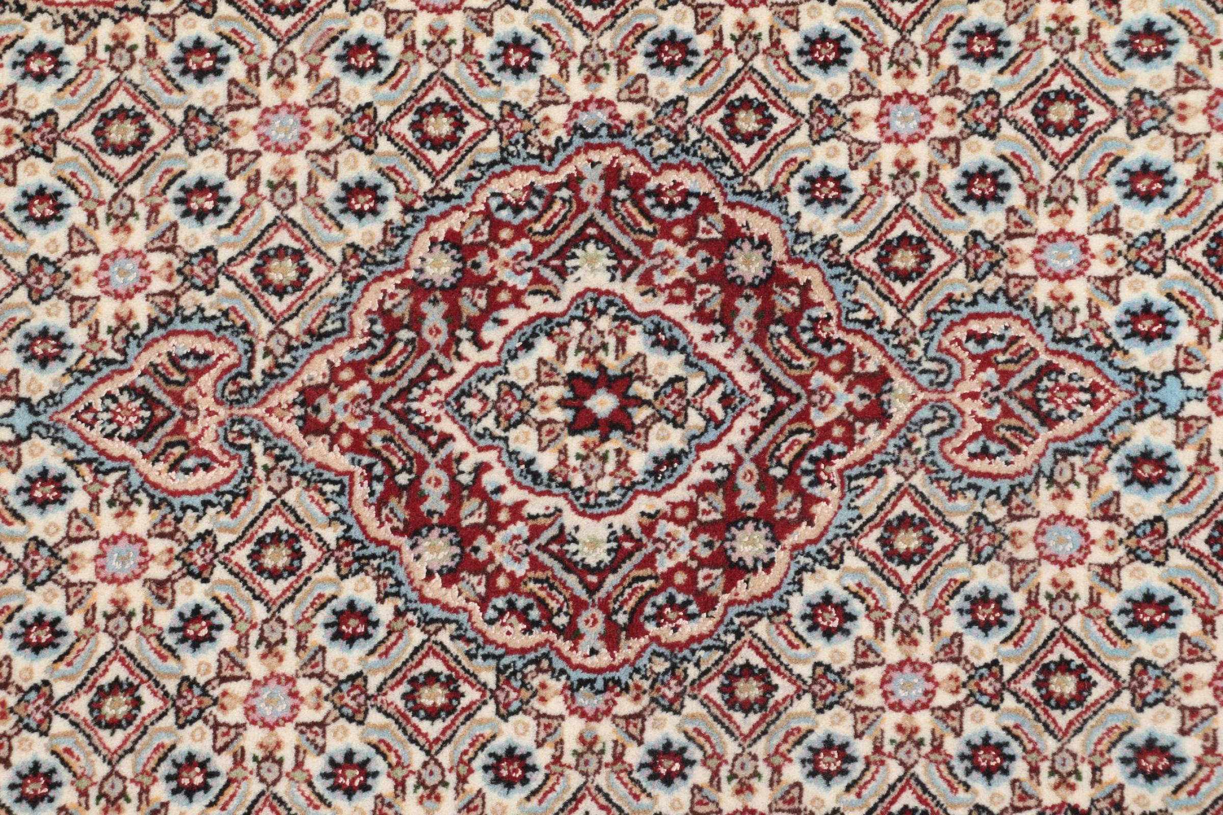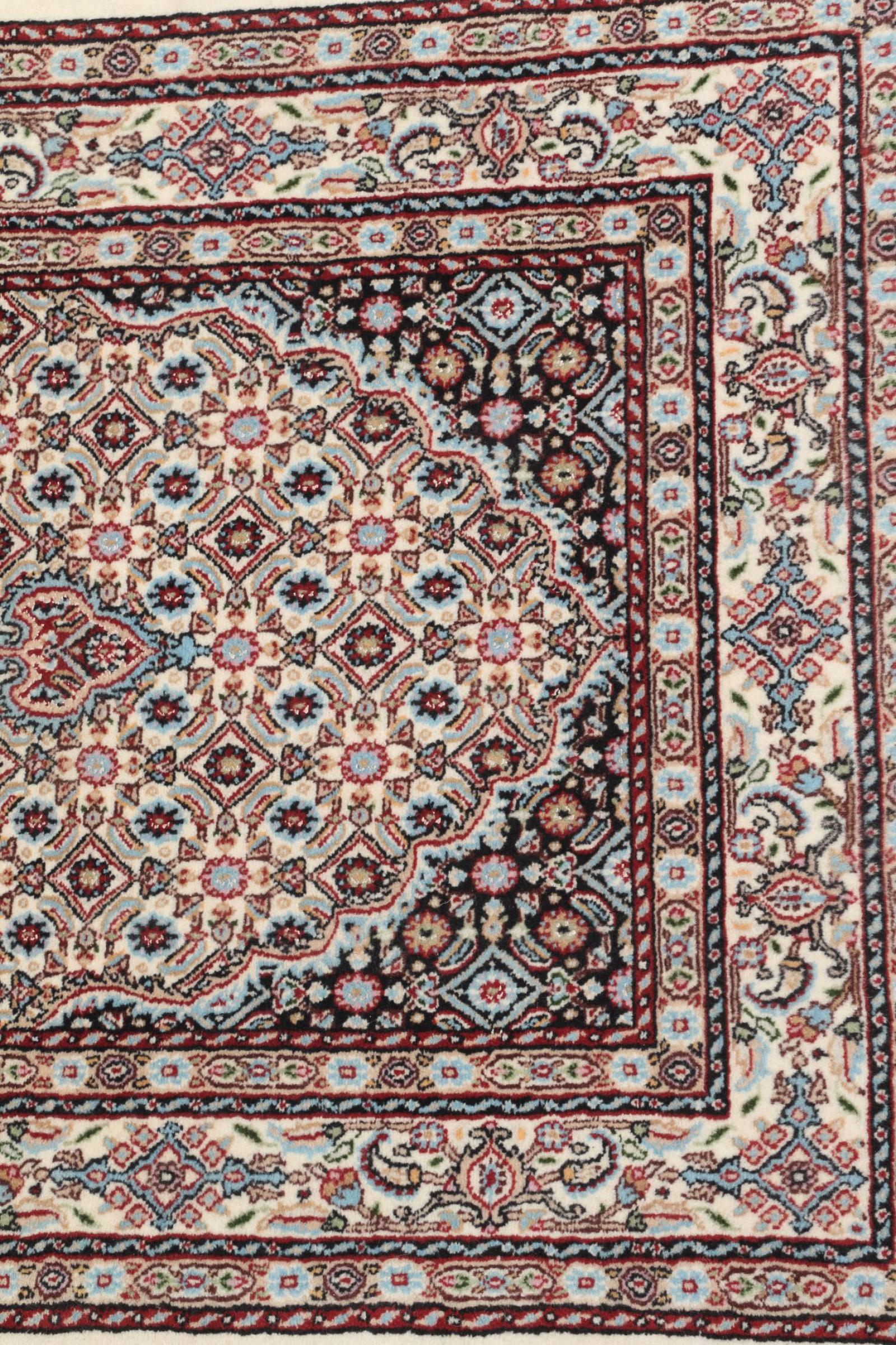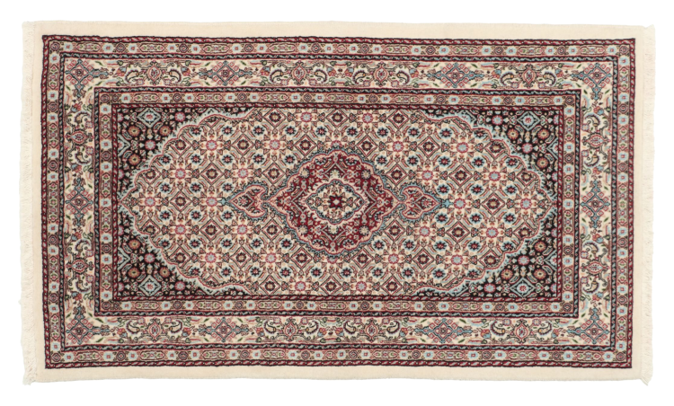 Moud est en Iran, au sud de Mashhad. En tant que ville de l'ancienne Perse, sa tradition de nouage de tapis remonte à plusieurs siècles, voire à des milliers d'années. Les tapis noués à la main de Moud jouissent d'une excellente réputation. Ils sont faits avec le fameux nœud persan. En général, les tapis persans brumeux ont un motif de couverture complète. Le motif Jardin avec des motifs de jardins persans ou le motif Herati.