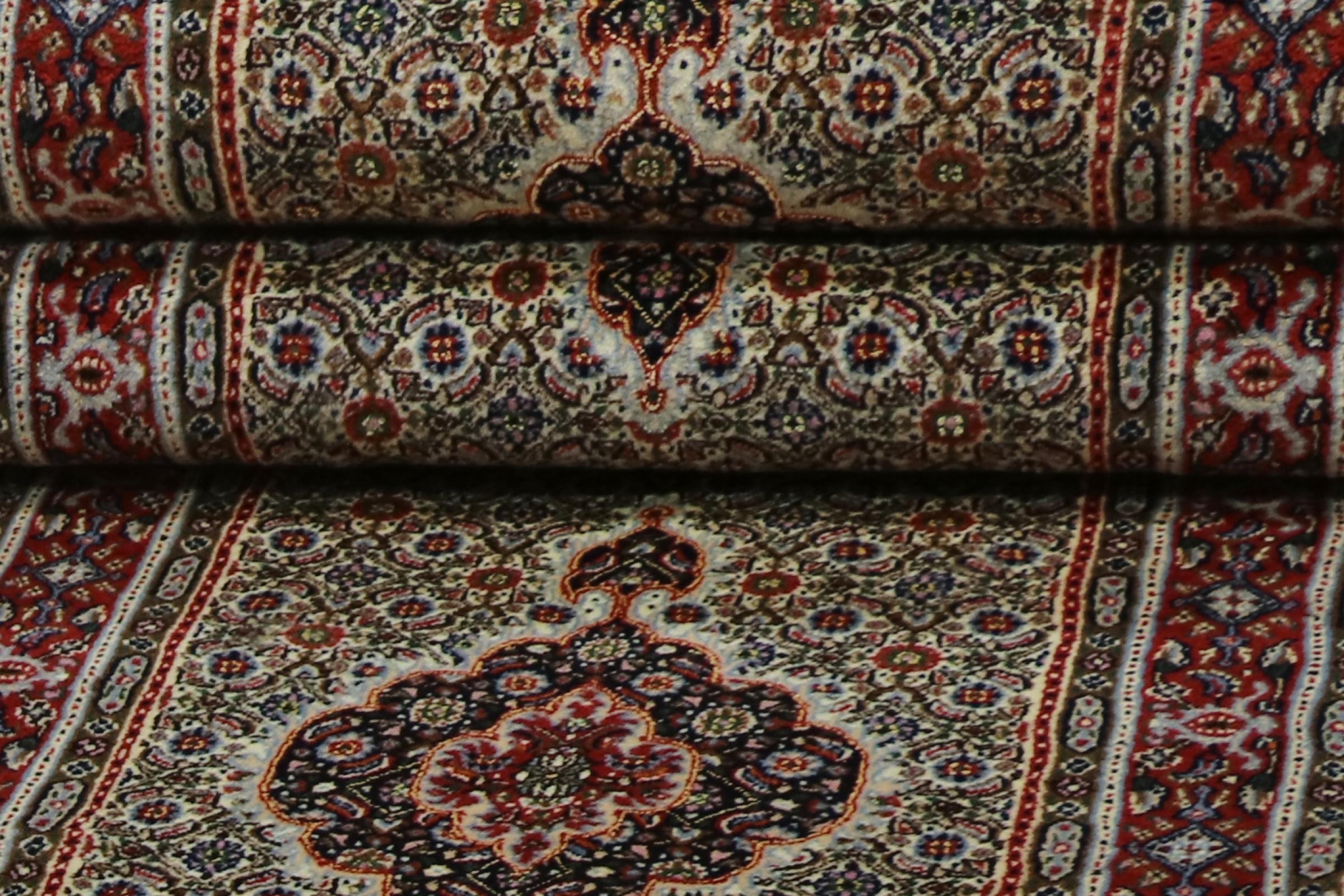 Moud est en Iran, au sud de Mashhad. En tant que ville de l'ancienne Perse, sa tradition de nouage de tapis remonte à plusieurs siècles, voire à des milliers d'années. Les tapis noués à la main de Moud jouissent d'une excellente réputation. Ils sont faits avec le fameux nœud persan. En général, les tapis persans brumeux ont un motif de couverture complète. Le motif Jardin avec des motifs de jardins persans ou le motif Herati.