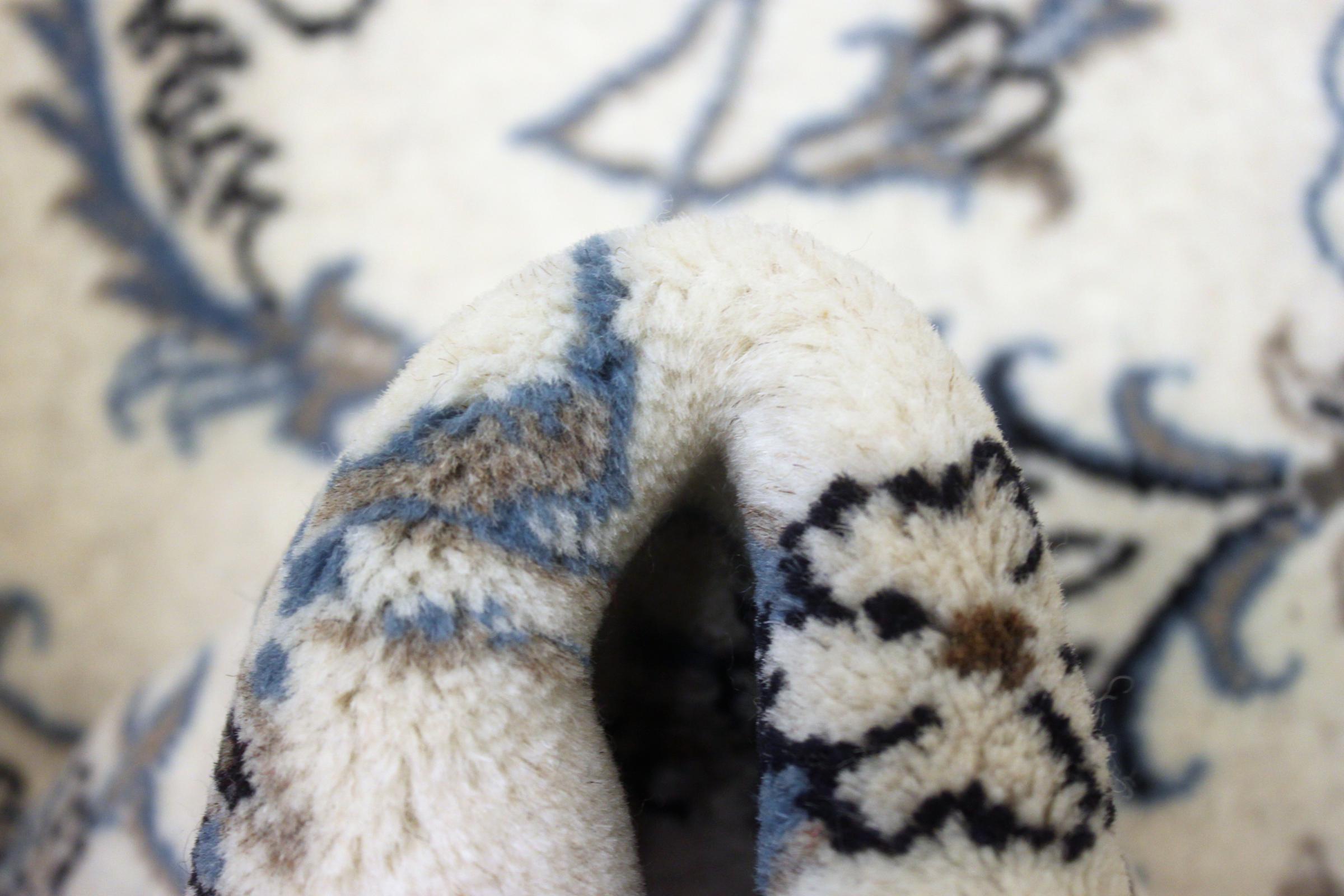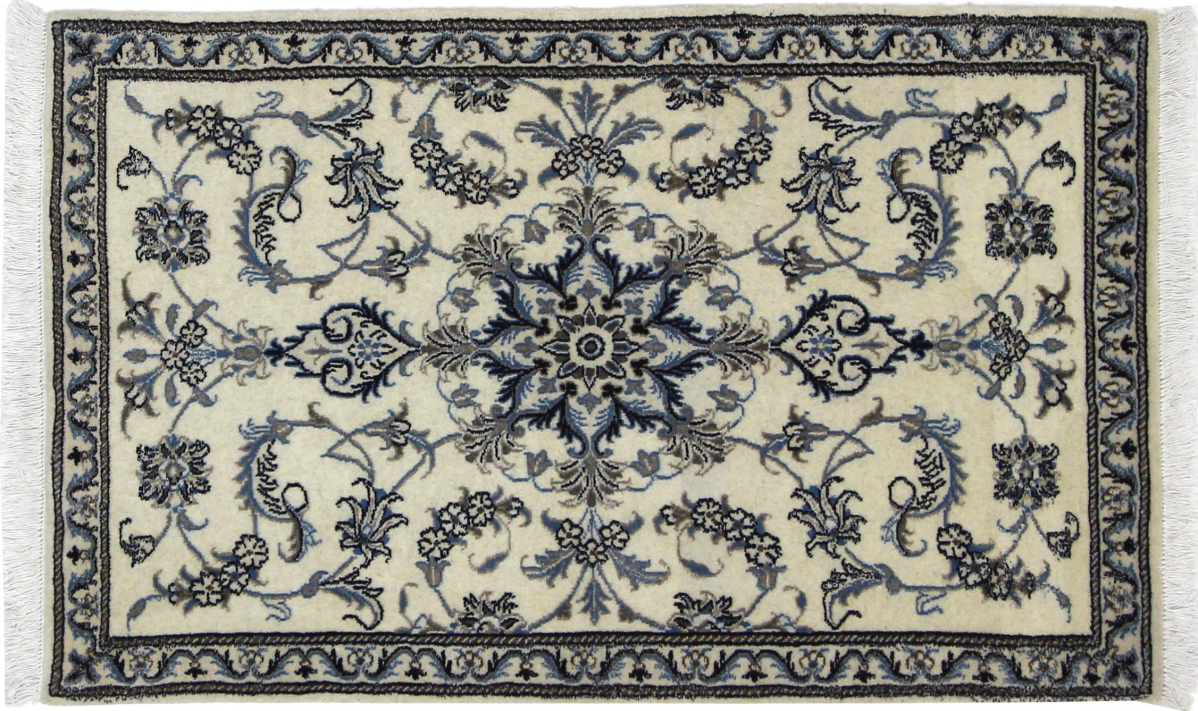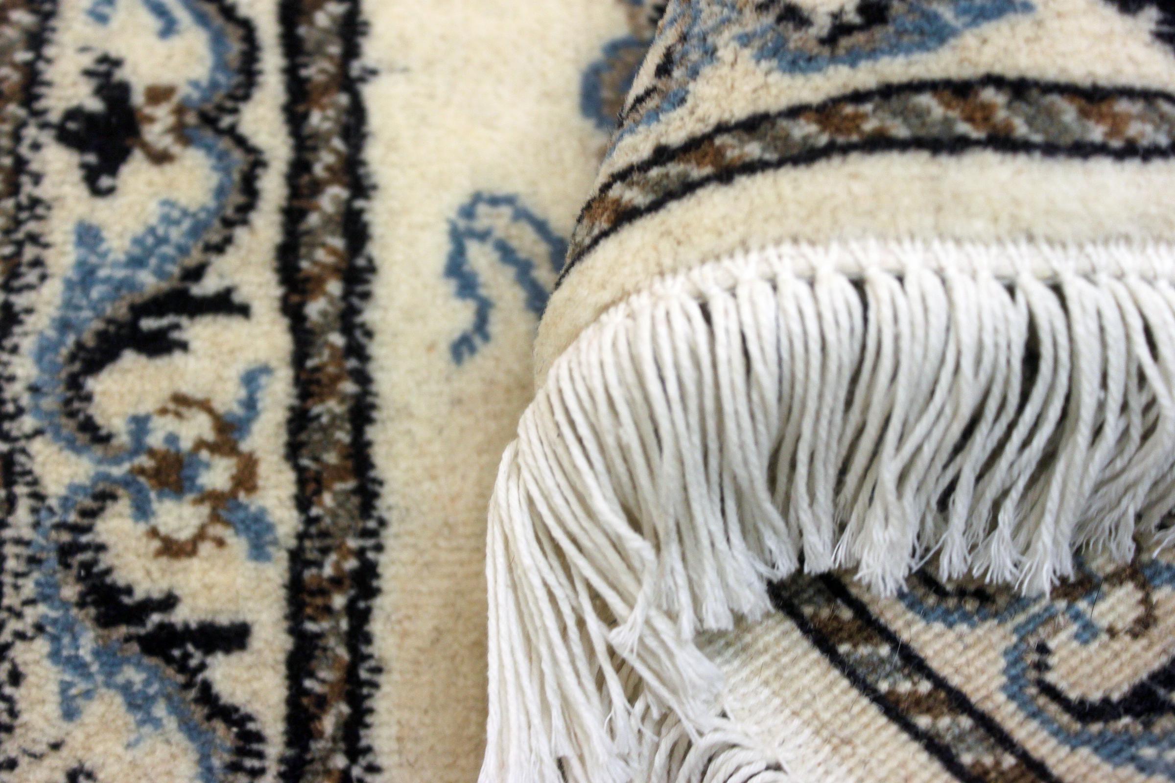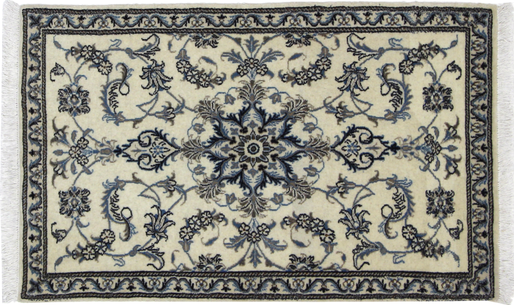 Les tapis de la ville de Nain, à la frontière de l'un des plus grands déserts d'Iran, comptent parmi les plus célèbres tapis persans du monde. Leur design typique est sans équivoque avec des ornements floraux, un médaillon central et des nuances de beige et de rouge ou de bleu. Grâce à leurs désignations 4La, 6La, 9La et 12La, les finesses d'un tapis Nain peuvent être vues d'un seul coup d'œil. Plus le chiffre "La" est bas, plus la densité des nœuds est élevée et donc plus le tapis est fin.