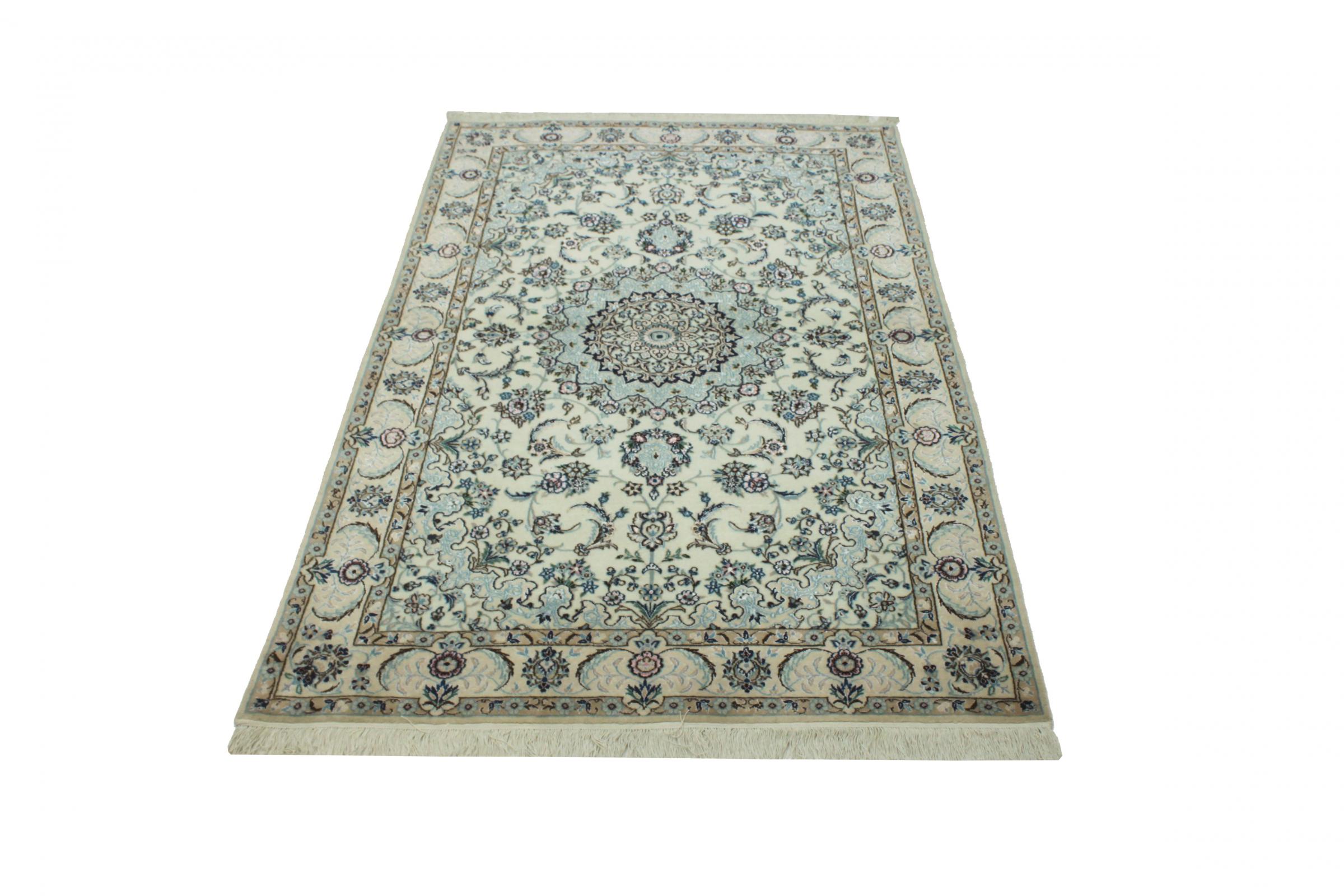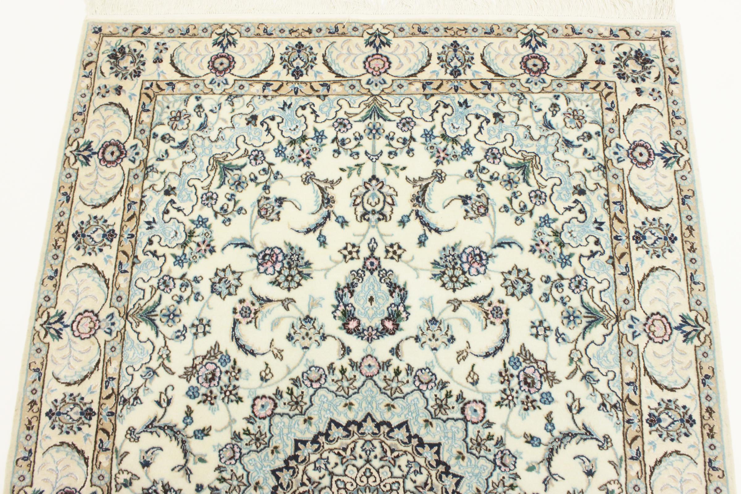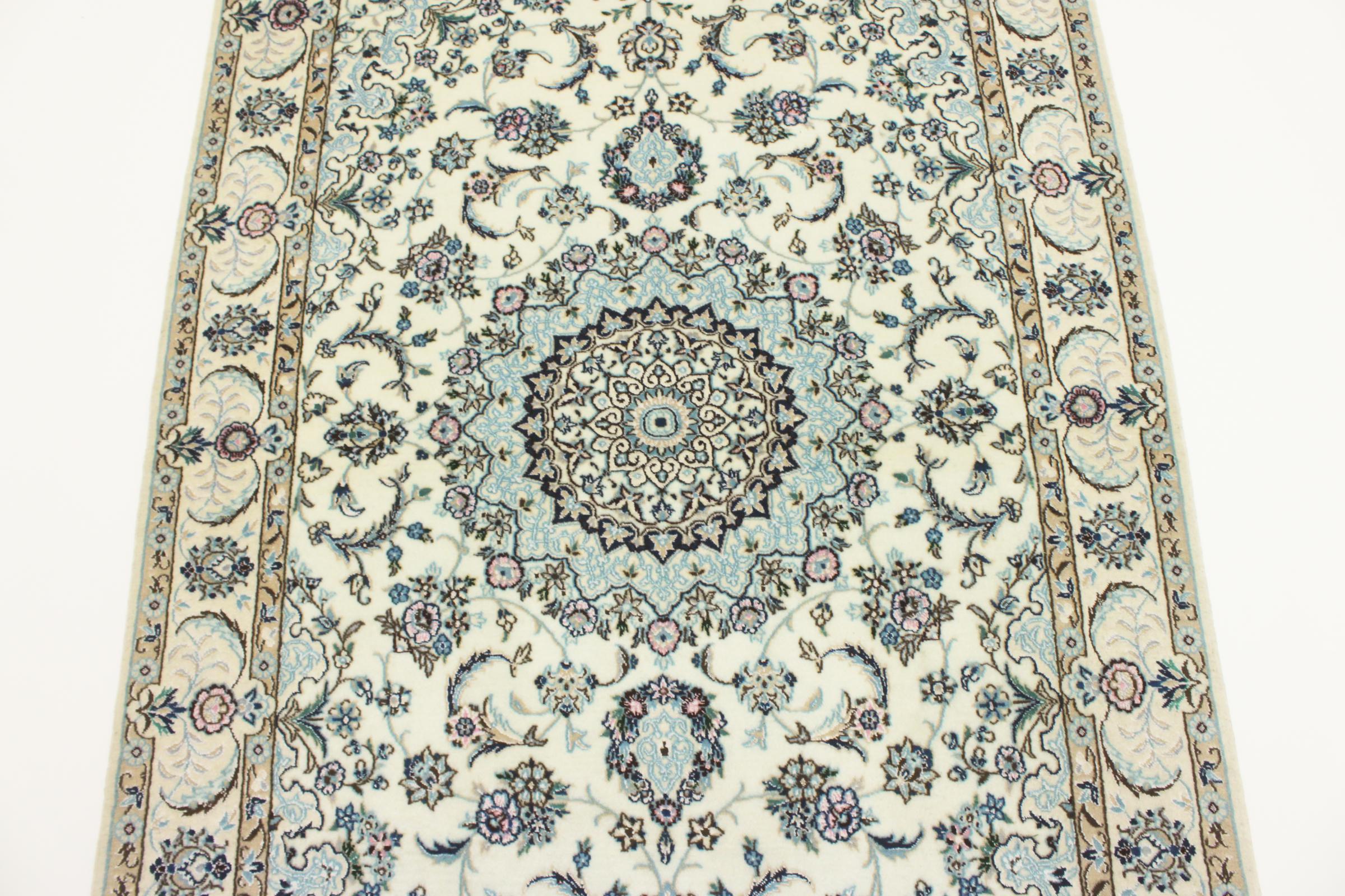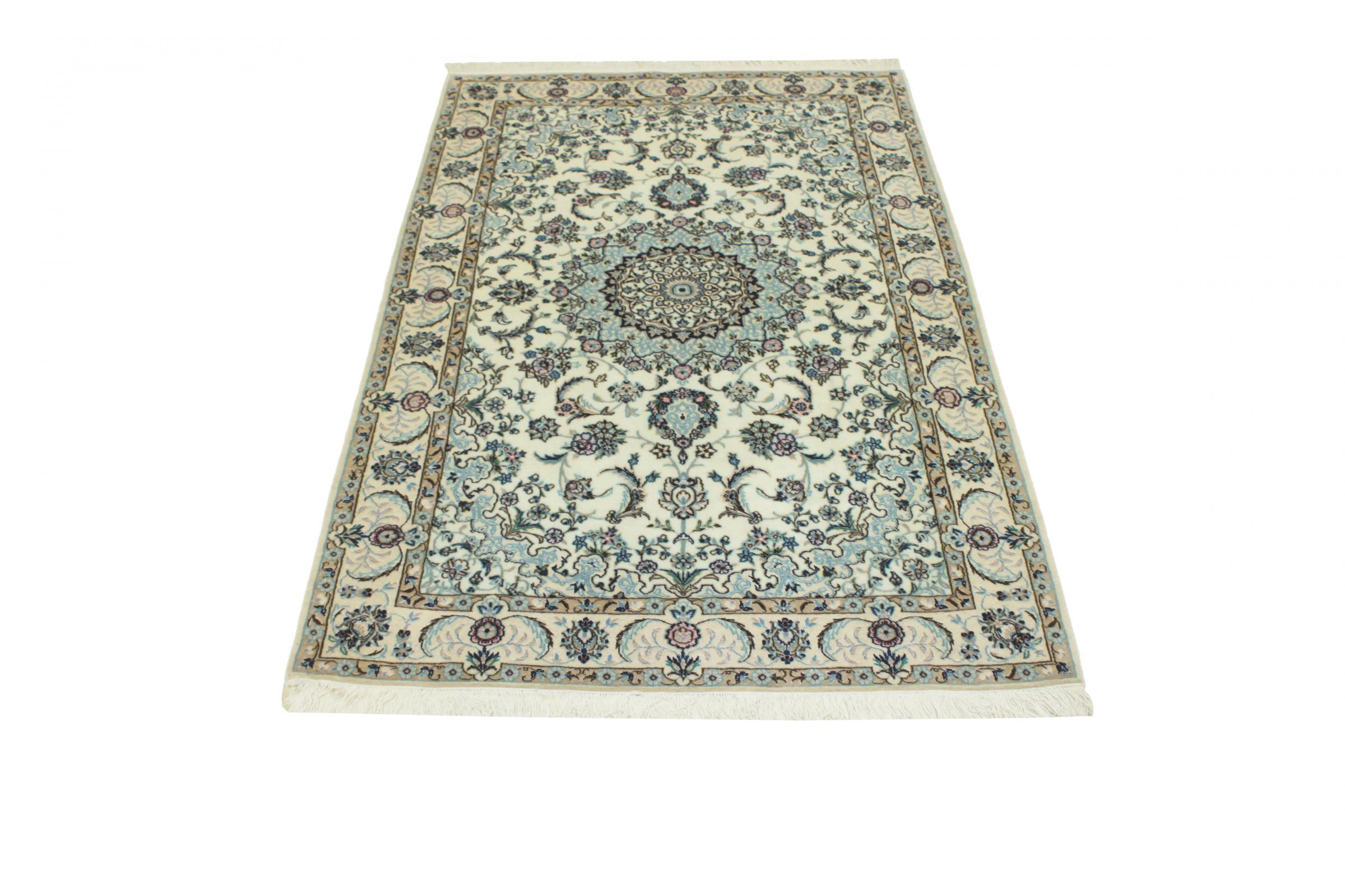 Les tapis de la ville de Nain, à la frontière de l'un des plus grands déserts d'Iran, comptent parmi les plus célèbres tapis persans du monde. Leur design typique est sans équivoque avec des ornements floraux, un médaillon central et des nuances de beige et de rouge ou de bleu. Grâce à leurs désignations 4La, 6La, 9La et 12La, les finesses d'un tapis Nain peuvent être vues d'un seul coup d'œil. Plus le chiffre "La" est bas, plus la densité des nœuds est élevée et donc plus le tapis est fin.