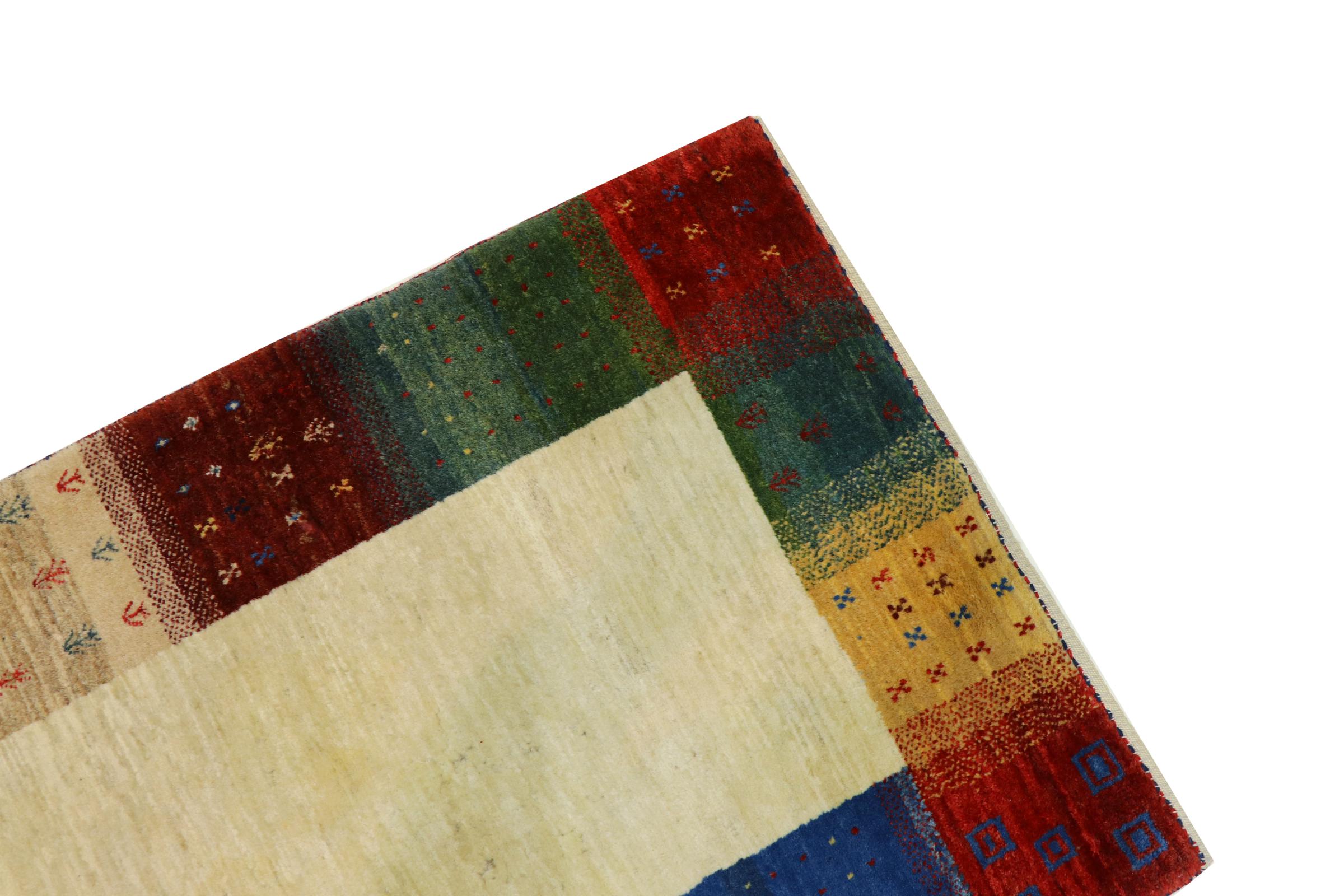 Ce magnifique tapis est un Gabbeh persan et fait donc partie des tapis Gabbeh de la plus haute qualité. Les tapis sont noués par des nomades ou des semi-nomades en Iran selon un savoir-faire traditionnel. Les motifs simples sont pour la plupart inspirés par l'environnement local des nomades. Par exemple, on peut trouver des chameaux, des arbres ou des buissons sur les tapis traditionnels. Les tapis de Gabbeh persan sont faits de laine provenant de troupeaux de moutons élevés localement. La laine est donc encore en grande partie filée à la main. Ainsi, chacun de ces tapis orientaux incarne un caractère unique de culture ancienne.